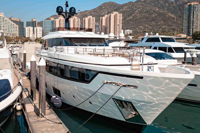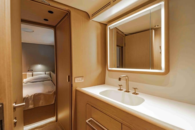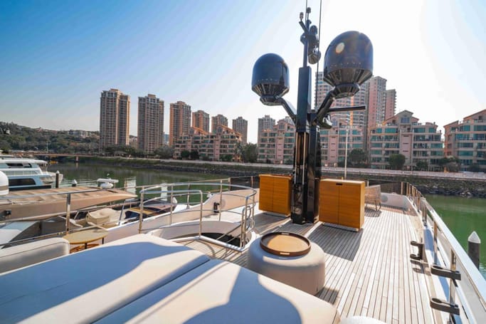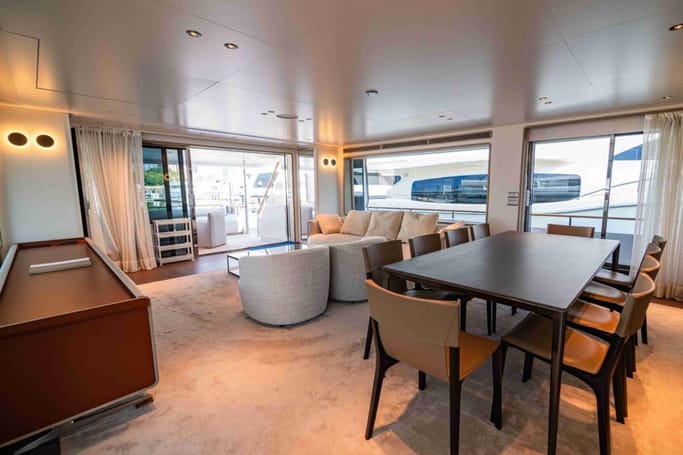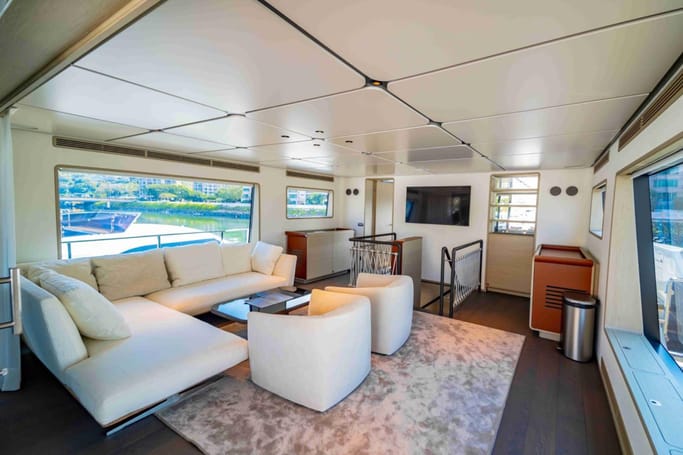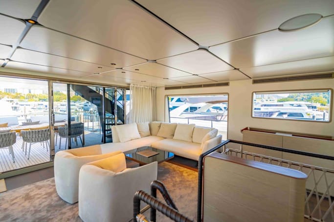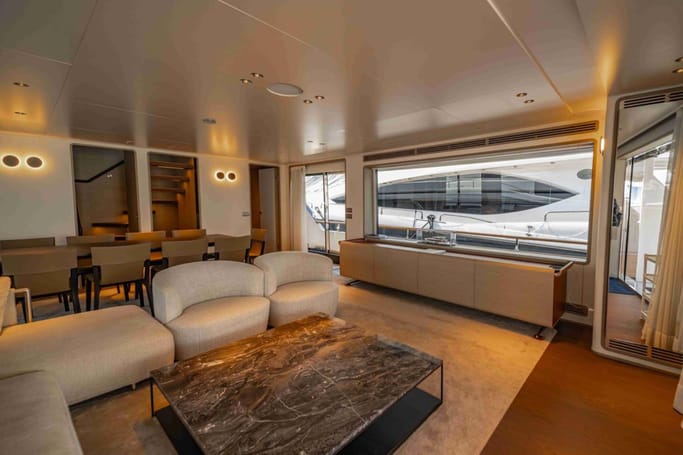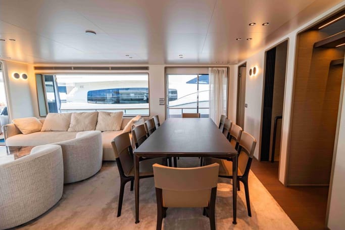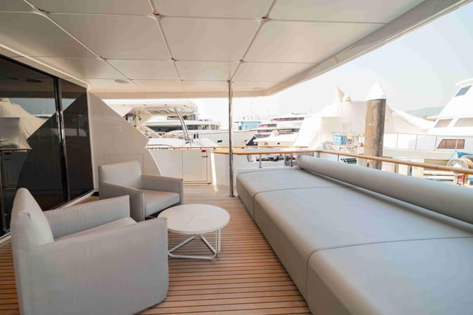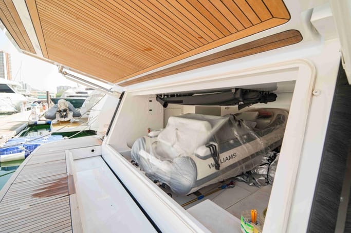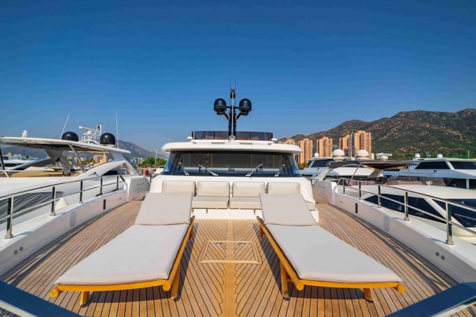 The Navetta 30 features advanced technology including zero-speed stabilizers, and soundproofing for optimal comfort. It also includes a beach club with hydraulic swim platform, bow lounging area, and garage for tenders.