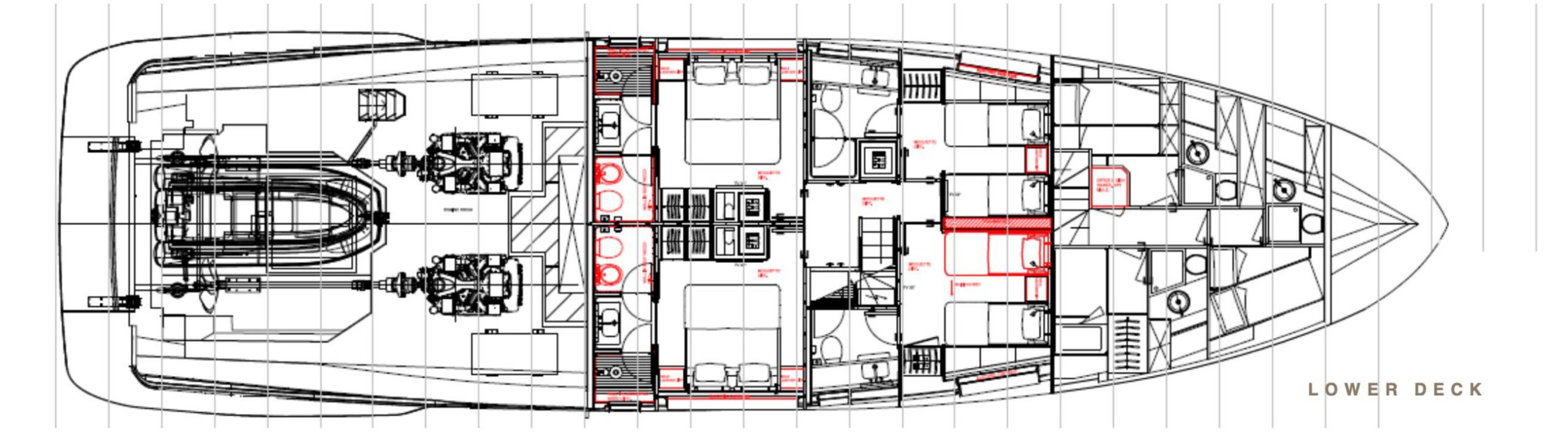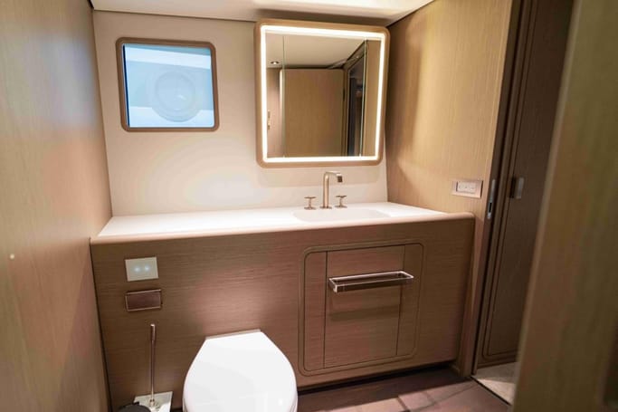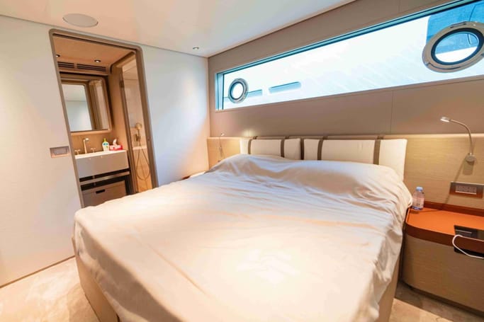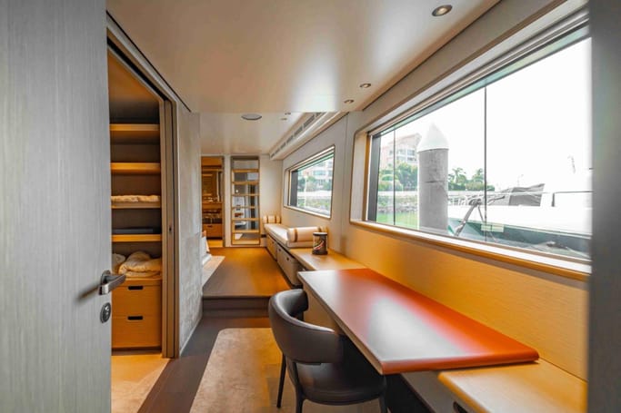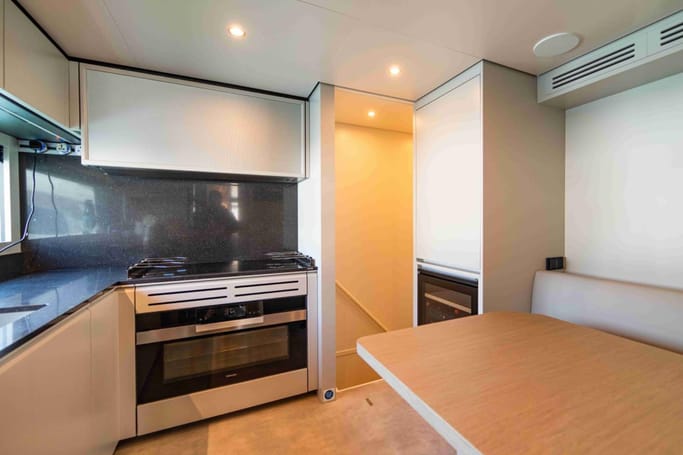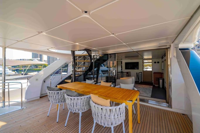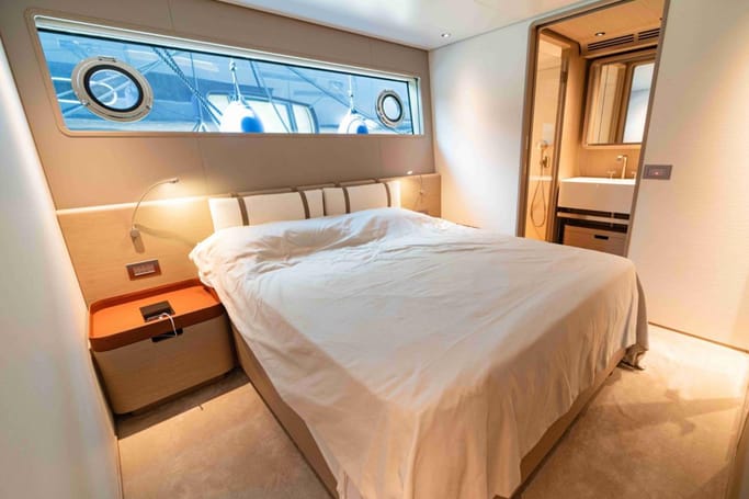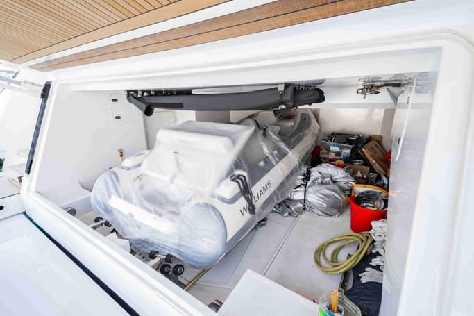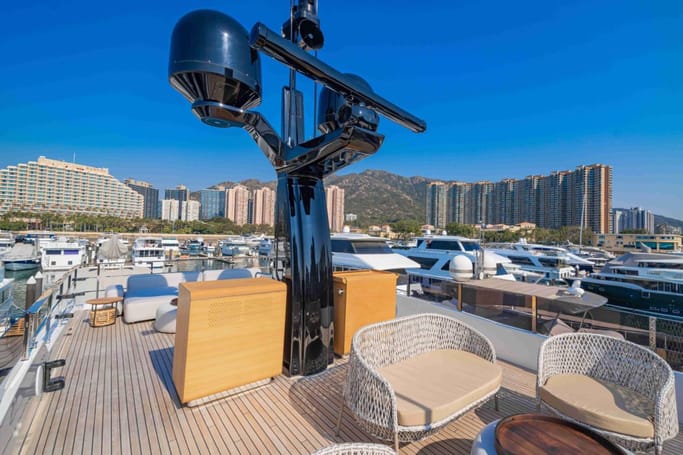 The Navetta 30 features advanced technology including zero-speed stabilizers, and soundproofing for optimal comfort. It also includes a beach club with hydraulic swim platform, bow lounging area, and garage for tenders.