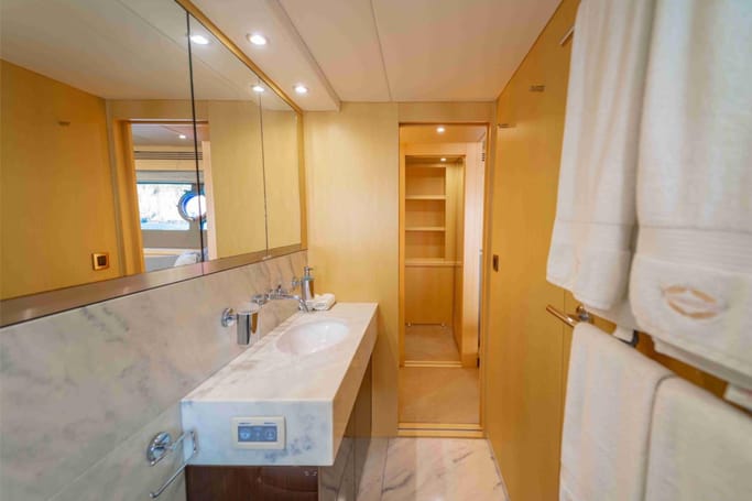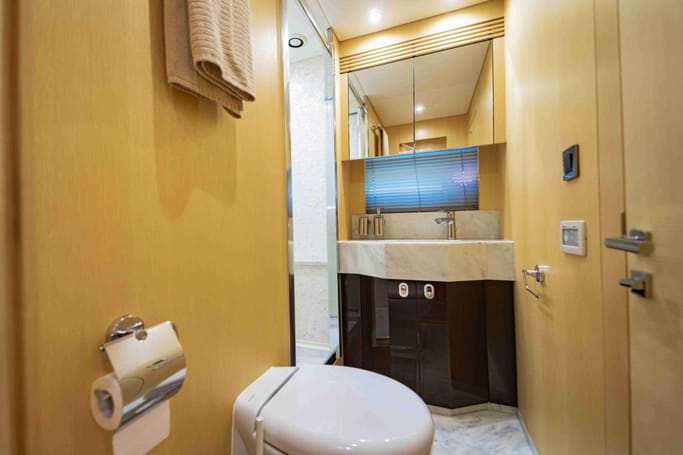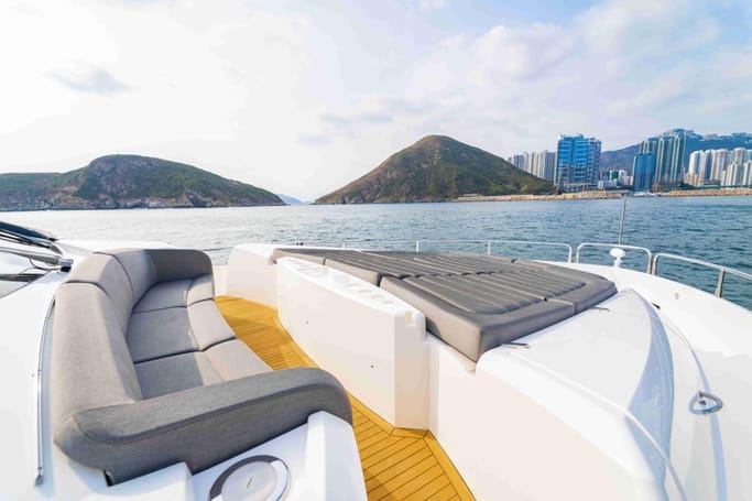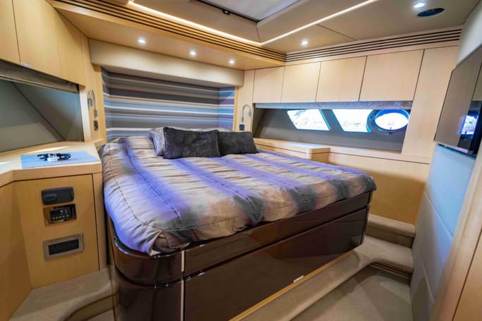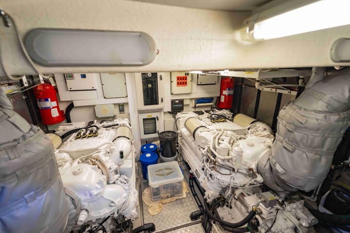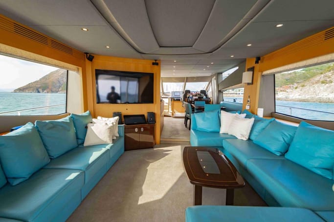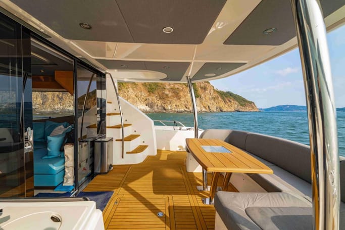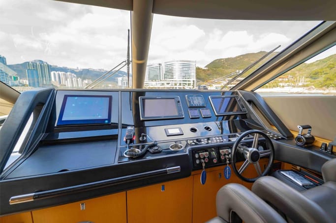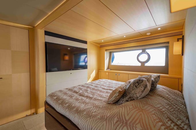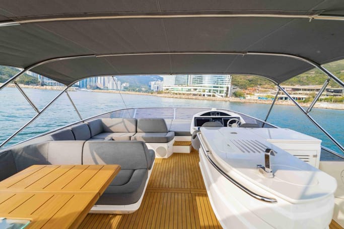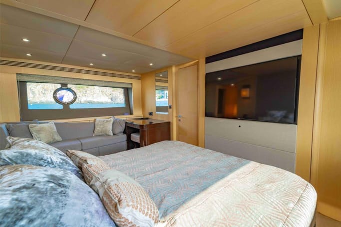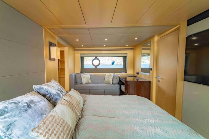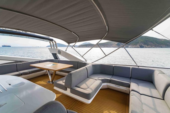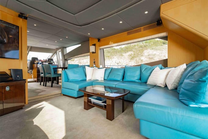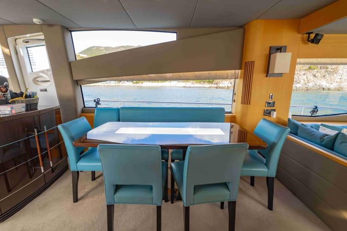 Highly versatile, the yacht features a spacious flybridge complete with a bar, comfortable seating, and sunbeds, perfect for soaking up the sun while enjoying breathtaking ocean views. The meticulously crafted interior offers a flowing layout that separates the leisure area from a sophisticated dining space, complemented by a modern galley.