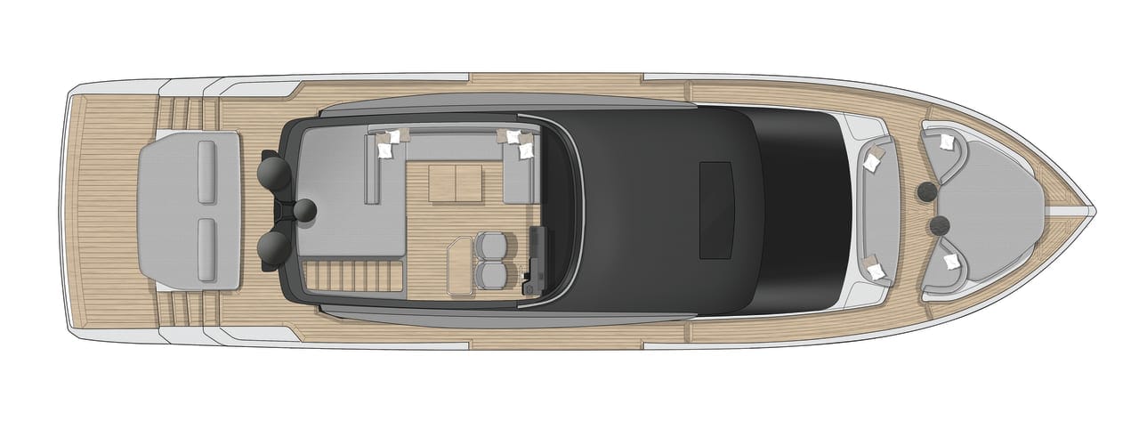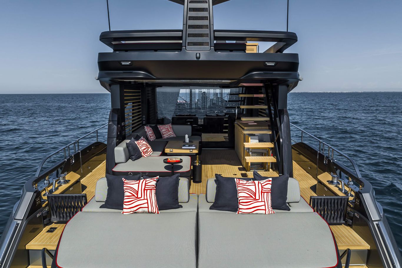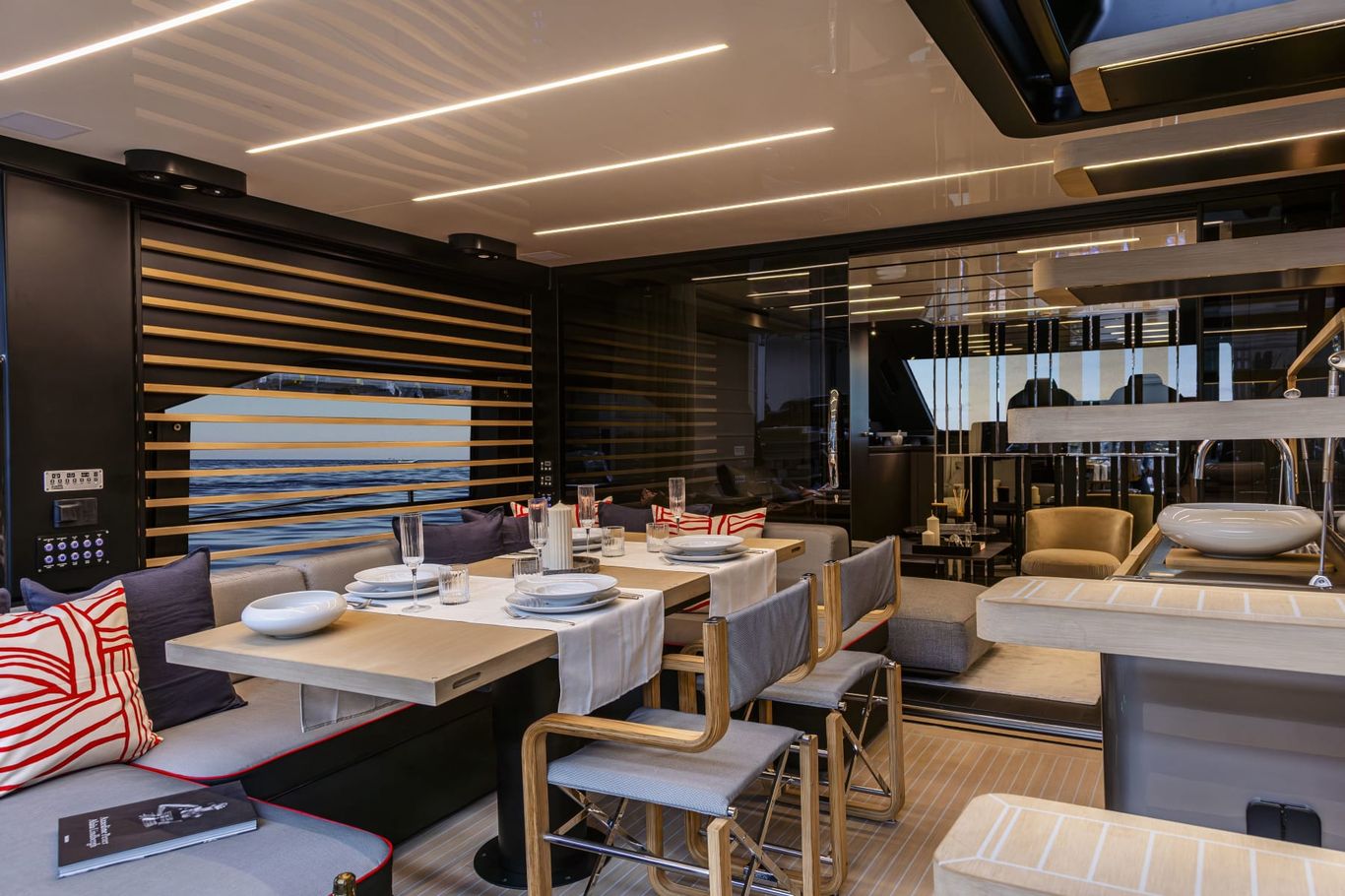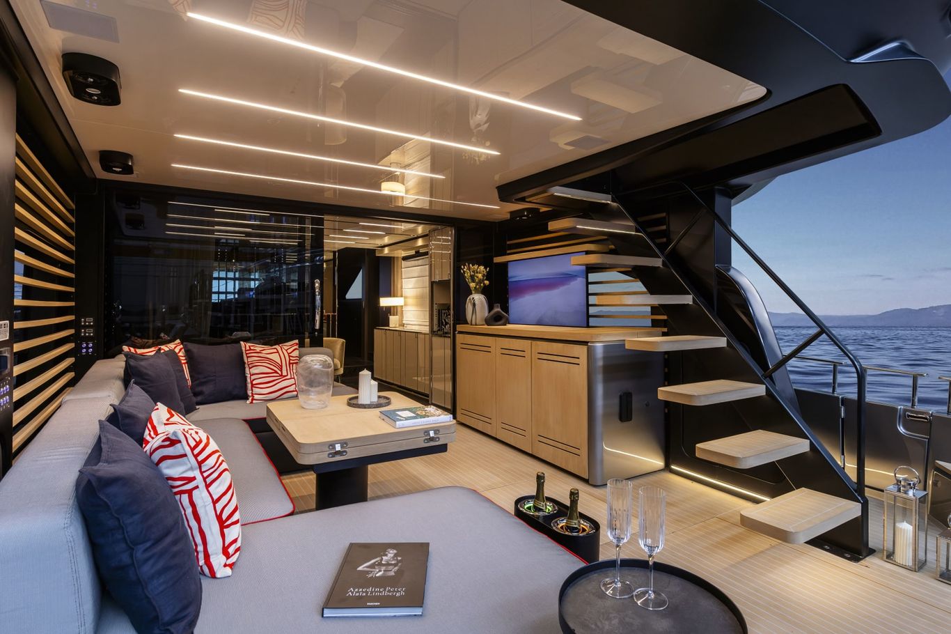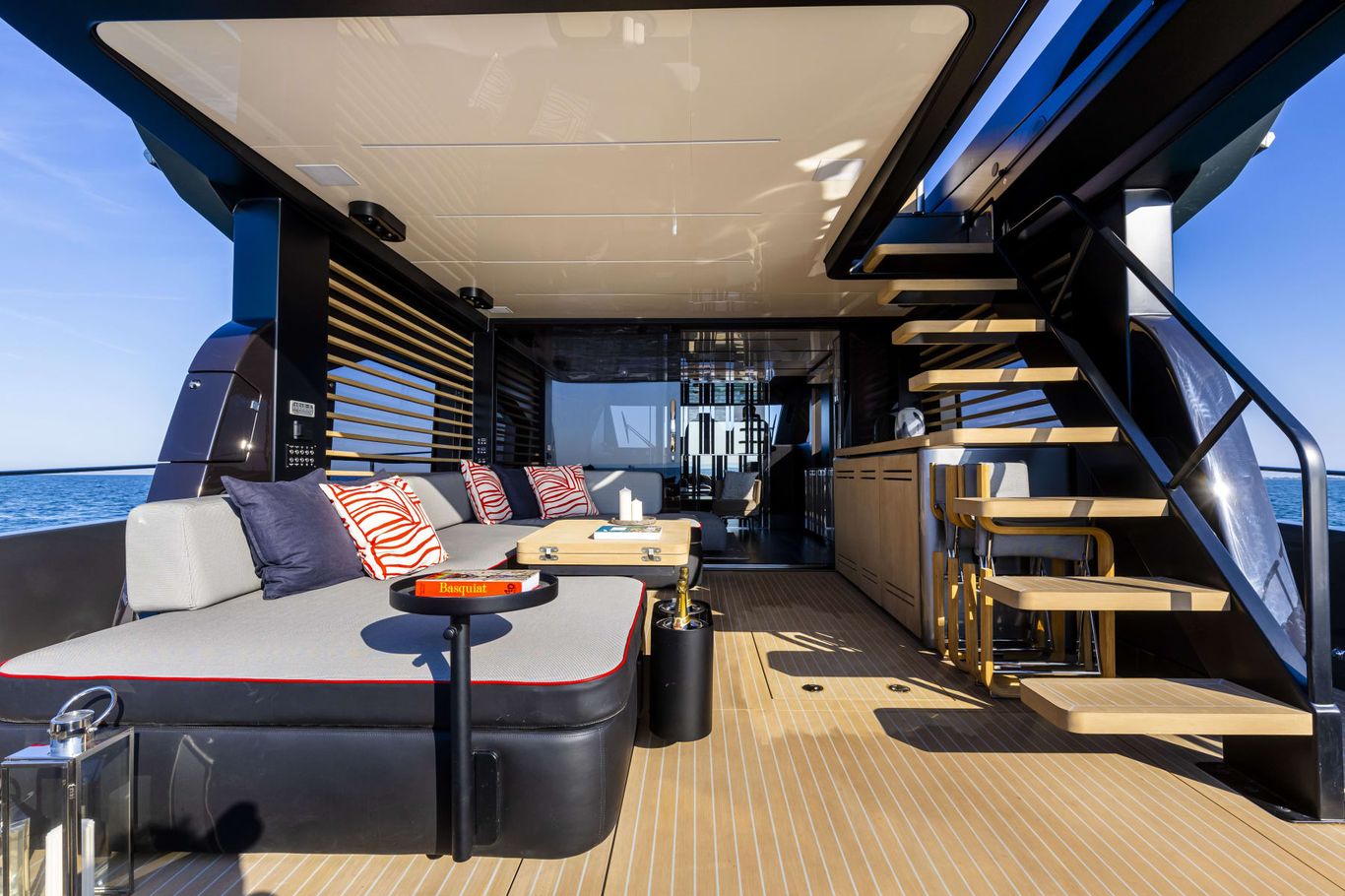 At the stern, the cockpit nestles beneath the upper deck, offering a deep, open space that frames uninterrupted views of the sea. Flanking this area, two expansive windows with electric openings play with light and shadow, enhancing the ambiance while naturally ventilating the space. This is the yacht’s emotional heart—a generous, Mediterranean-inspired outdoor lounge that beckons guests to embrace the open-air lifestyle.