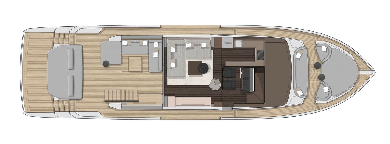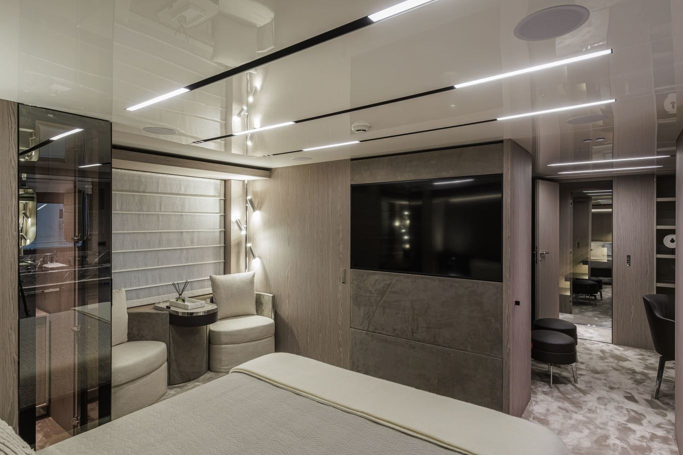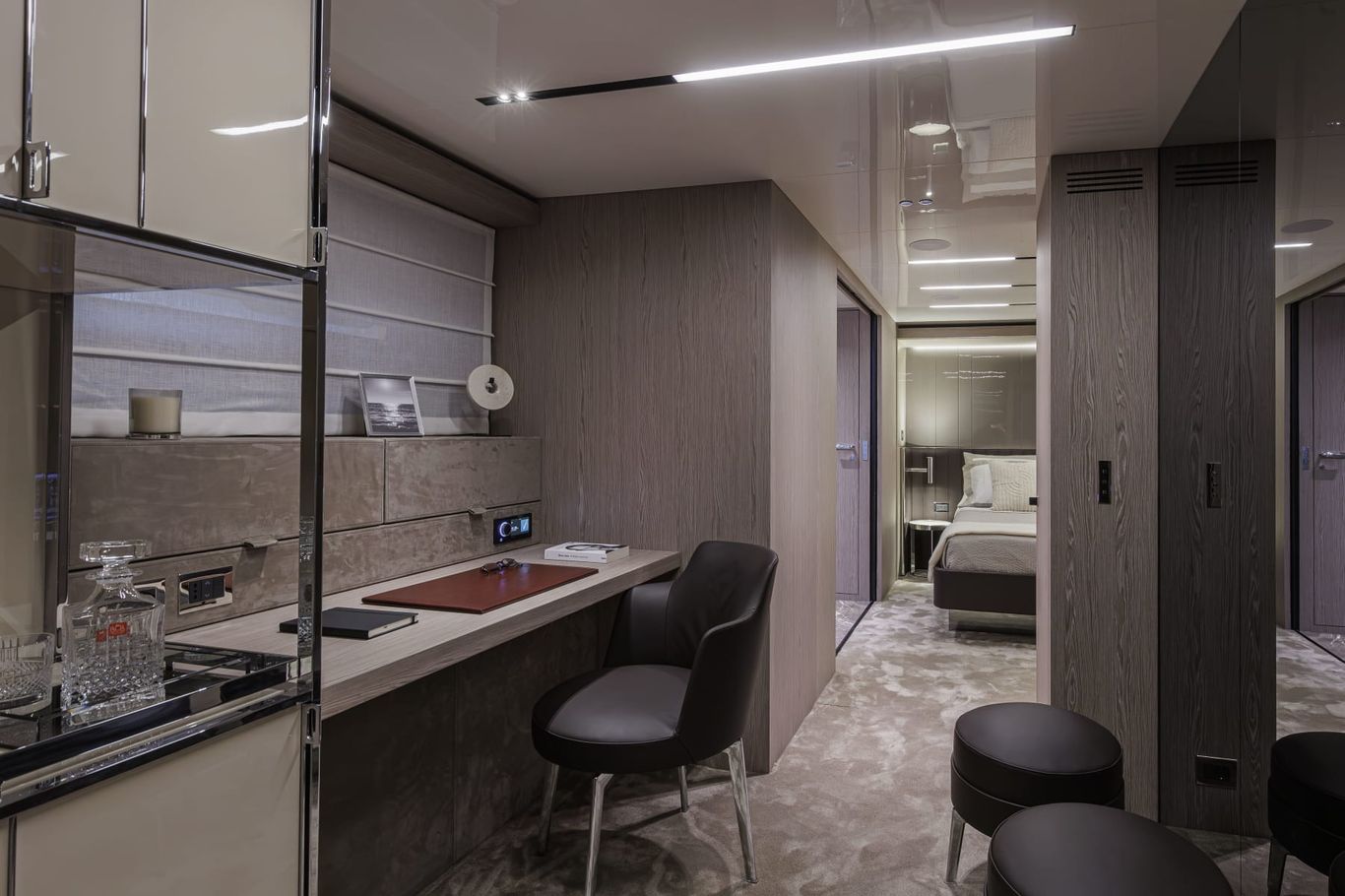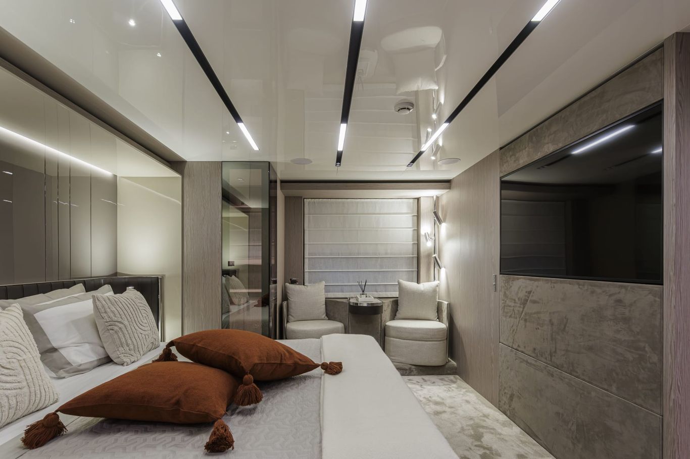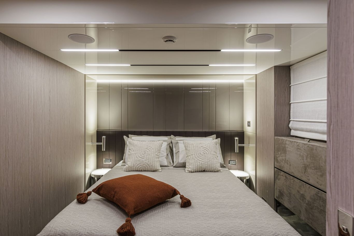 At the stern, the cockpit nestles beneath the upper deck, offering a deep, open space that frames uninterrupted views of the sea. Flanking this area, two expansive windows with electric openings play with light and shadow, enhancing the ambiance while naturally ventilating the space. This is the yacht’s emotional heart—a generous, Mediterranean-inspired outdoor lounge that beckons guests to embrace the open-air lifestyle.