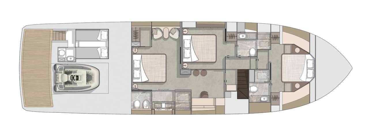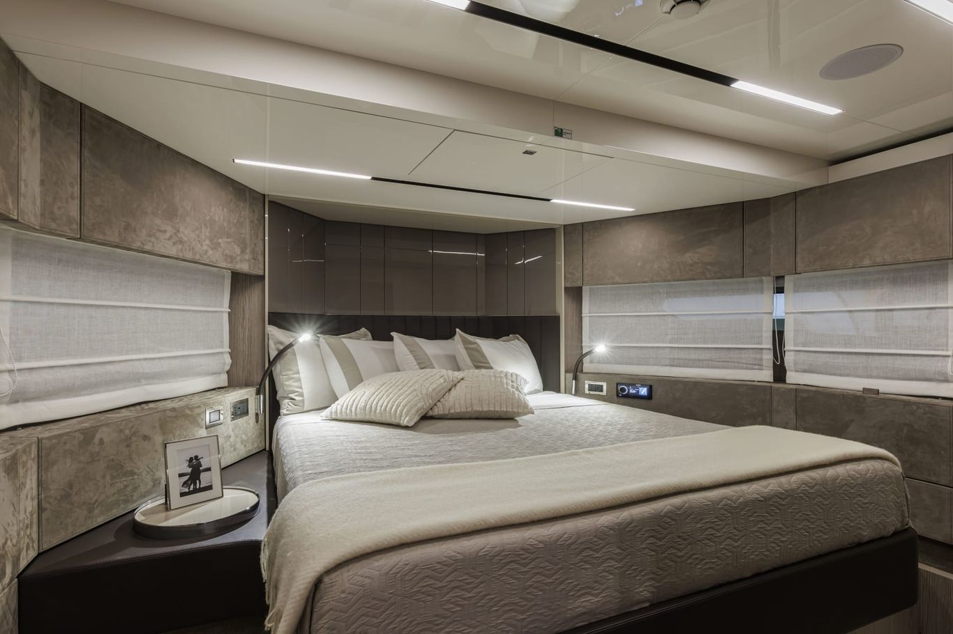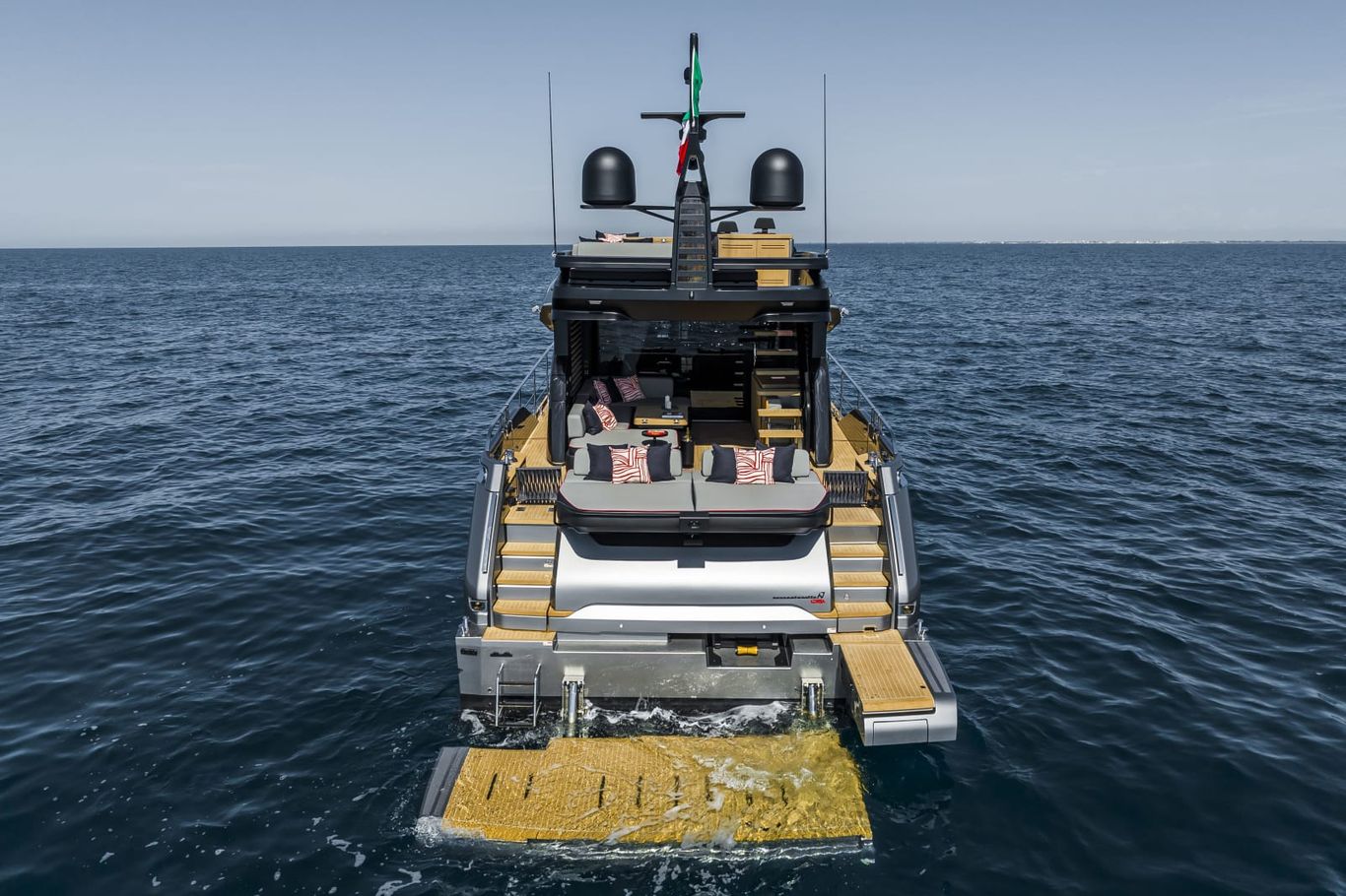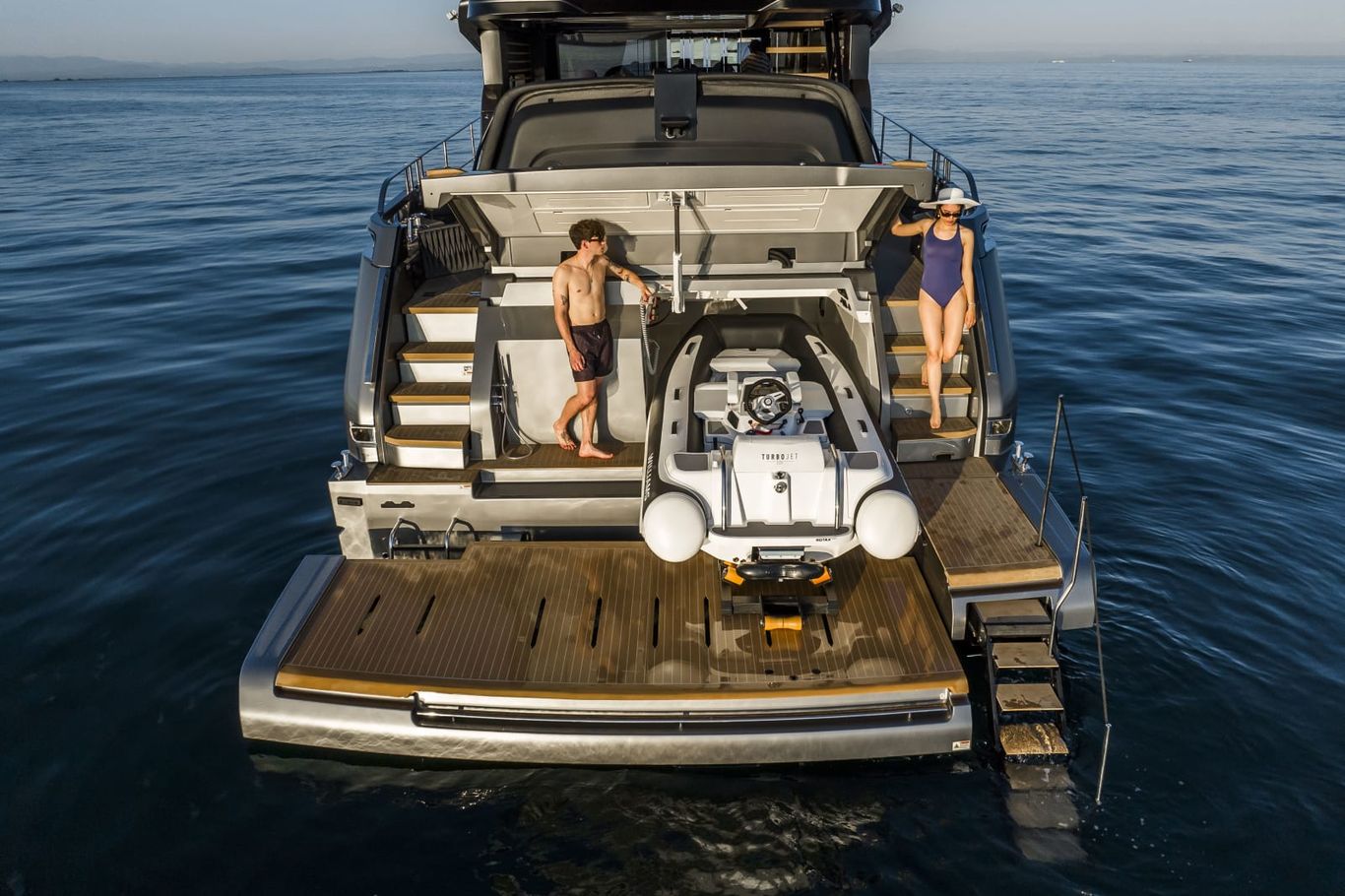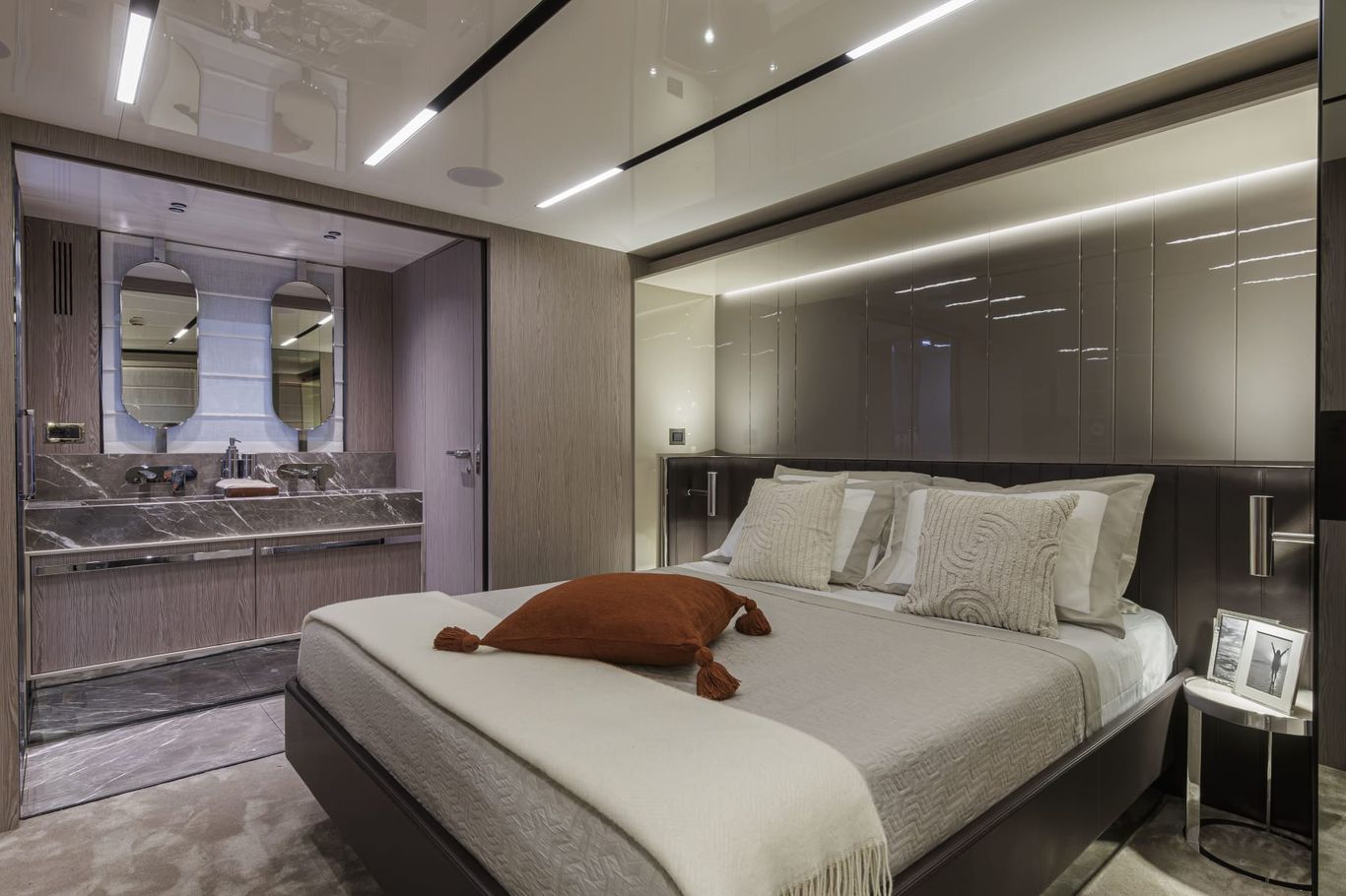 At the stern, the cockpit nestles beneath the upper deck, offering a deep, open space that frames uninterrupted views of the sea. Flanking this area, two expansive windows with electric openings play with light and shadow, enhancing the ambiance while naturally ventilating the space. This is the yacht’s emotional heart—a generous, Mediterranean-inspired outdoor lounge that beckons guests to embrace the open-air lifestyle.
