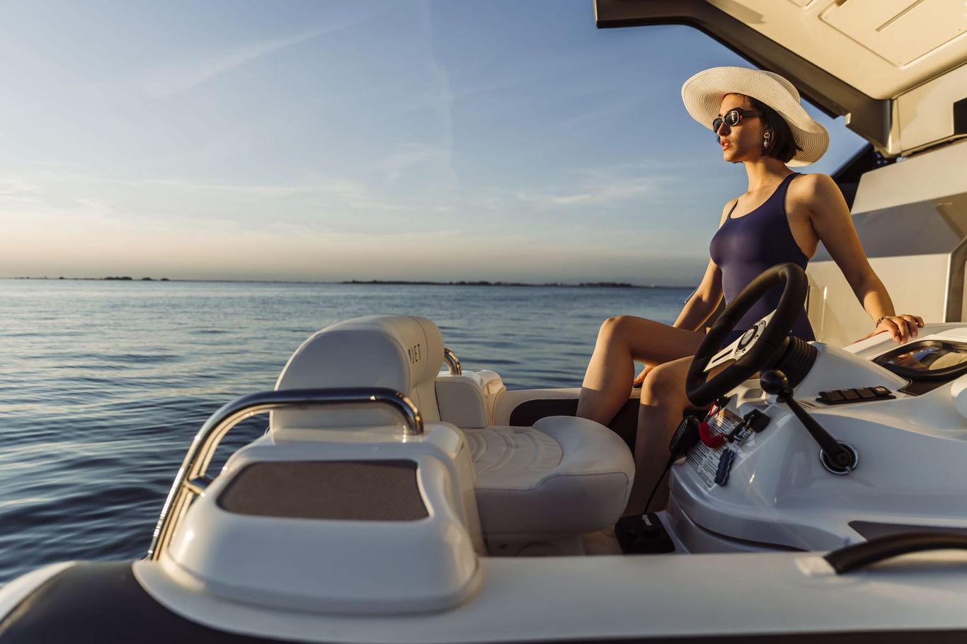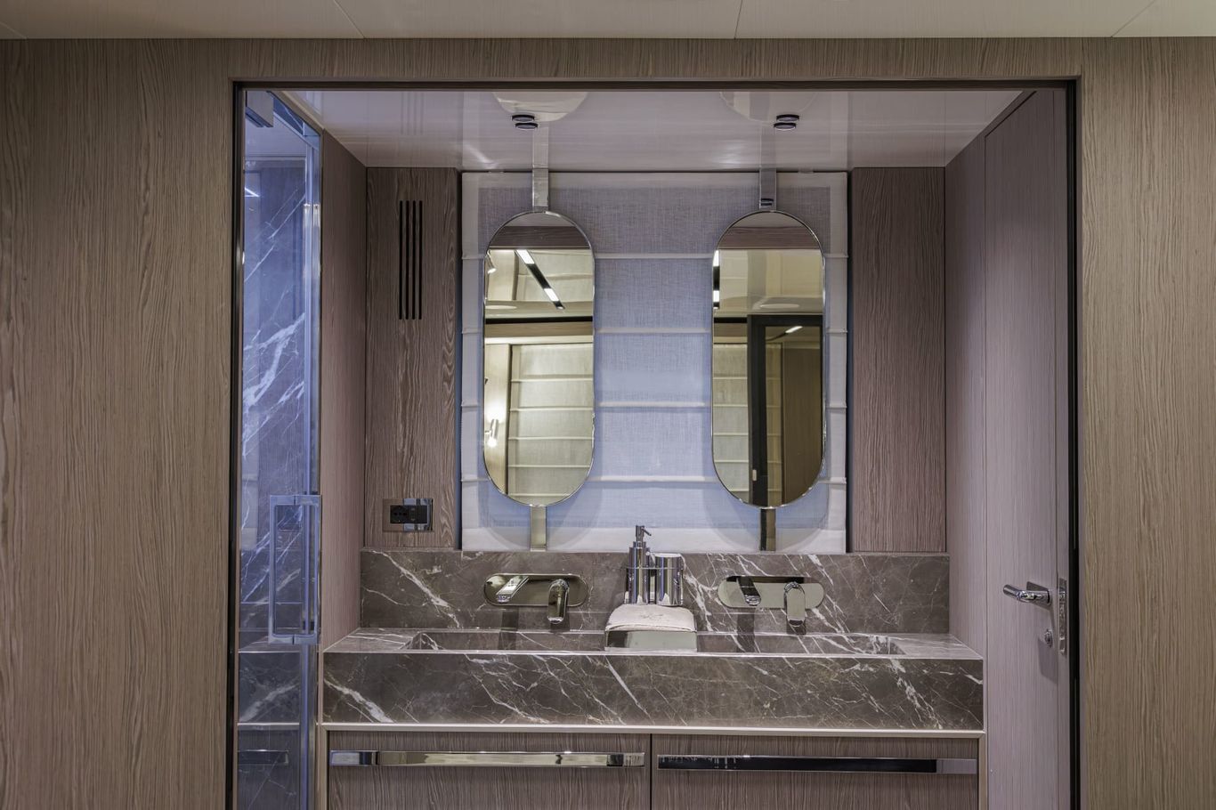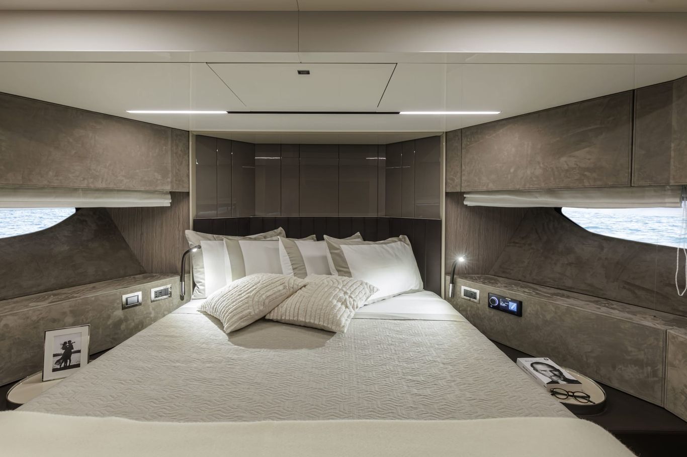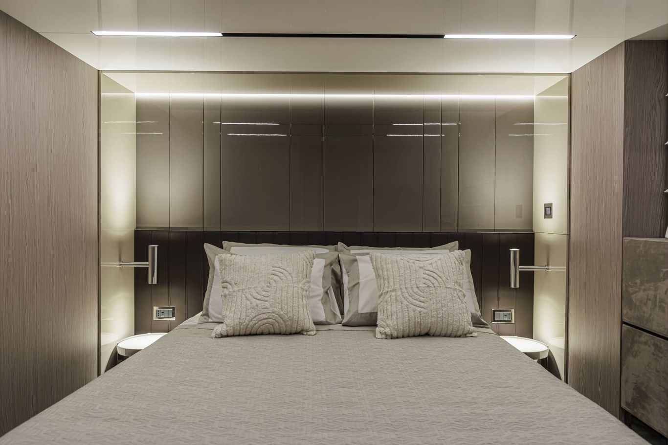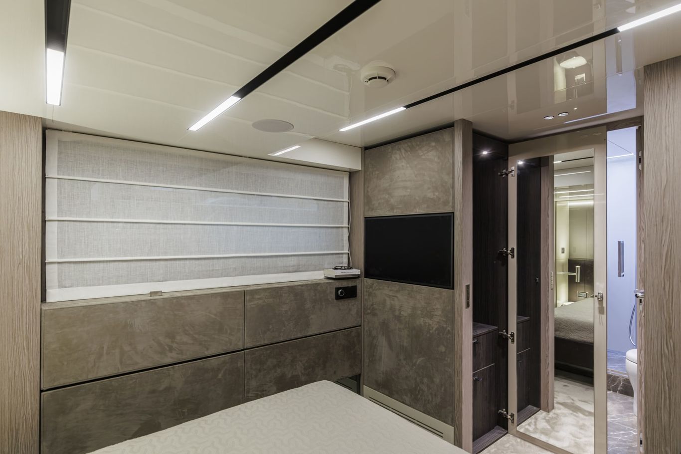 At the stern, the cockpit nestles beneath the upper deck, offering a deep, open space that frames uninterrupted views of the sea. Flanking this area, two expansive windows with electric openings play with light and shadow, enhancing the ambiance while naturally ventilating the space. This is the yacht’s emotional heart—a generous, Mediterranean-inspired outdoor lounge that beckons guests to embrace the open-air lifestyle.