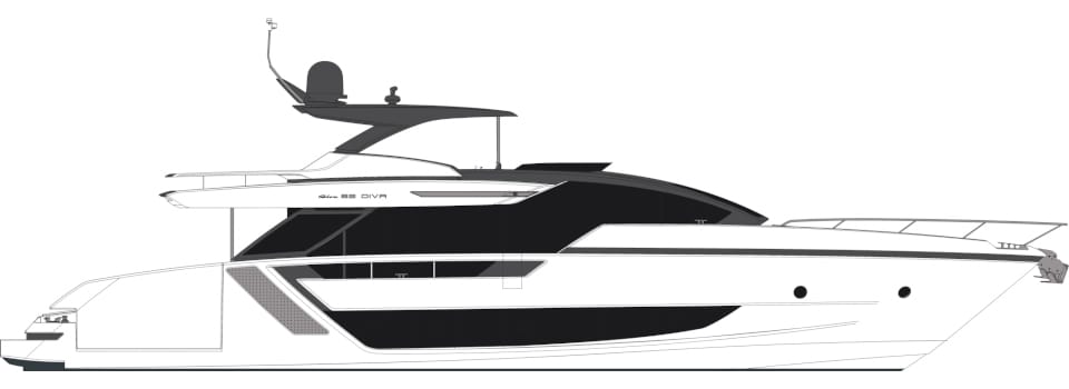 On the main deck, swing-down bulwarks increase the Diva’s width by 3 meters, while in the salon, the cockpit-level living space precedes the panoramic dining area. With an overall length of more than 25 meters and a maximum beam of over 6 meters, the 82’ Diva mixes Riva style with amazing spaces.
