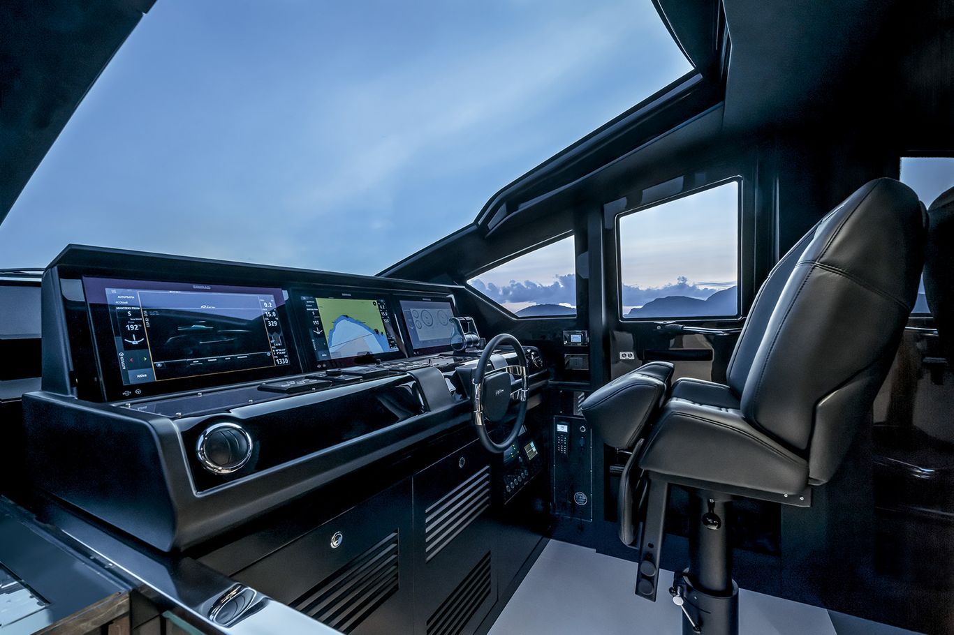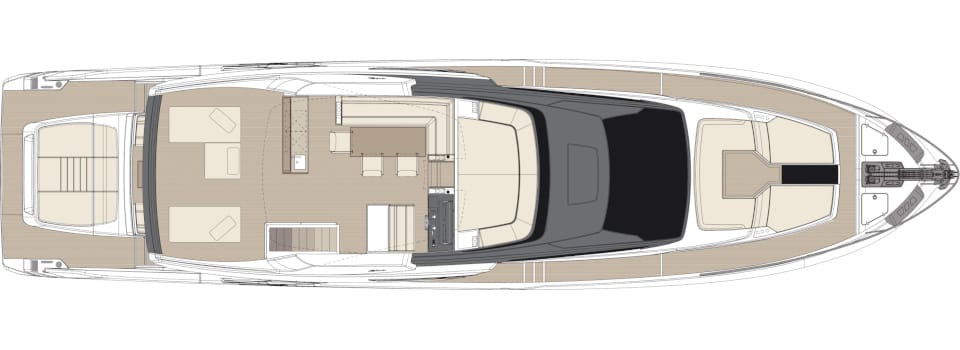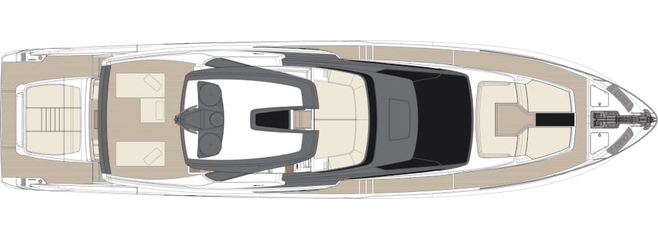 Riva’s new flybridge rethinks the concept of interior and exterior space. Here, each environment is masterfully designed to optimize its use of functionality, with the 40 m2 flybridge (one of the largest for this size of yacht), being a particular highlight.