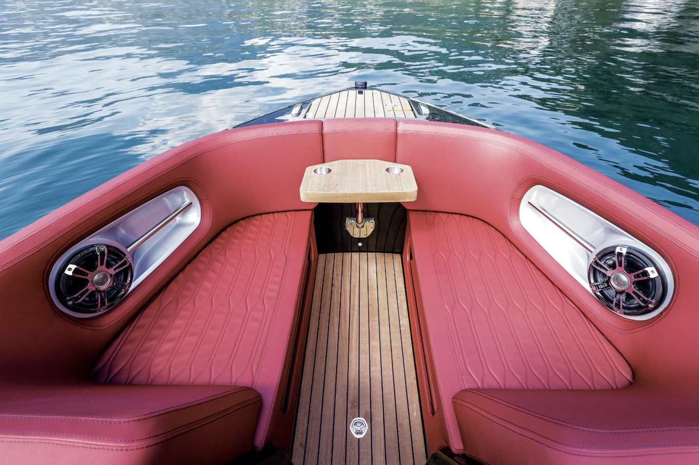 The bow deck comprises a lounge area with a floor on the same level as the cockpit. It can be easily and safely reached via an opening in the centre of the boat, even while the boat is moving. Two opposite facing sofas, on either wall, can be used either as seats or chaise-longues.