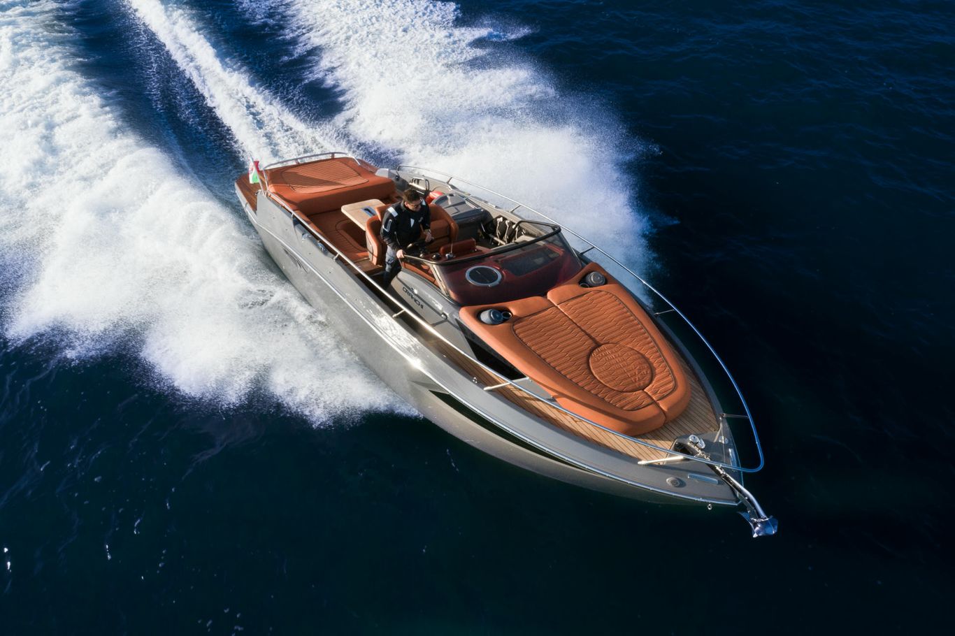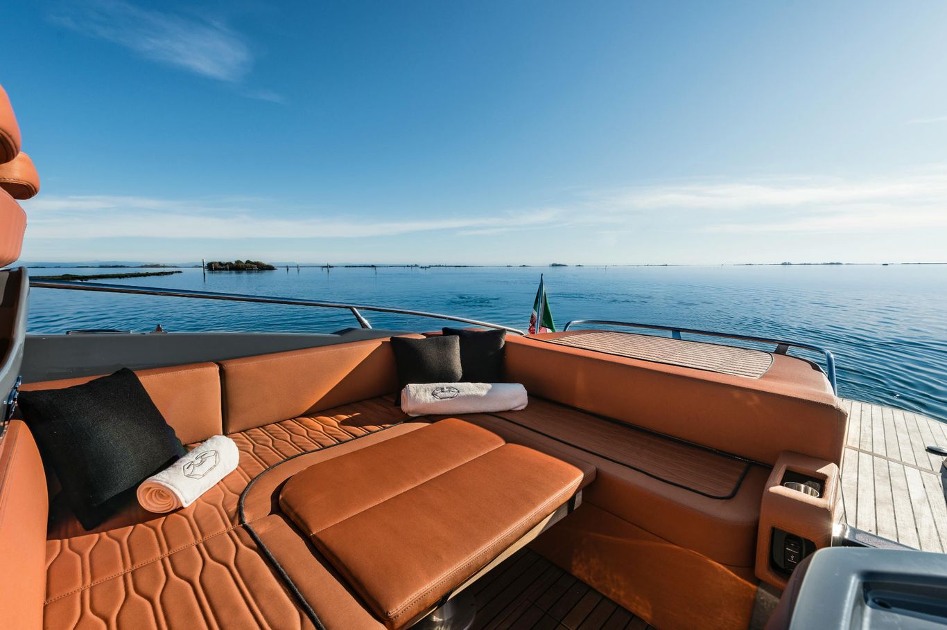 The sun decks on either side of the boat have also been redesigned, and made more comfortable, also thanks to the added cup holders and integrated loudspeakers. The table used for the large C-shaped sofa in the cockpit can be lowered thanks to an hydraulic servomechanism, to transform the seating area into another sun deck which is protected from the edges to make it extra safe, especially for children.