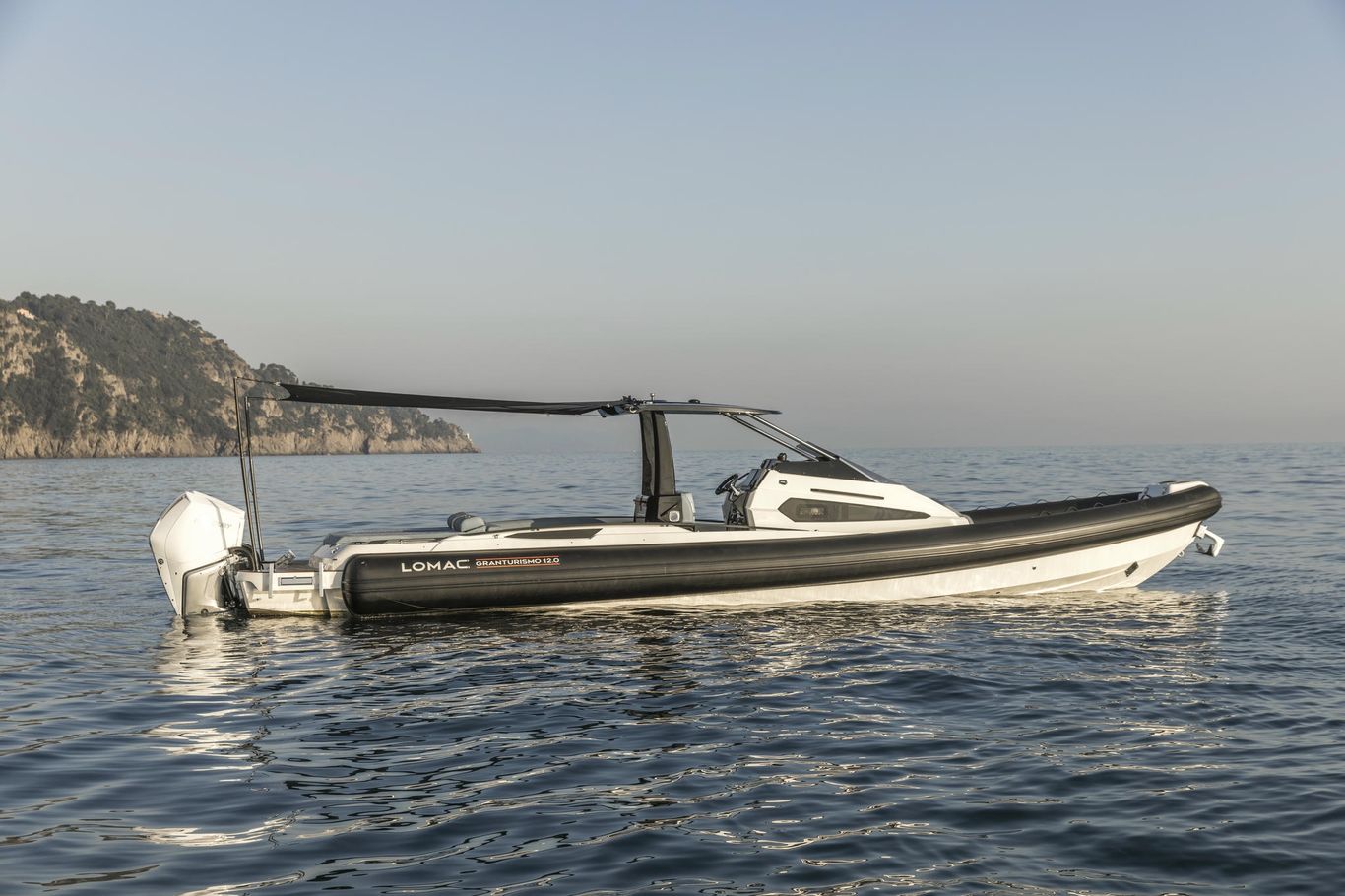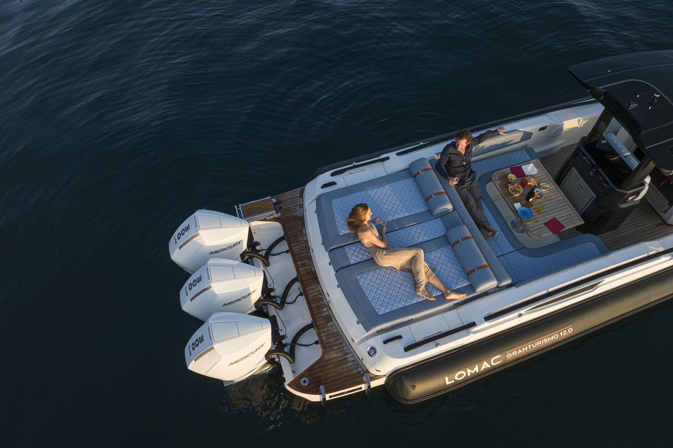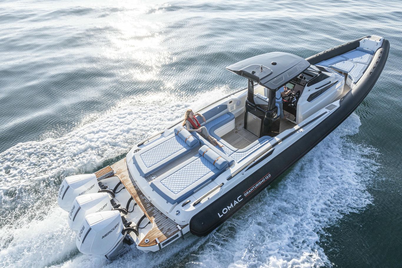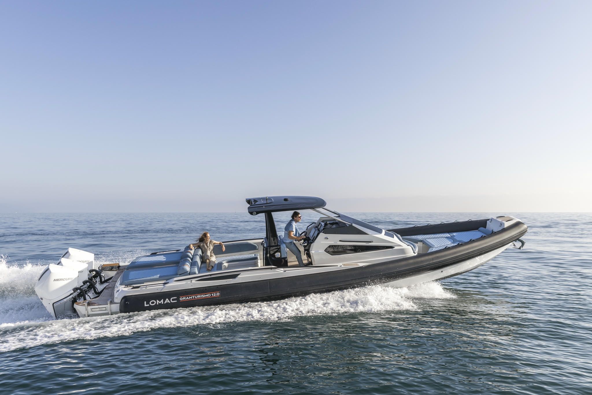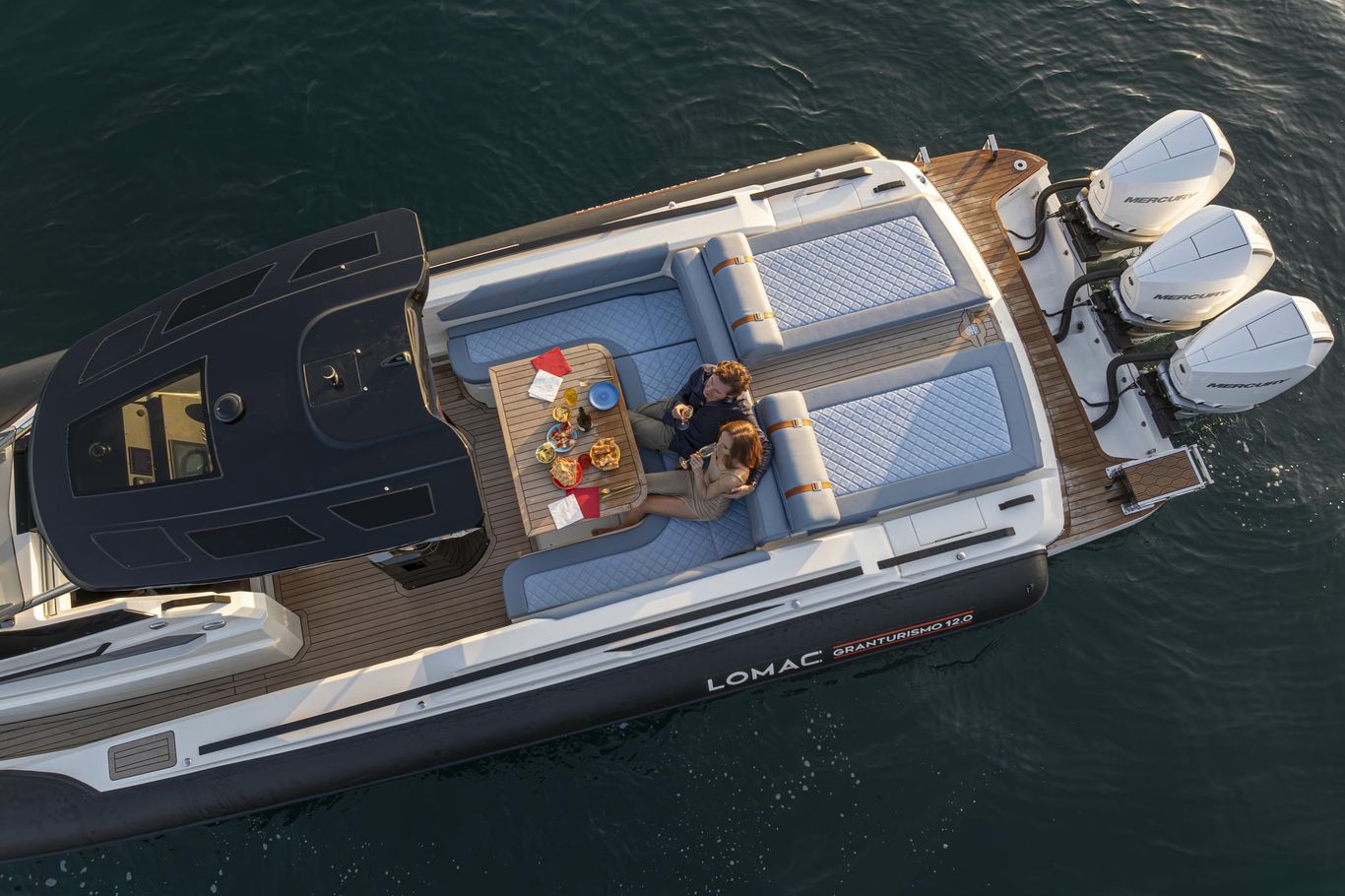 The GranTurismo line represents the peak of Lomac’s boat collection, born from three years of R&D aimed at balancing design, comfort, and performance. Its exclusivity shines through in fine details, material selection, and customization options. The build relies on CFD-optimized hulls, vacuum infusion lamination with vinyl ester resin, neopentyl gelcoat, and aramid fibers reinforcing the T-top, deck, and hull. Styled entirely in Milan by Federico Fiorentino, this maxi-rib is also an ideal luxury tender—and it’s simply unbeatable.