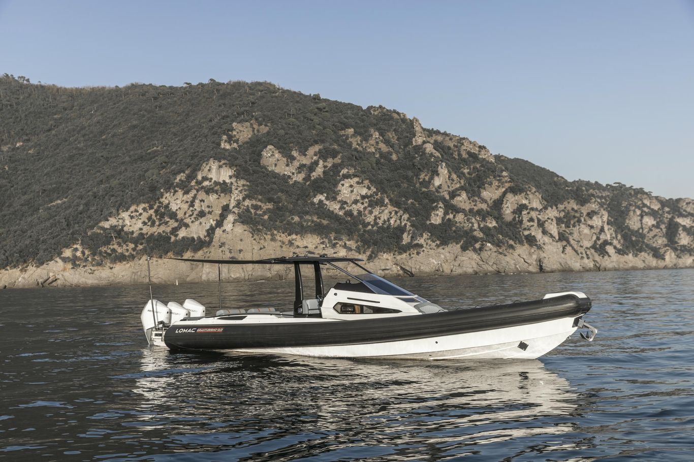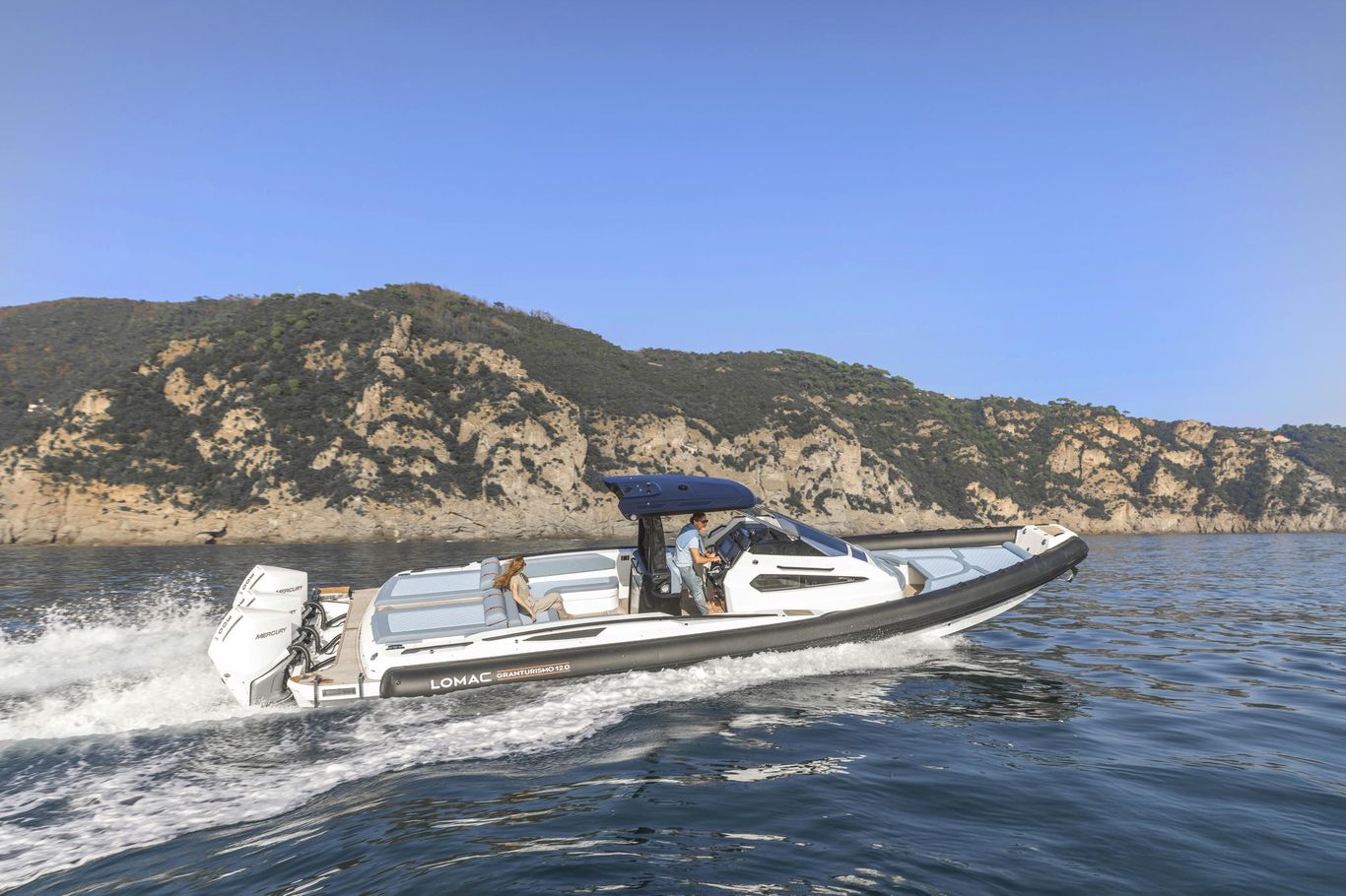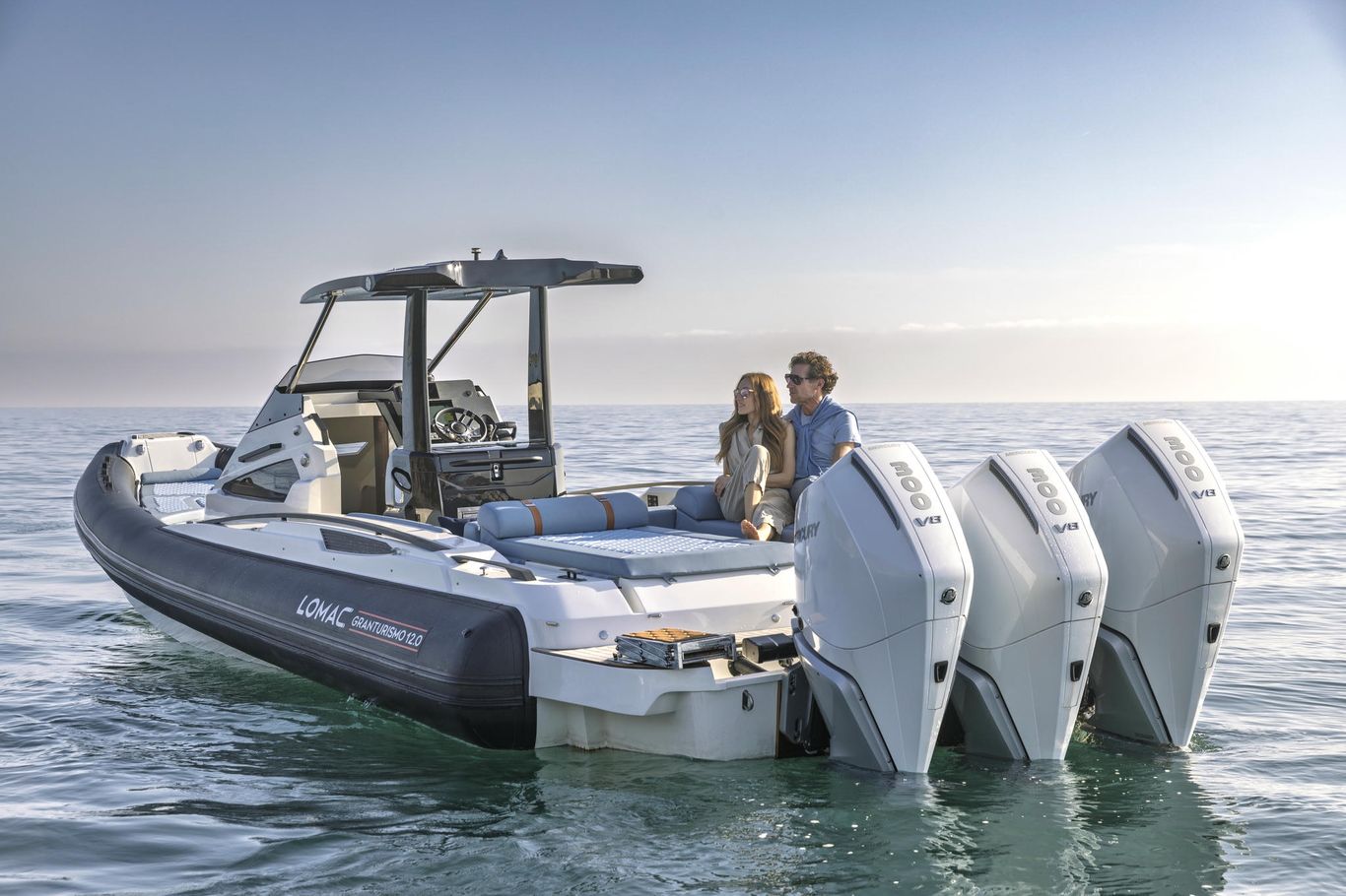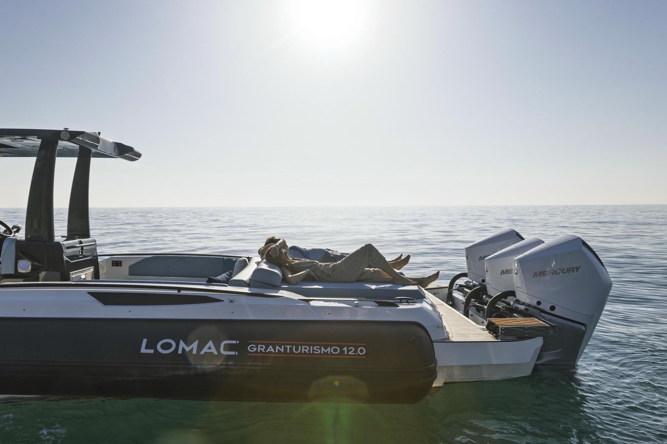 The GranTurismo line represents the peak of Lomac’s boat collection, born from three years of R&D aimed at balancing design, comfort, and performance. Its exclusivity shines through in fine details, material selection, and customization options. The build relies on CFD-optimized hulls, vacuum infusion lamination with vinyl ester resin, neopentyl gelcoat, and aramid fibers reinforcing the T-top, deck, and hull. Styled entirely in Milan by Federico Fiorentino, this maxi-rib is also an ideal luxury tender—and it’s simply unbeatable.