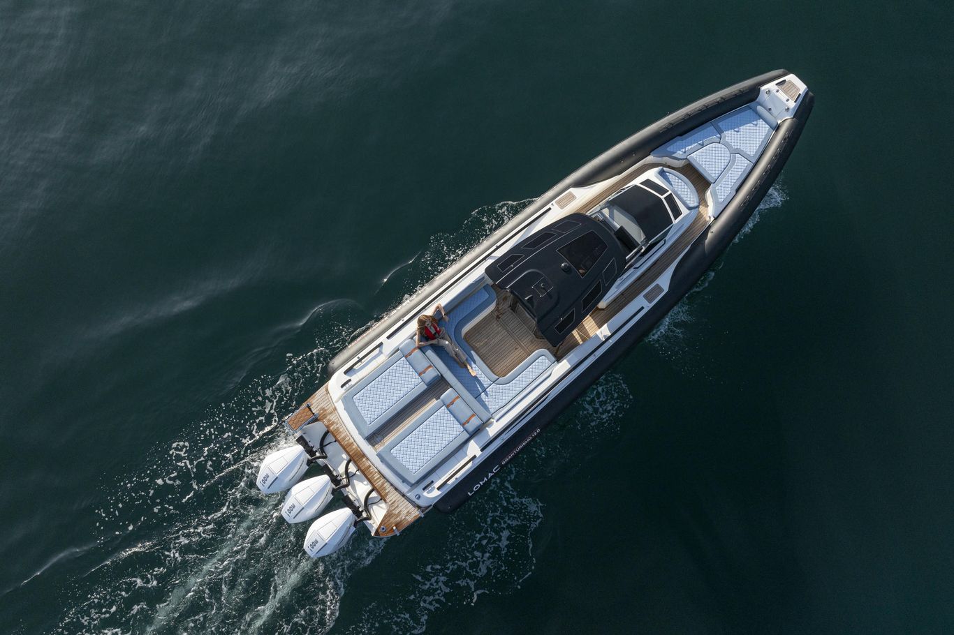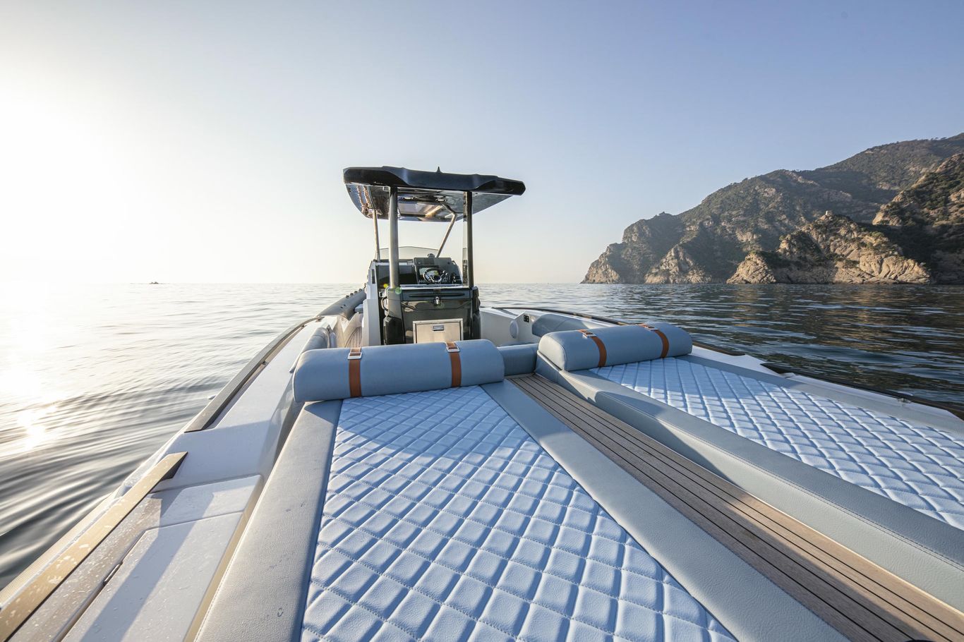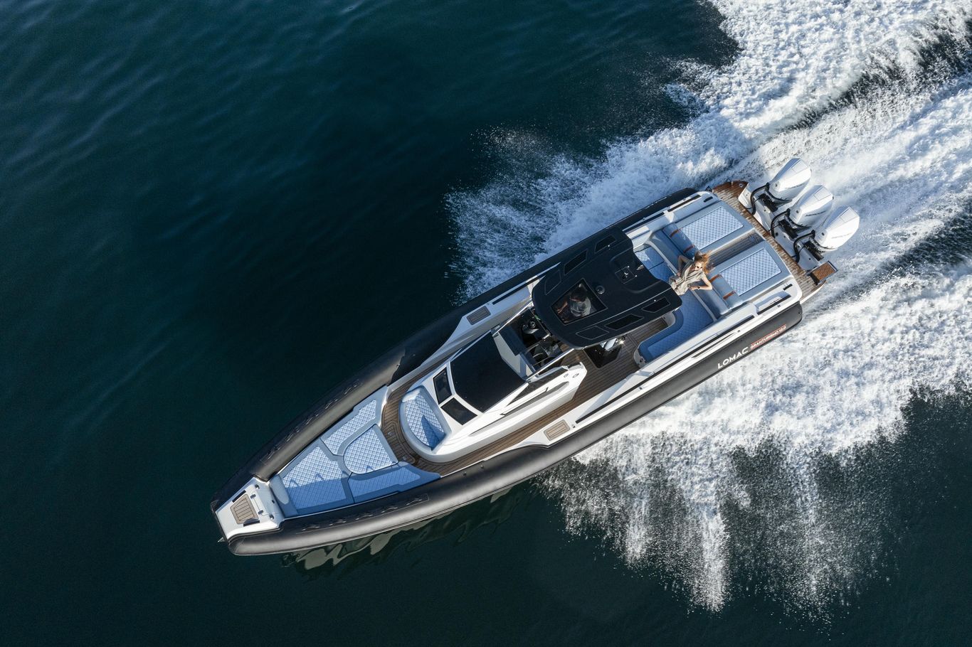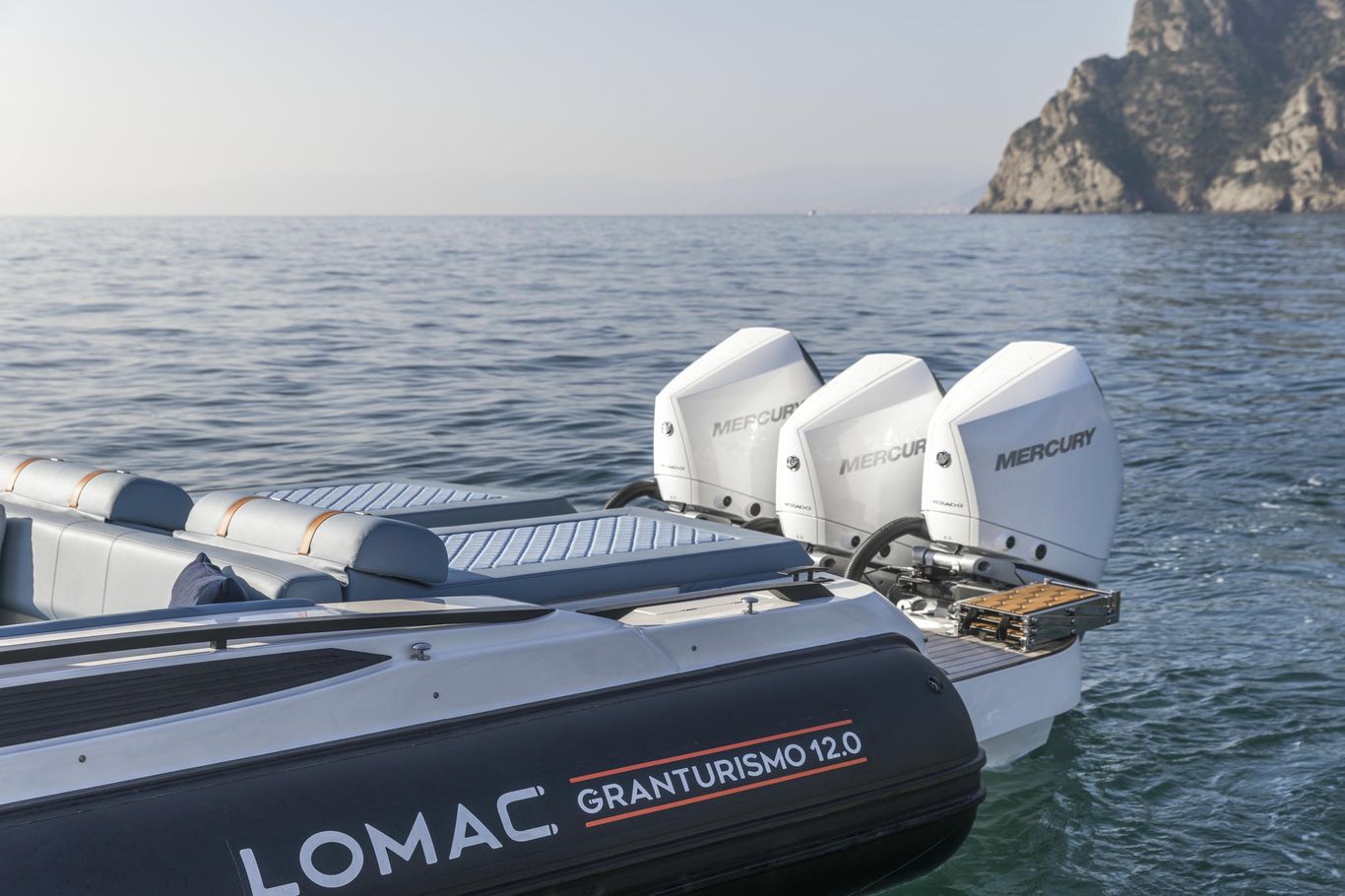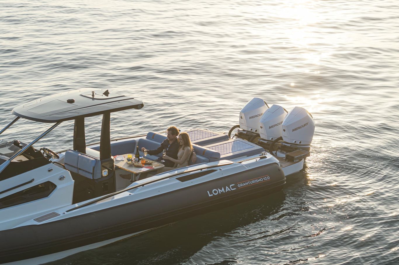 The GranTurismo line represents the peak of Lomac’s boat collection, born from three years of R&D aimed at balancing design, comfort, and performance. Its exclusivity shines through in fine details, material selection, and customization options. The build relies on CFD-optimized hulls, vacuum infusion lamination with vinyl ester resin, neopentyl gelcoat, and aramid fibers reinforcing the T-top, deck, and hull. Styled entirely in Milan by Federico Fiorentino, this maxi-rib is also an ideal luxury tender—and it’s simply unbeatable.