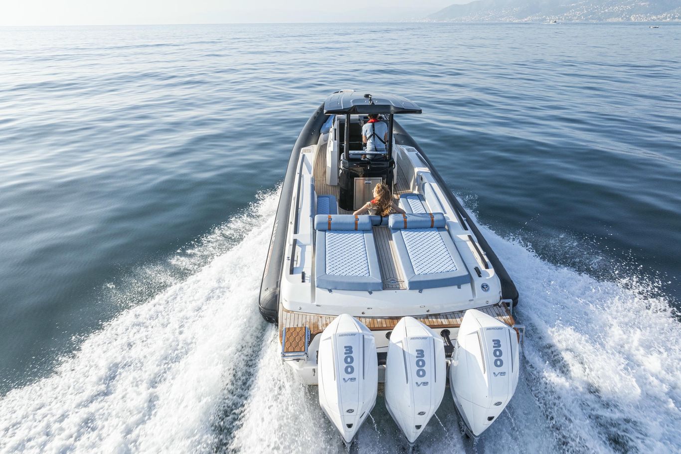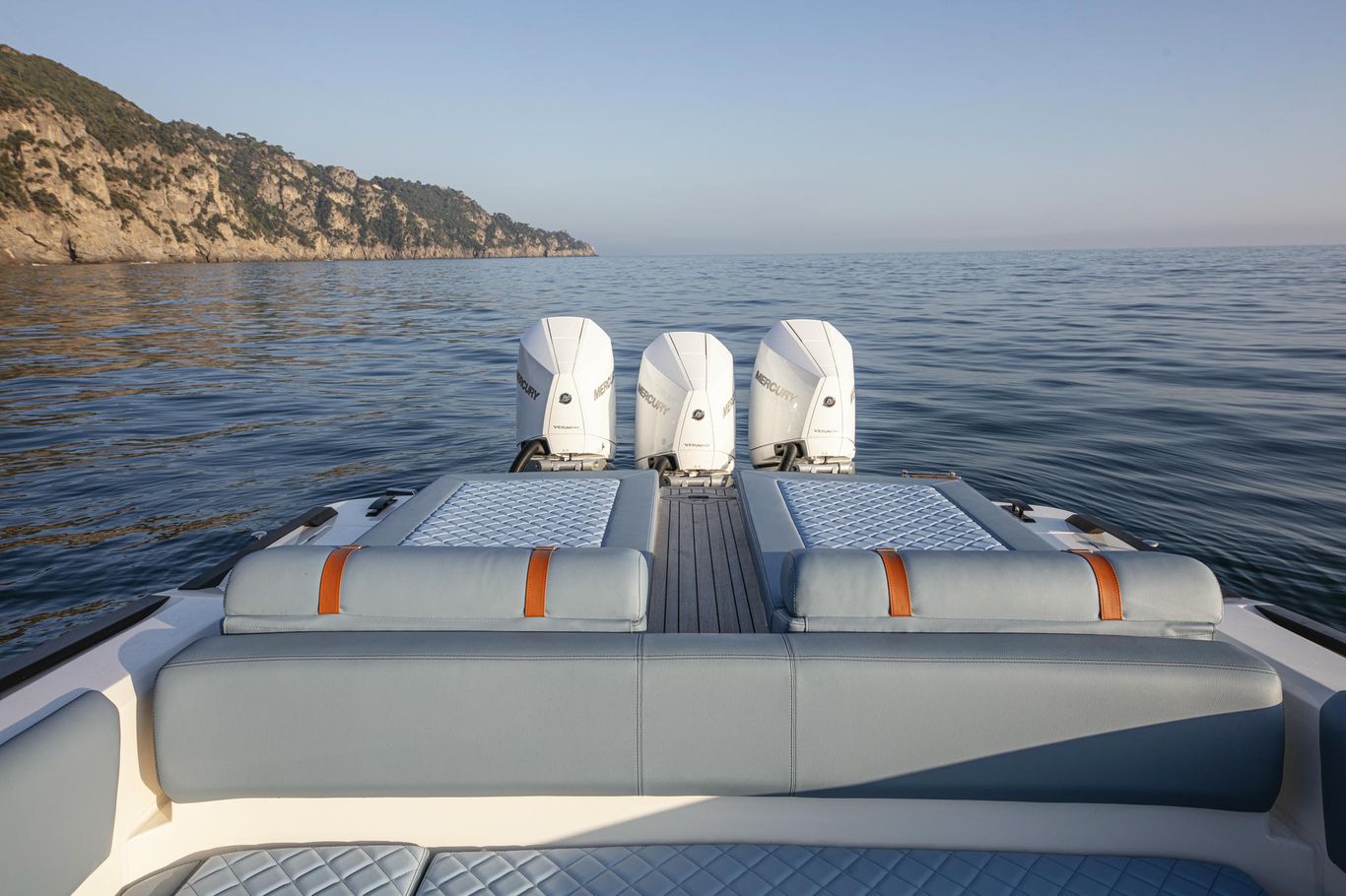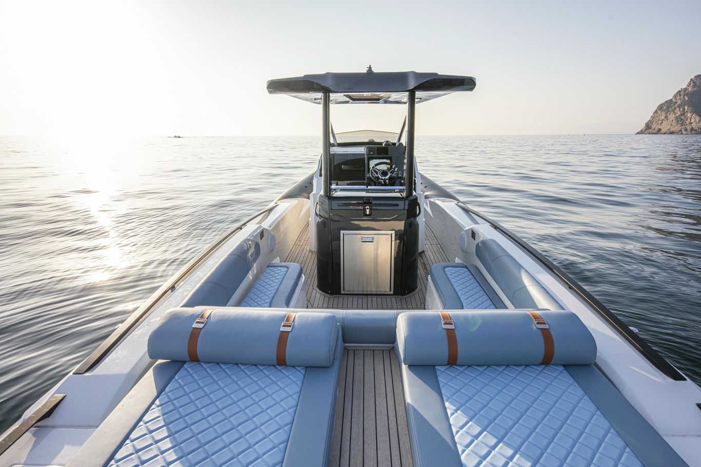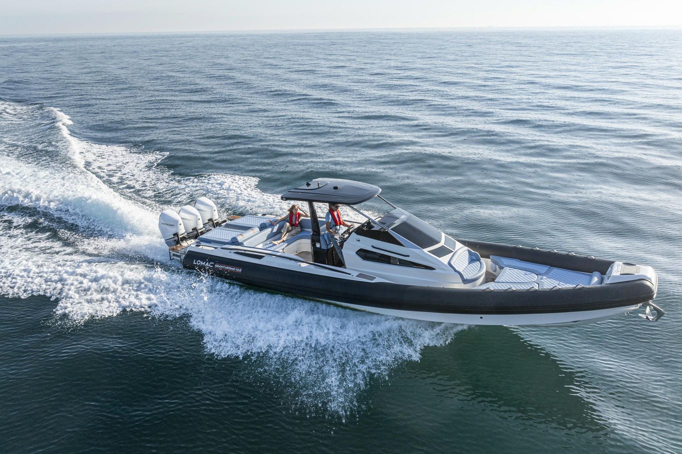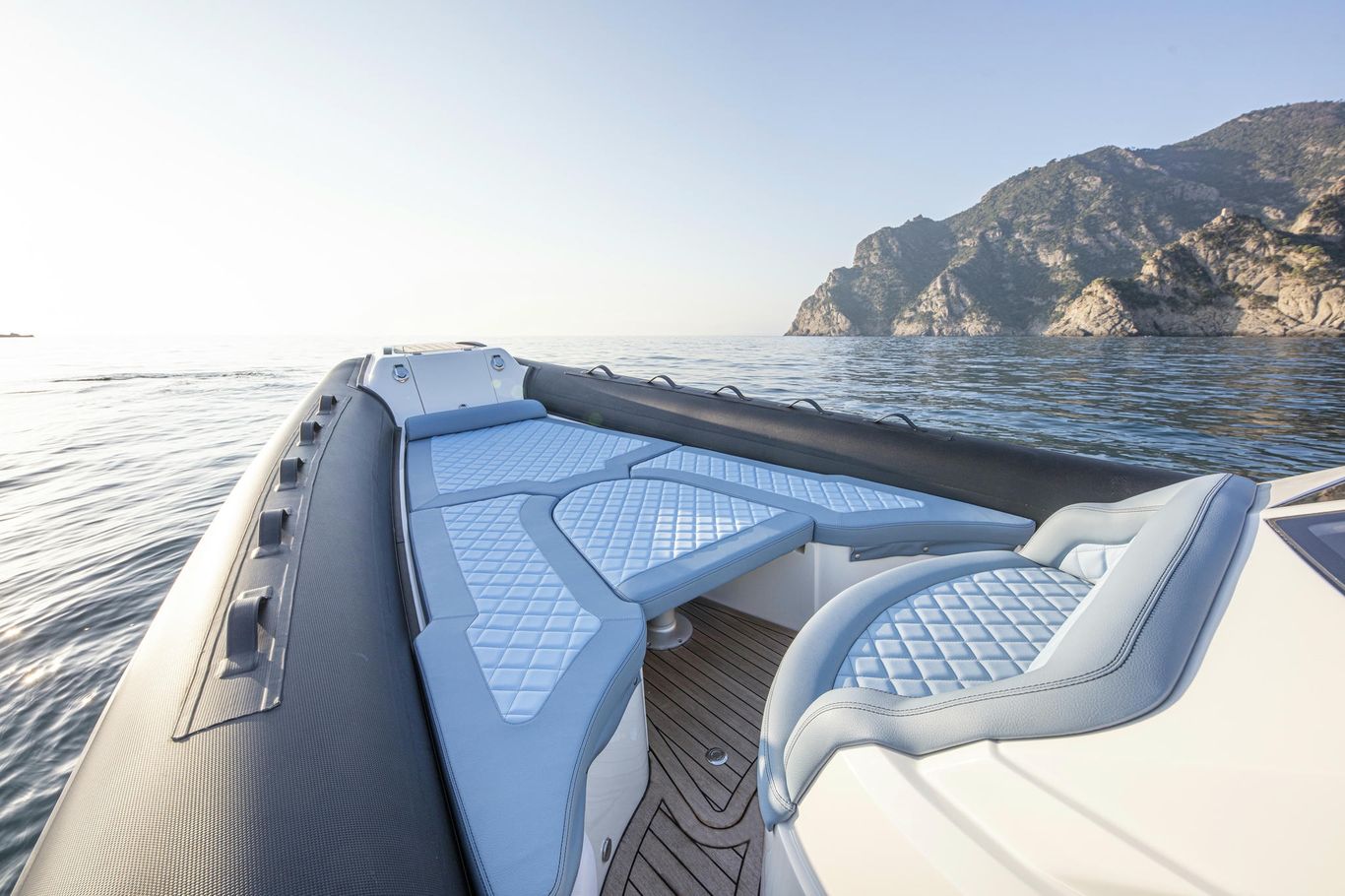 The GranTurismo line represents the peak of Lomac’s boat collection, born from three years of R&D aimed at balancing design, comfort, and performance. Its exclusivity shines through in fine details, material selection, and customization options. The build relies on CFD-optimized hulls, vacuum infusion lamination with vinyl ester resin, neopentyl gelcoat, and aramid fibers reinforcing the T-top, deck, and hull. Styled entirely in Milan by Federico Fiorentino, this maxi-rib is also an ideal luxury tender—and it’s simply unbeatable.
