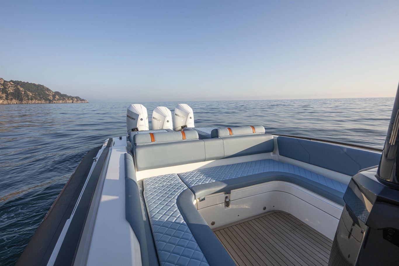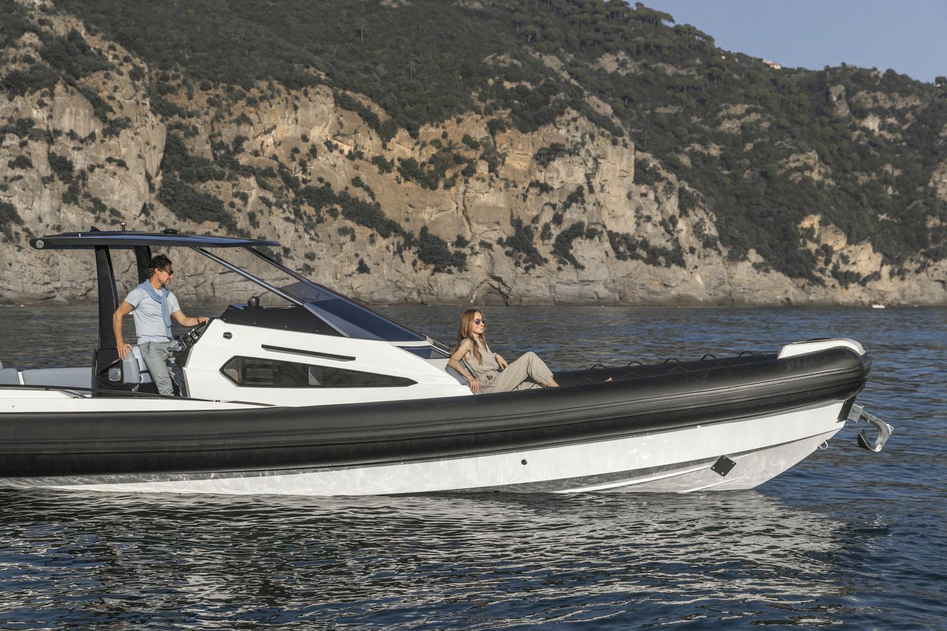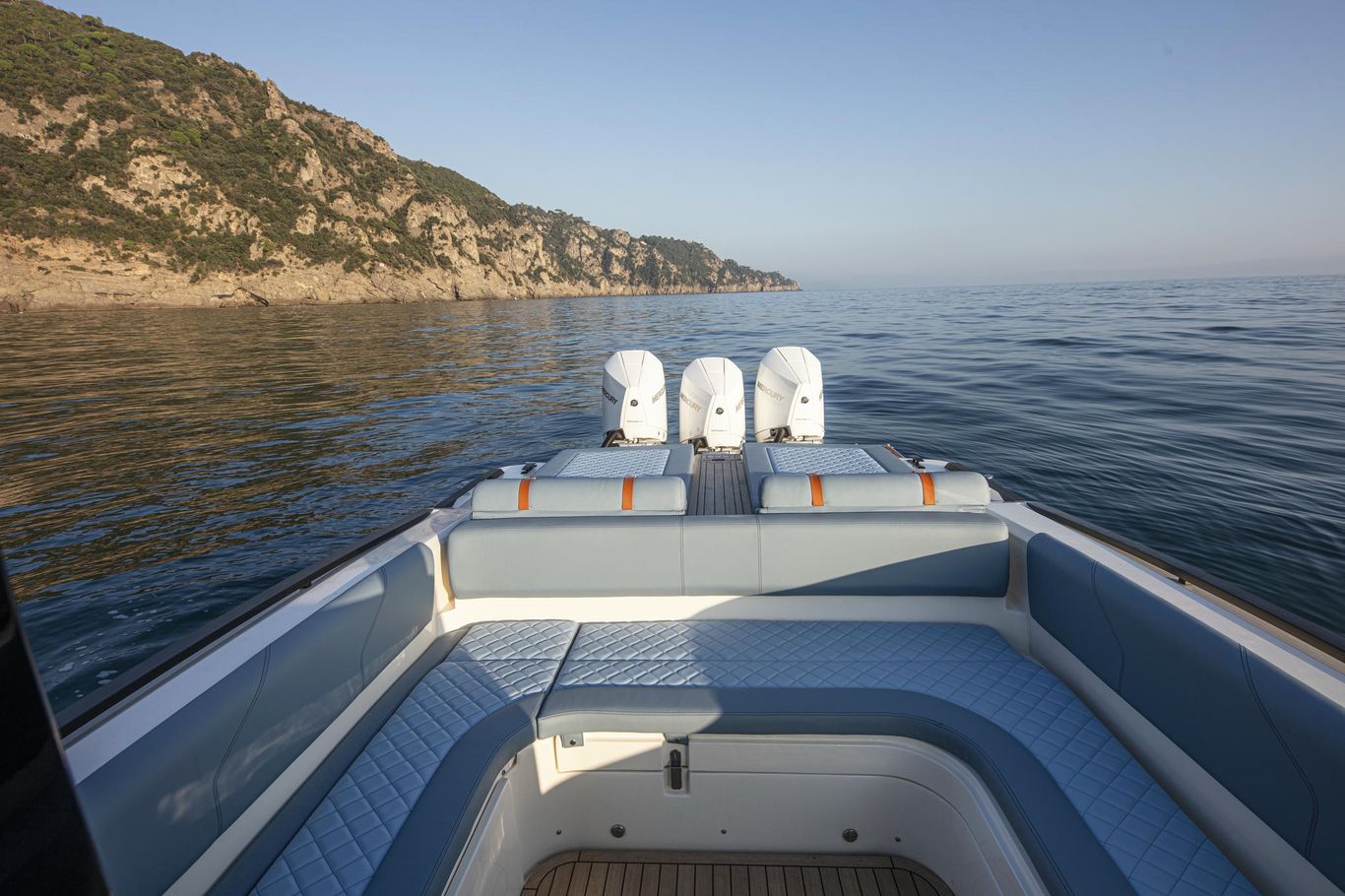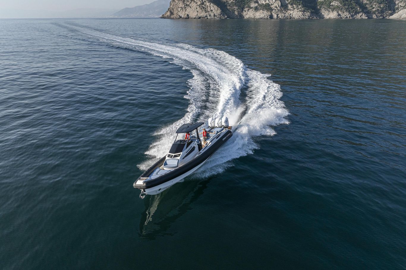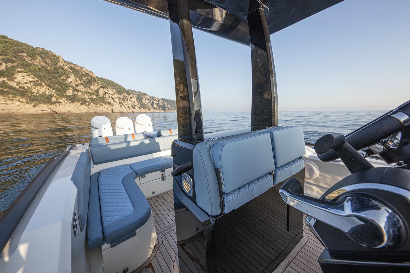 The GranTurismo line represents the peak of Lomac’s boat collection, born from three years of R&D aimed at balancing design, comfort, and performance. Its exclusivity shines through in fine details, material selection, and customization options. The build relies on CFD-optimized hulls, vacuum infusion lamination with vinyl ester resin, neopentyl gelcoat, and aramid fibers reinforcing the T-top, deck, and hull. Styled entirely in Milan by Federico Fiorentino, this maxi-rib is also an ideal luxury tender—and it’s simply unbeatable.