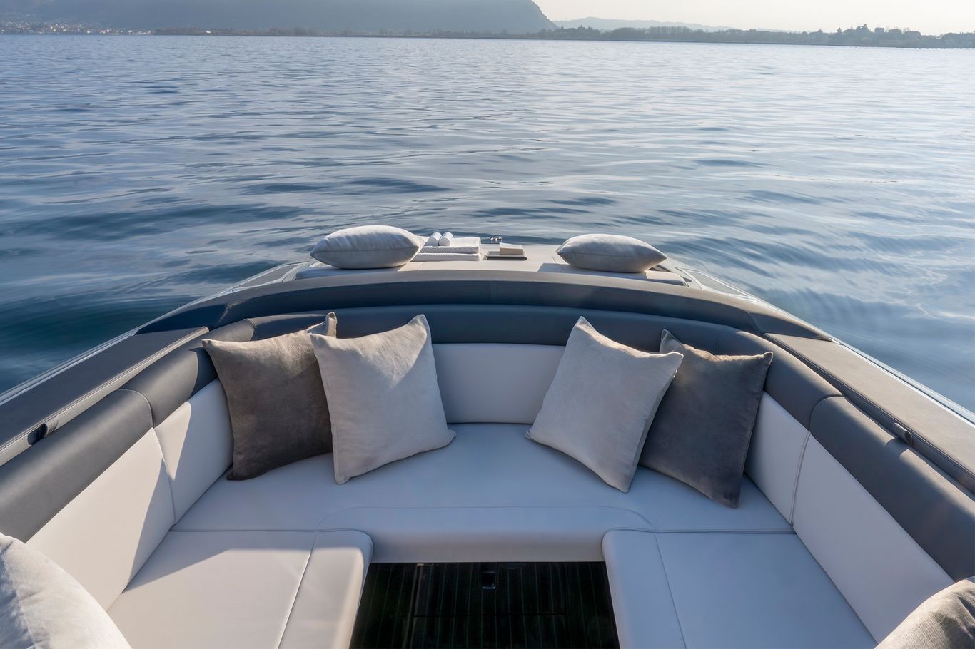 Step into the cockpit, and you’ll find a spacious, elegantly redesigned U-shaped dinette upholstered in waterproof Sky fabric, perfectly coordinated with your chosen hull color. An electric up-down table integrates seamlessly into the seating, while a stowable hand-operated bimini top ensures comfort in any weather. The modern helm station offers a choice of analog or digital instrumentation, including a 12-inch Böning screen, with a symmetrical layout and hidden storage for the fenders and a drawer fridge.