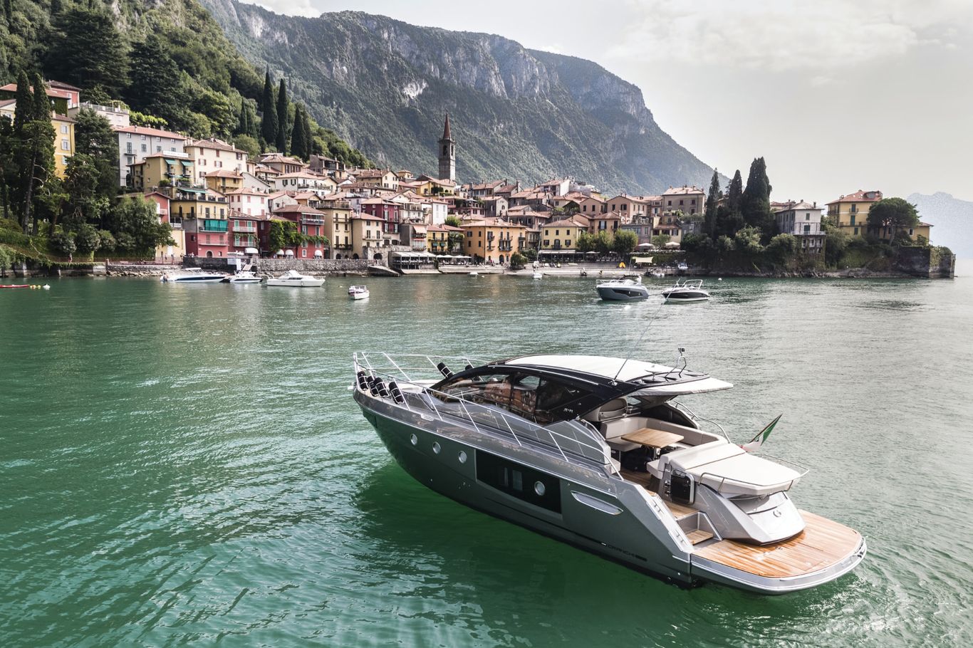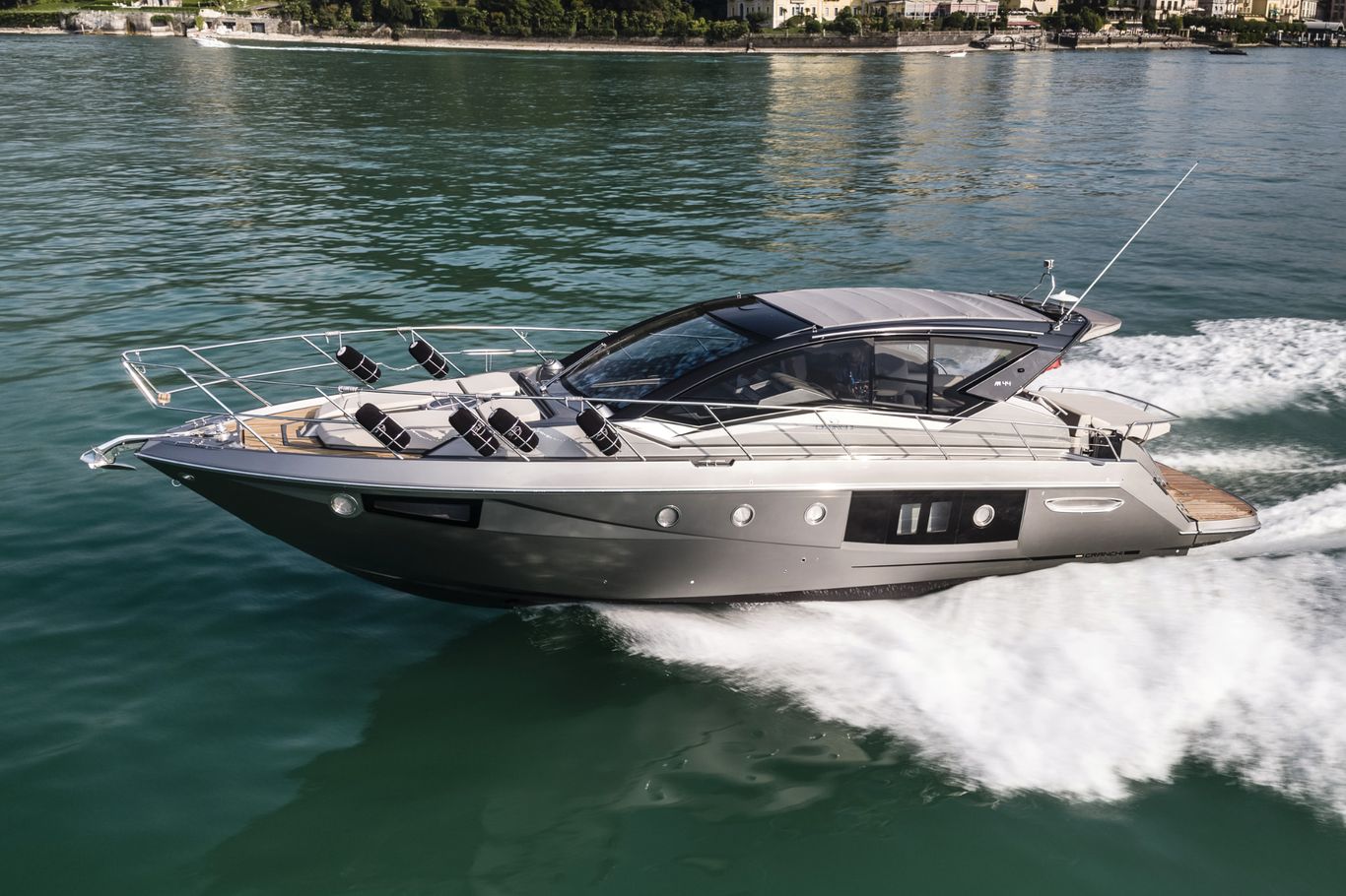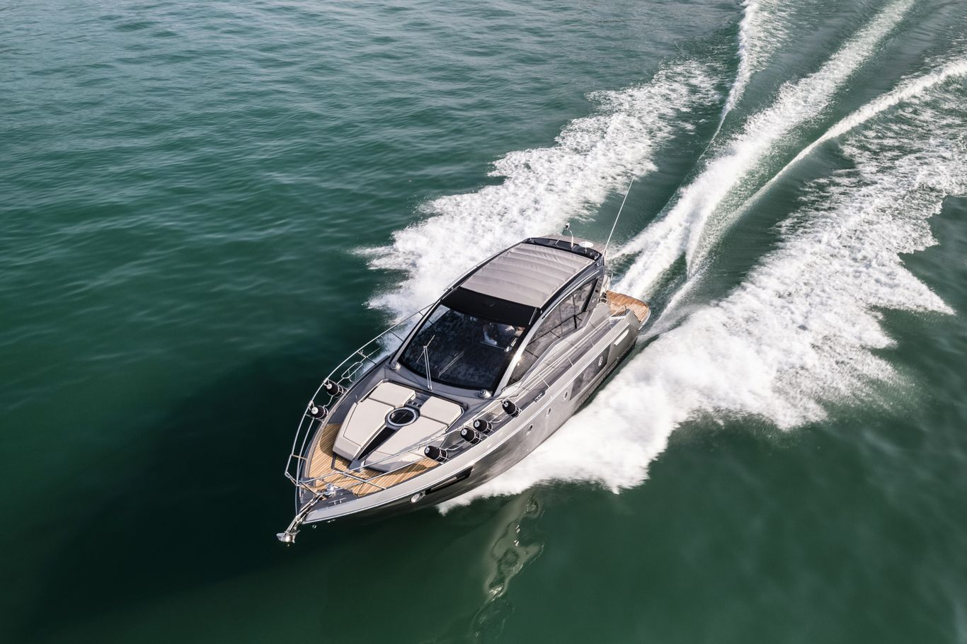 Cranchi Yacht: A modern Cranchi M44 HT cruising across the blue water near a cityscape.