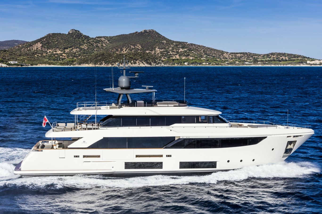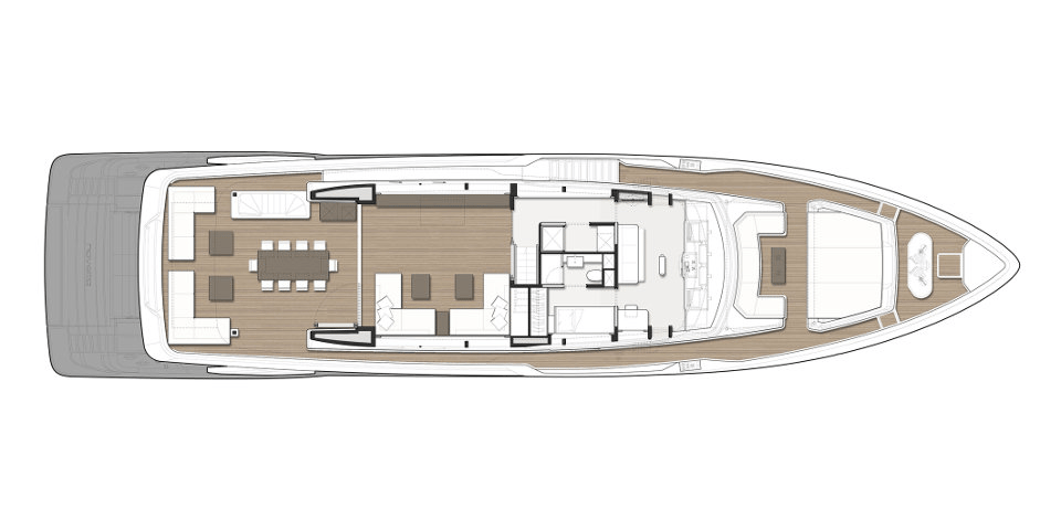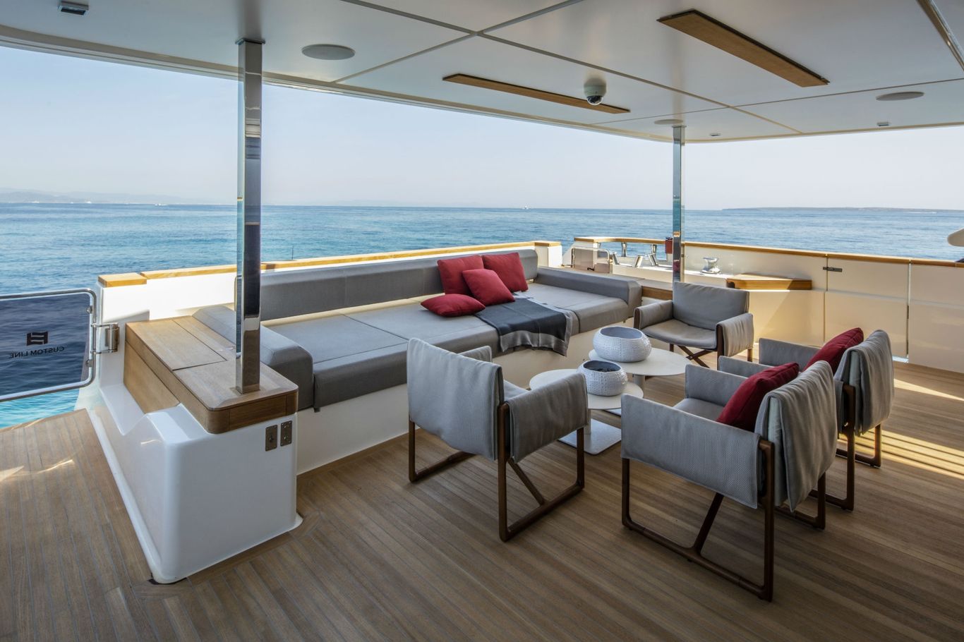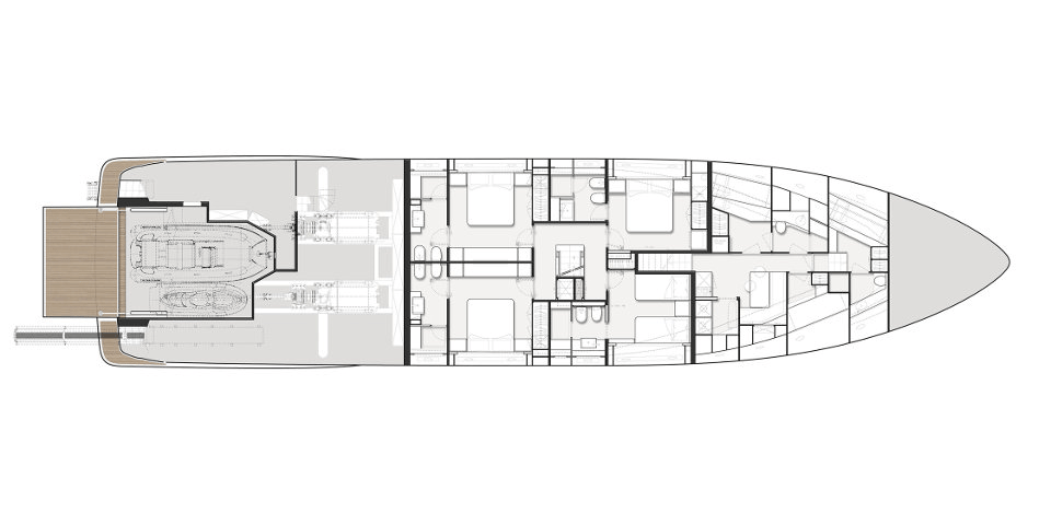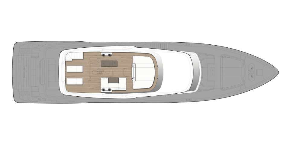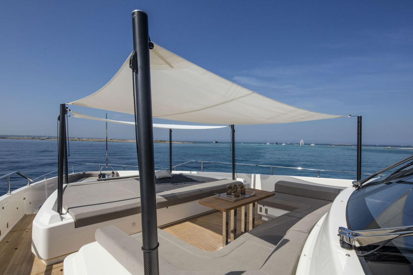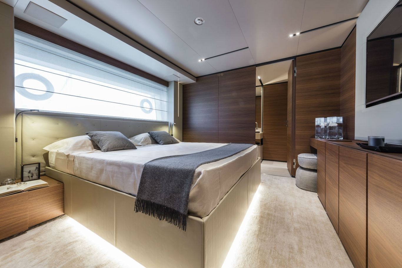 In a world that, now more than ever, is in need of beauty, the Navetta 33 exudes the subtle charm of an alluring and sophisticated diva of the waves, enticing with its beguiling blend of styles, forms and inspirations. Nothing is quite as chic as the new Custom Line semi-displacement yacht, which caters to the desires of every owner who wishes to savour the joys of sailing by making the step up from simple luxury to genuine refinement. The Navetta 33 is the product of the joint efforts of the Product Strategy Committee, headed by Piero Ferrari, along with the Group’s Engineering Department, whose architects and designers worked on the interior design, and Zuccon International Project, which was responsible for the exterior design. This yacht (108.3 ft.) introduces considerable technical advances to the line, which serve to complement the innovations that have already been admired in previous Custom Line models. For instance, the hull features a bulbous forward section and delivers performance at the top of its class in terms of seaworthiness and stability, with a range of up to 2,000 nautical miles at economical cruising speed. In addition, yacht owners and their guests can make the most of marvellous spaces across all 4 decks: from the wide-body master suite forward on the main deck, to the 4 guest cabins on the lower deck. The Navetta 33 furthermore features all of the technical innovations presented on Custom Line’s latest models: the patented DMT system for optimum use of the stern area; VOTIS software for flexible, practical management of the infotainment systems on board; and an integrated helm station, for completely safe sailing and monitoring of the systems and equipment on board. Absolute comfort is also guaranteed in terms of stabilisation when at anchor and when mooring, thanks to electro-hydraulic stabilising fins with zero speed mode, in addition to, on the first unit, two Seakeeper gyroscopic stabilisers.