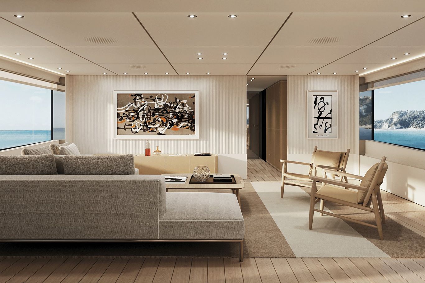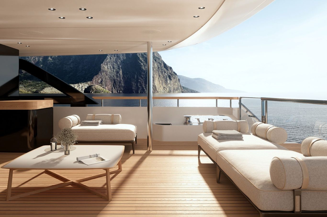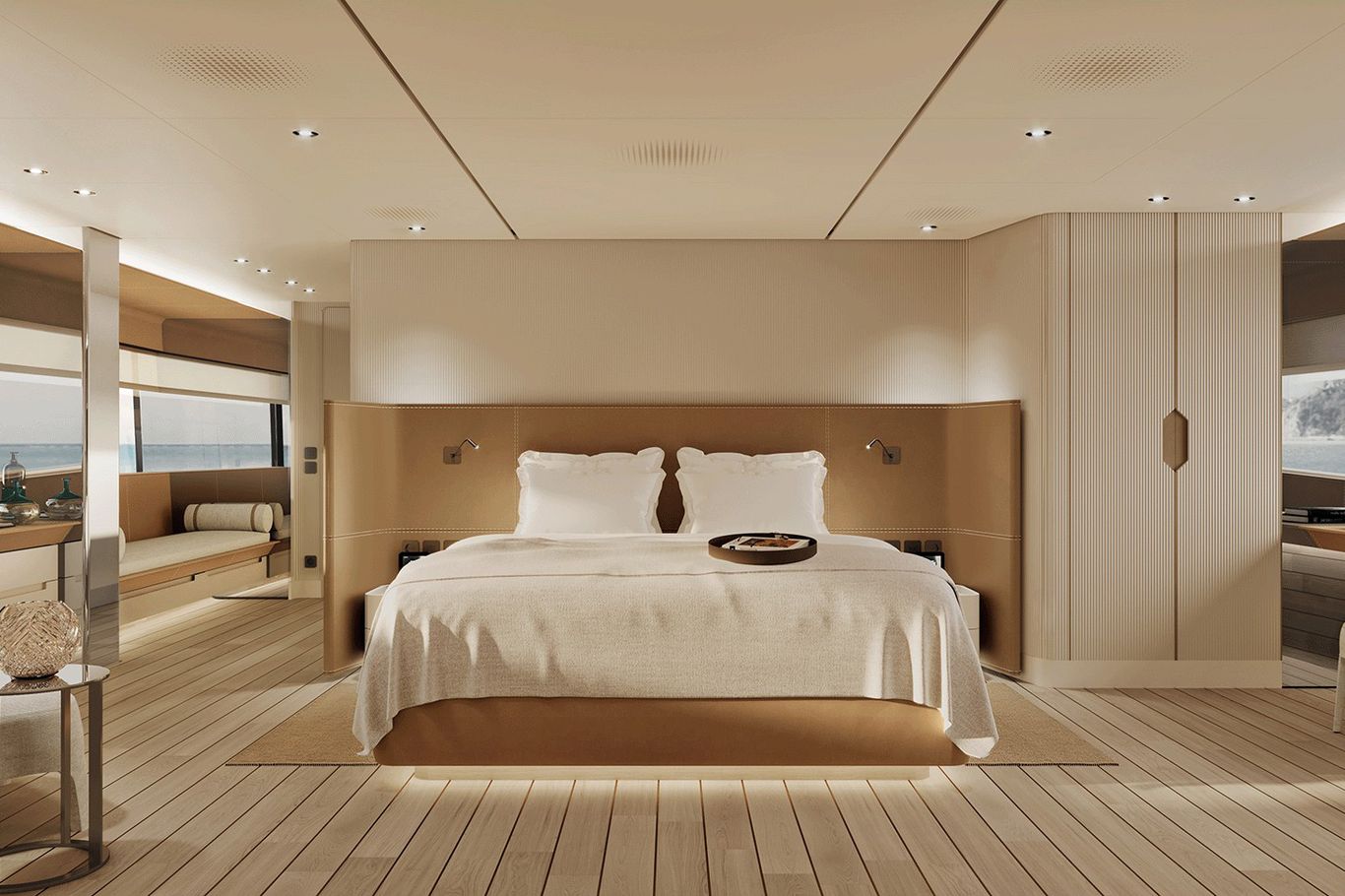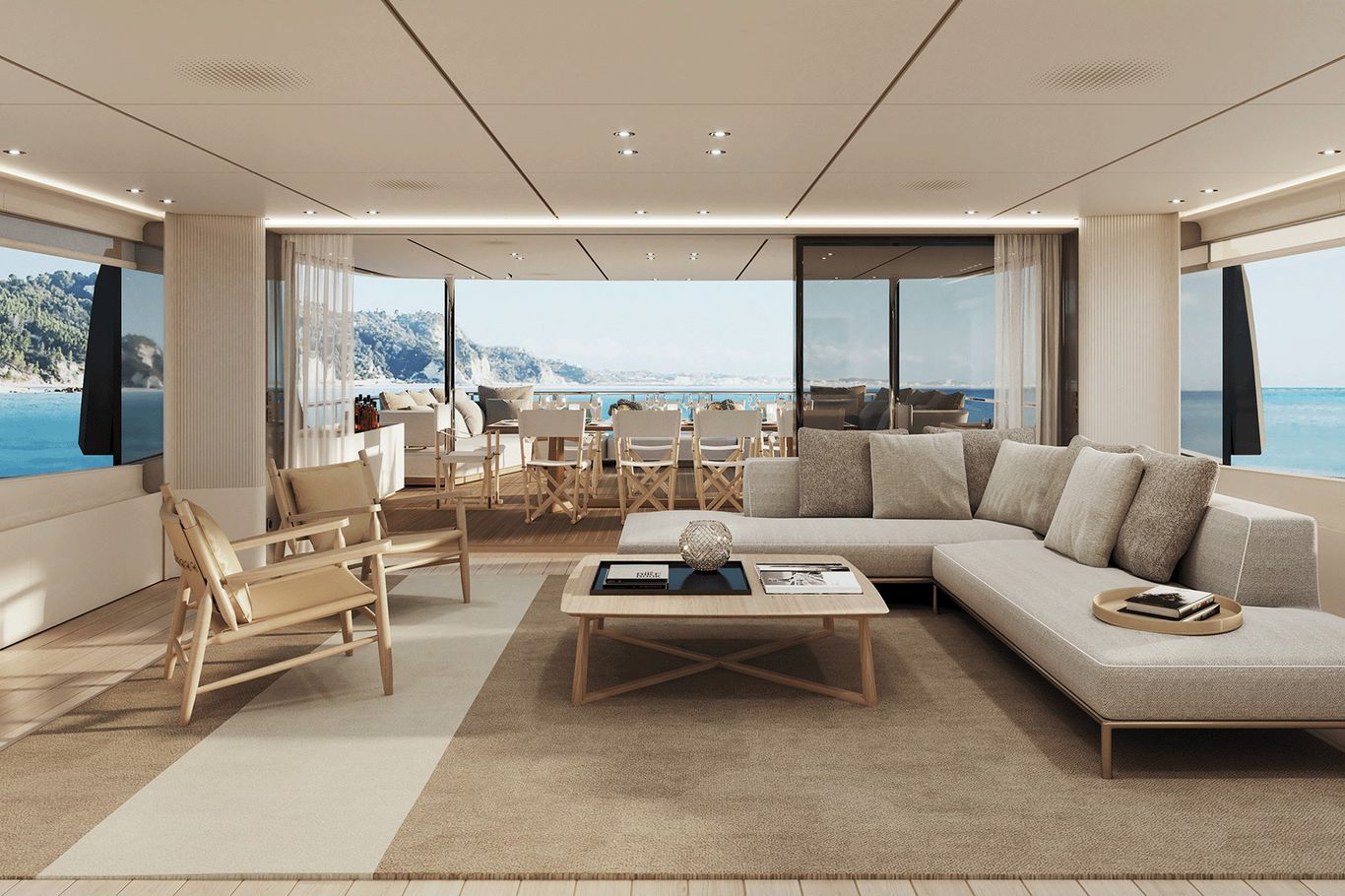 Inside, the atmosphere is transformed: pale woods, neutral fabrics, and vast windows create a light, open, and airy ambiance—perfect for those seeking a modern, residential-inspired retreat at sea. The layout remains refined with five guest cabins, including a main-deck owner’s suite, and four crew cabins, ensuring privacy and comfort for all.