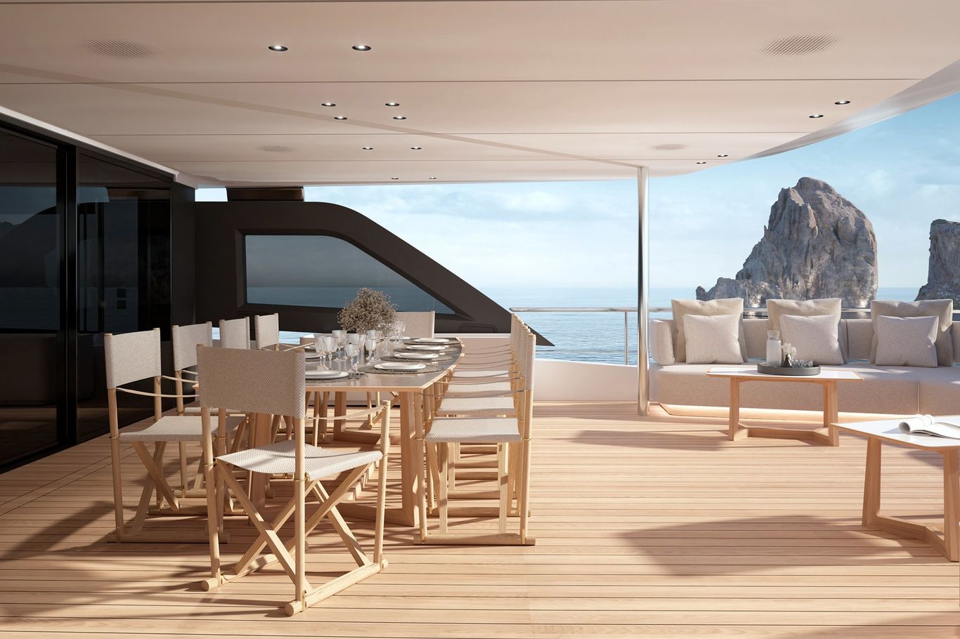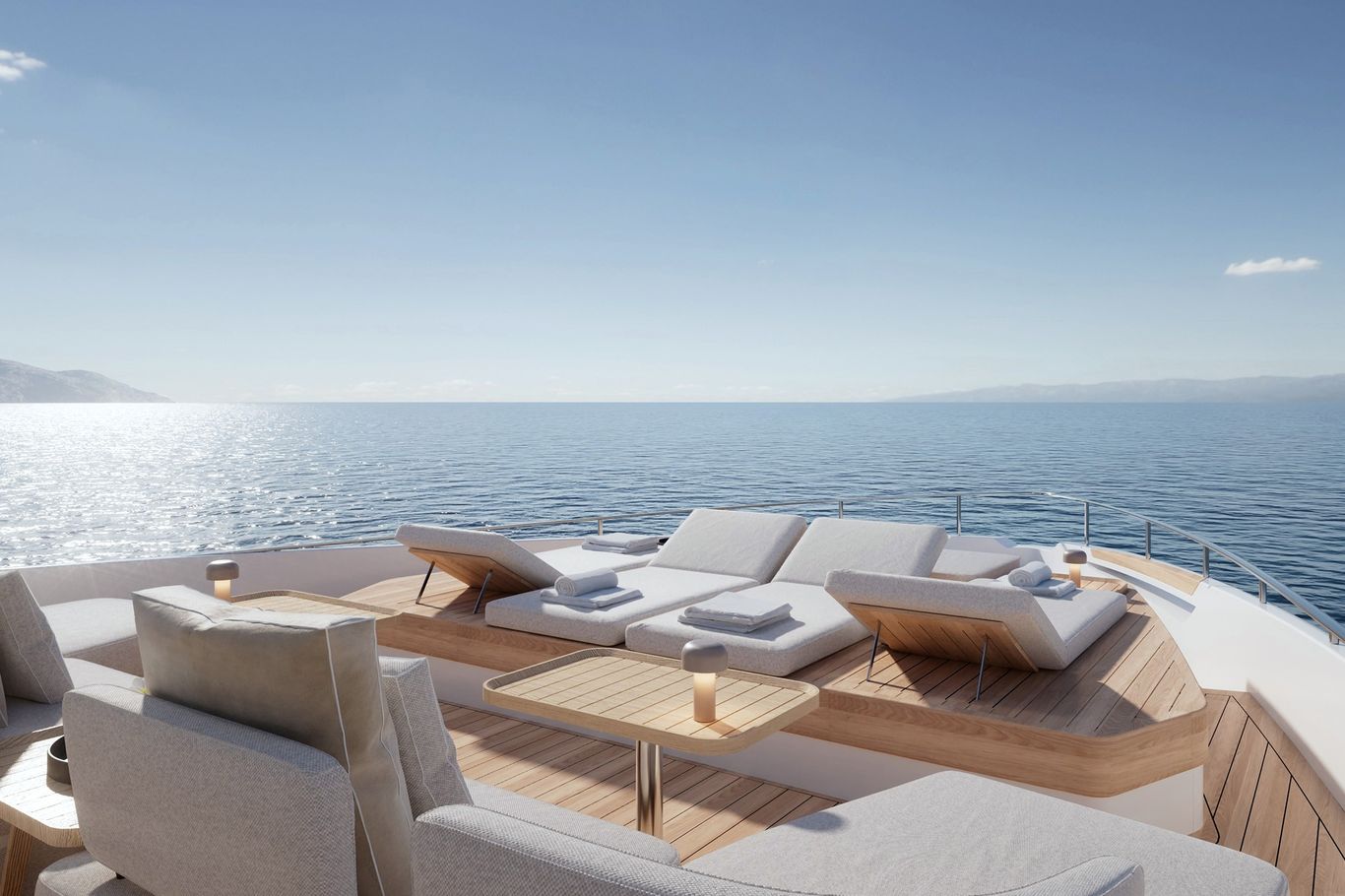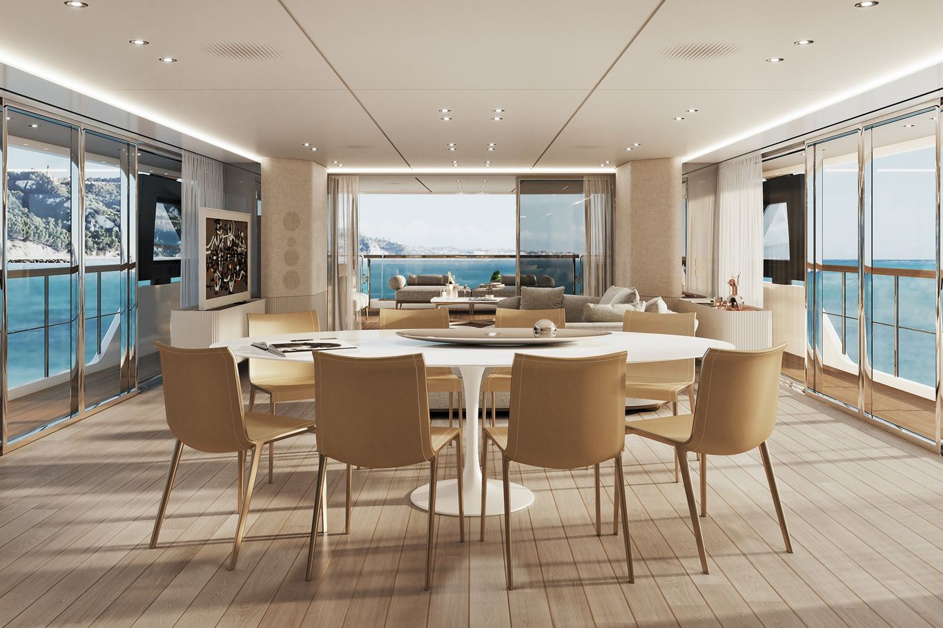 Inside, the atmosphere is transformed: pale woods, neutral fabrics, and vast windows create a light, open, and airy ambiance—perfect for those seeking a modern, residential-inspired retreat at sea. The layout remains refined with five guest cabins, including a main-deck owner’s suite, and four crew cabins, ensuring privacy and comfort for all.