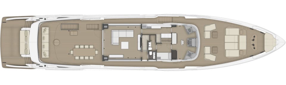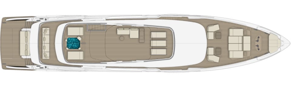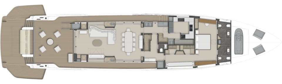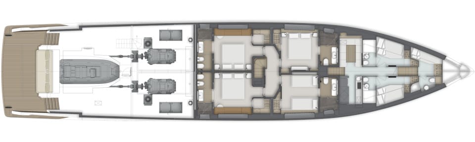 A hymn to the values of quality, volume and comfort extending across four decks, the new Custom Line Navetta 38 has in fact been designed to maximise use of all the spaces available on its four decks. In more detail, it has a large master suite of over 40 square metres on the main deck, with completely separated crew and guest flows to ensure maximum privacy. In addition to the master suite, Custom Line Navetta 38 has four guest cabins on the lower deck, accommodating a total of 10 people on board and seven crew members, including the captain.