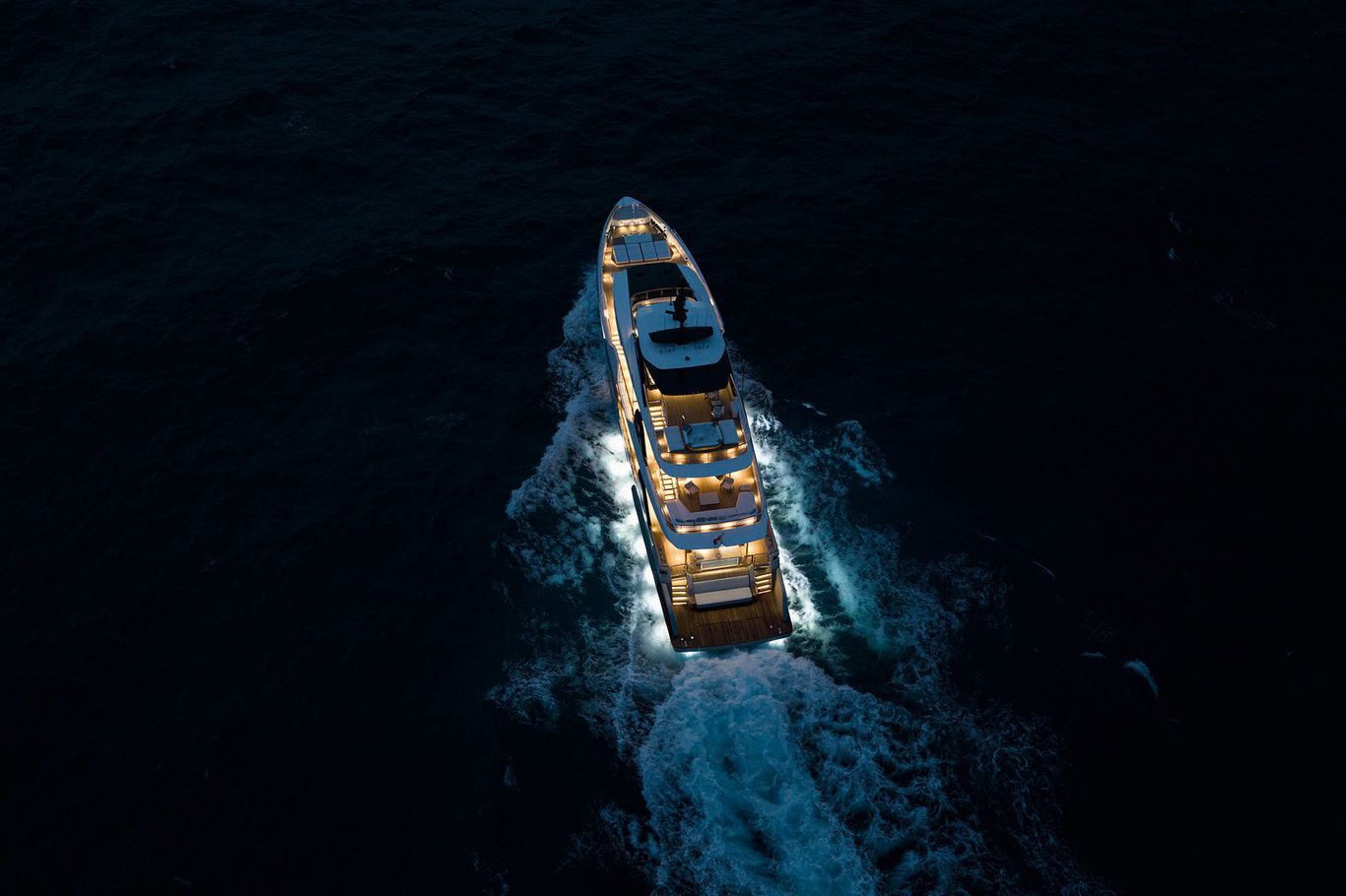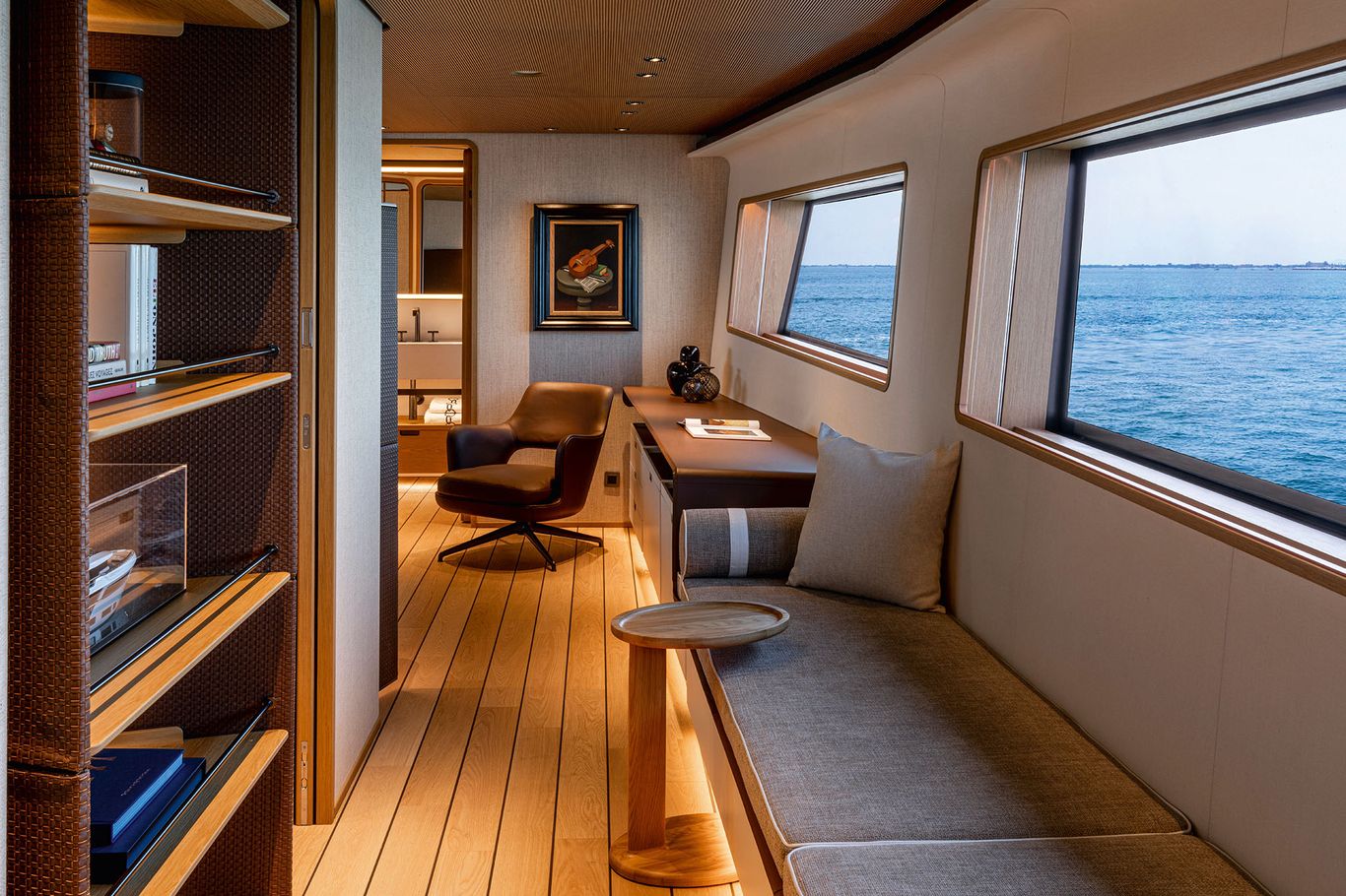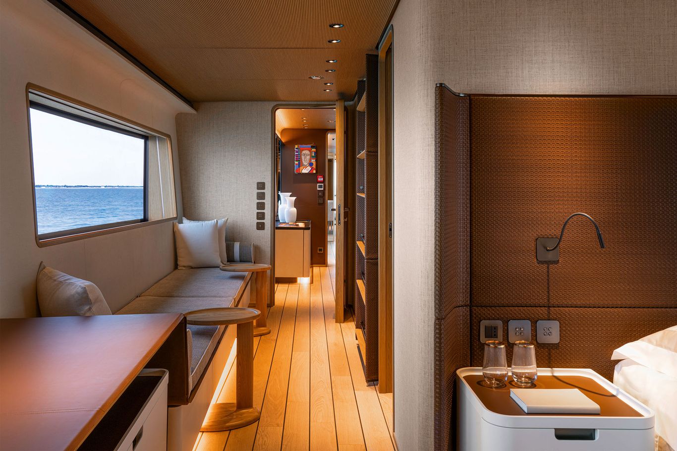 The yacht’s interiors are designed for maximum use of space, with optimum control of all volumes and functional exploitation of the entire available surface area to ensure flexibility. Natural light is amplified by huge floor-to-ceiling windows, creating stylish continuity between external and internal spaces and a feeling of perfect harmony with the marine environment.
