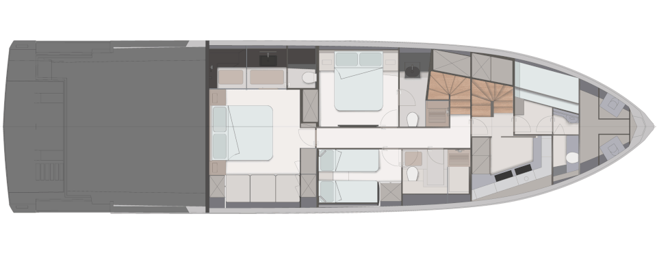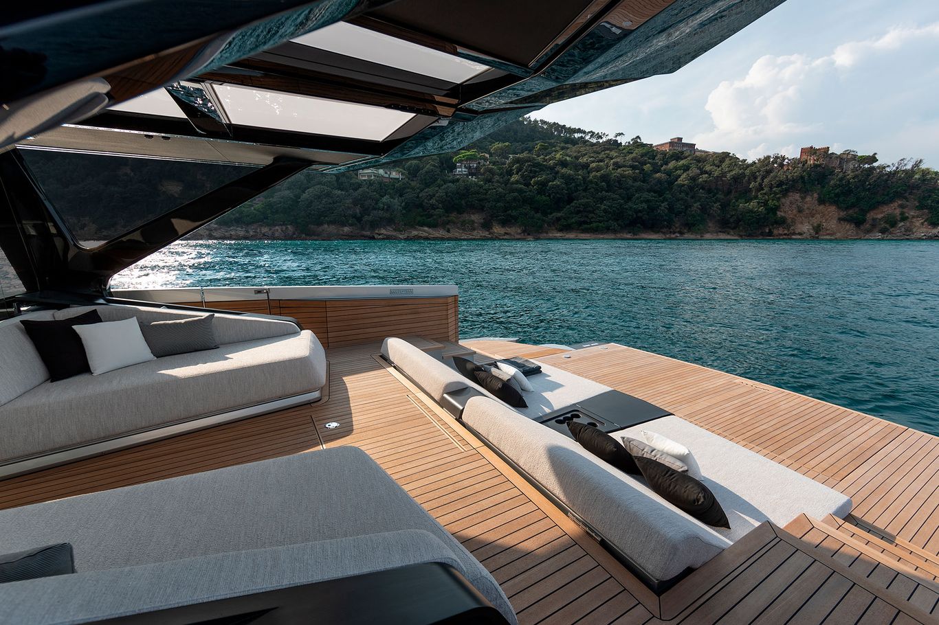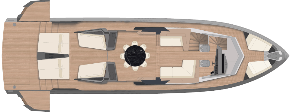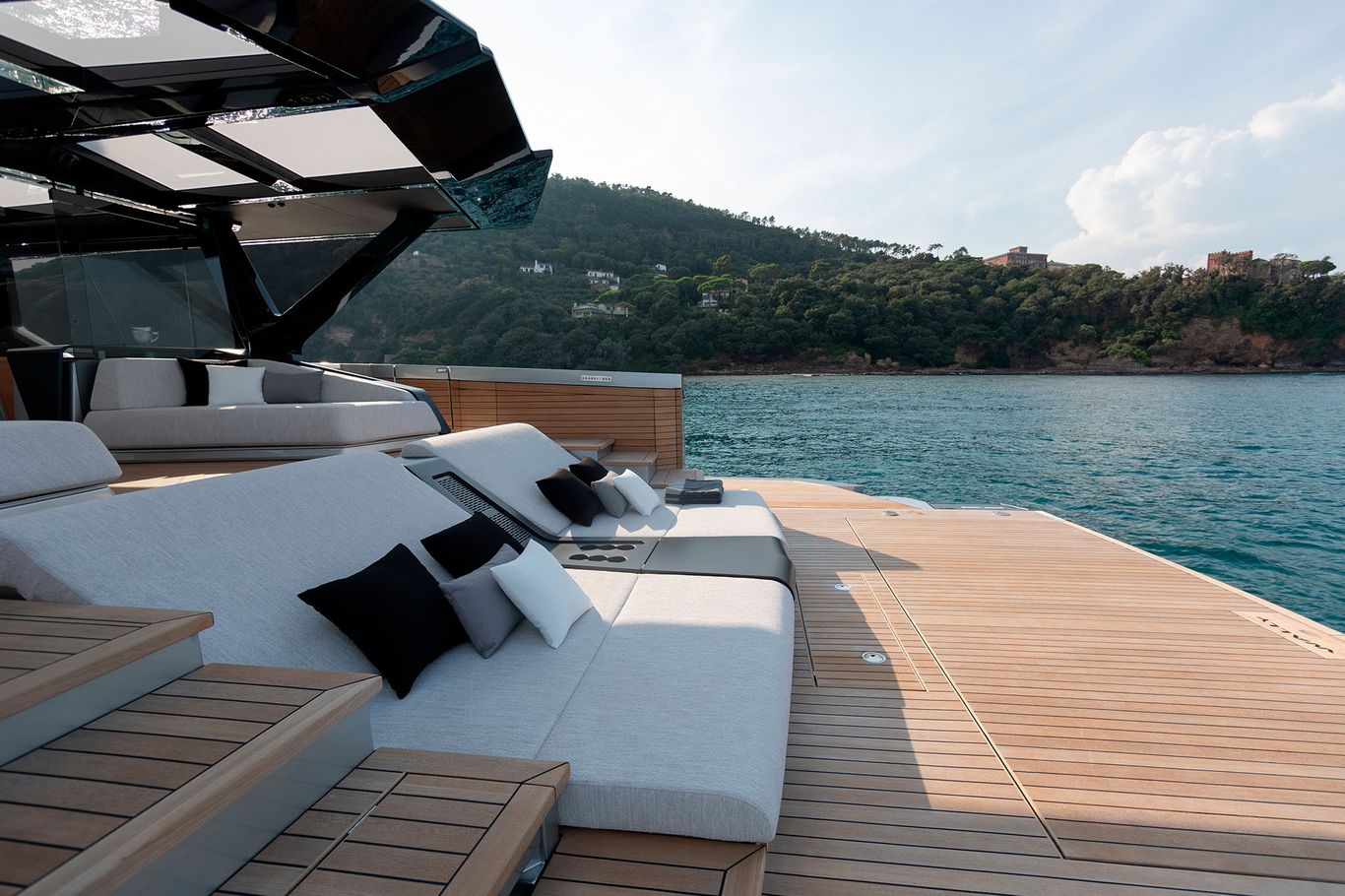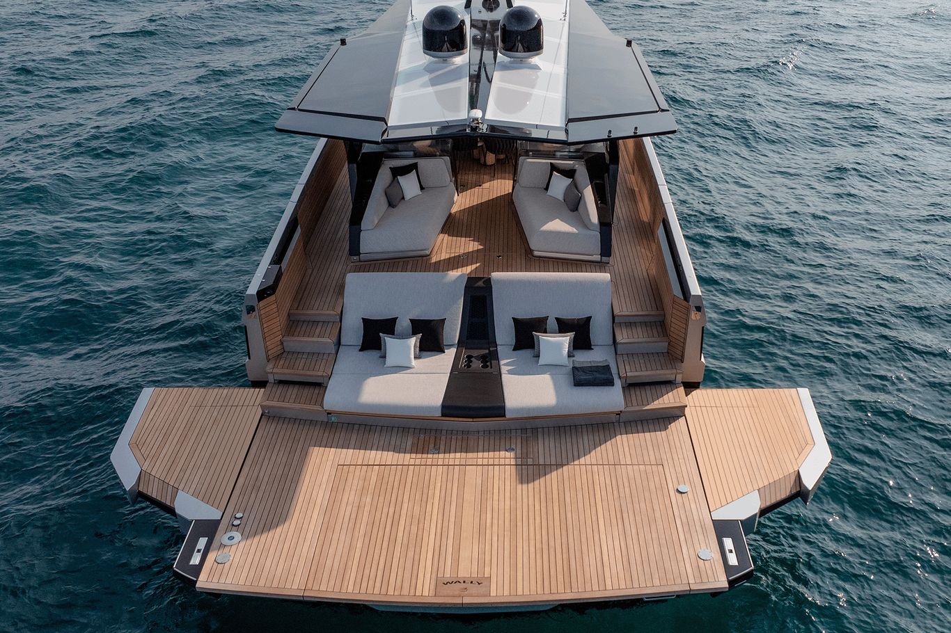 True to Wally’s DNA, the yacht emphasizes a close connection to the water. A large beach area with fold-down wings, a hydraulic passerelle that doubles as swim steps, and a lowering rear platform for tender and toy access enhance the experience. The forward cockpit offers the perfect spot to enjoy the seascape with an aperitivo. The wallywhy100 is a masterclass in versatility, performance, and style.