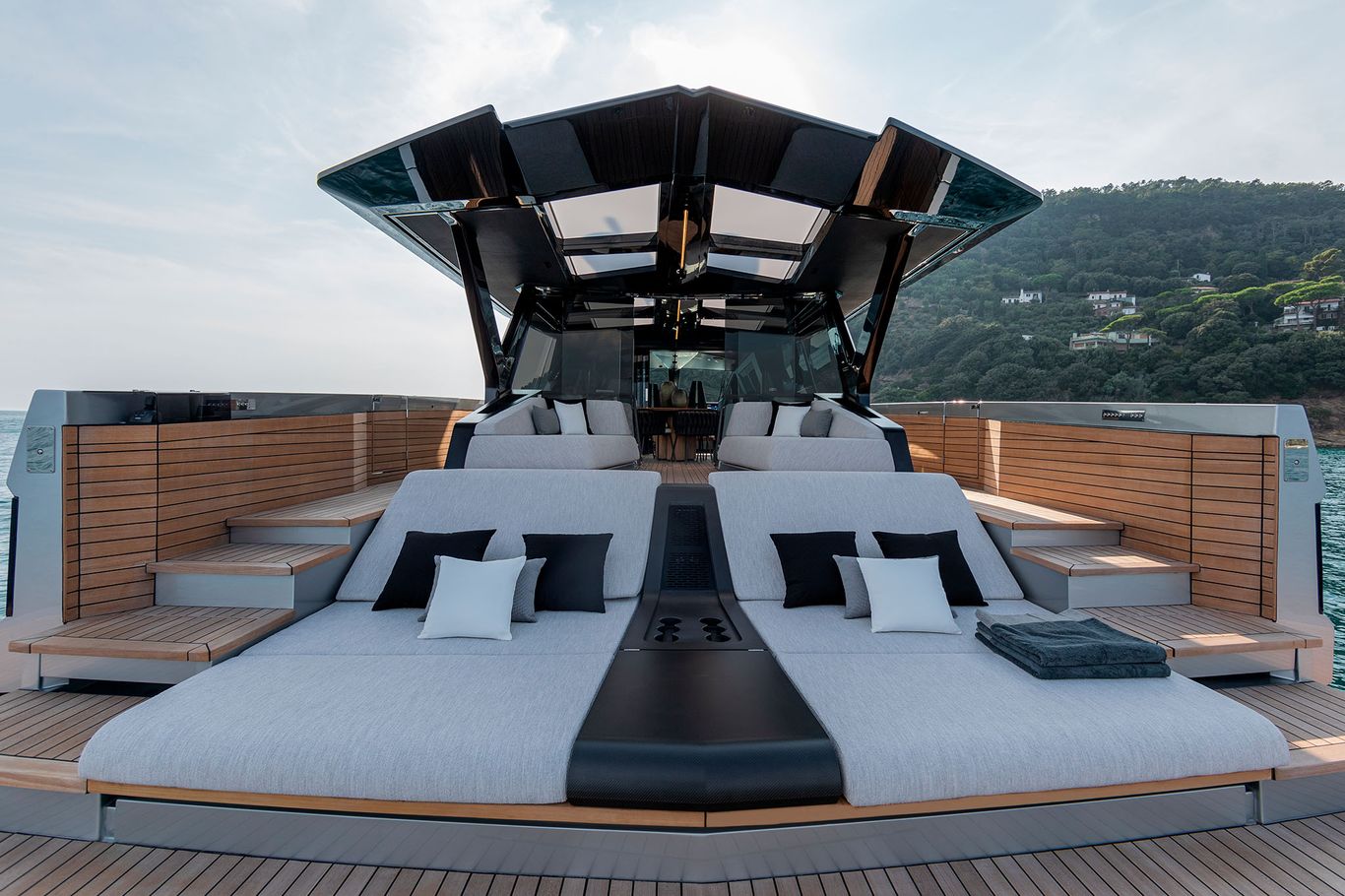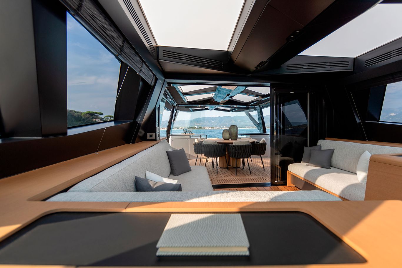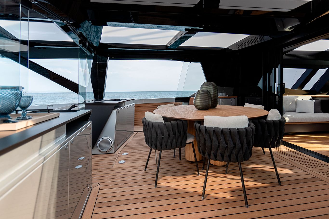 The wallywhy100 redefines the crossover yacht, blending bold innovation with compact agility in a sub-70ft package. At its heart is a single flush deck that seamlessly adapts to any occasion, thanks to a hybrid inside-outside design. The space transforms effortlessly, featuring dining for six, chaises-longues, a bar, and a galley, with opening sides and aft doors creating versatile ambiance. The wheelhouse can be closed off, turning the cockpit into a cozy movie lounge.