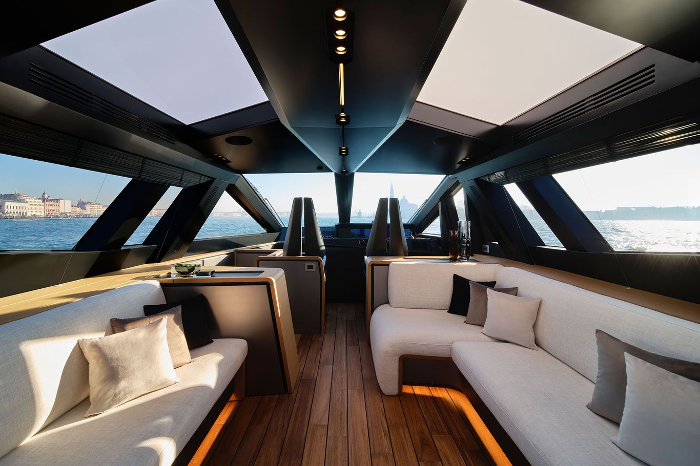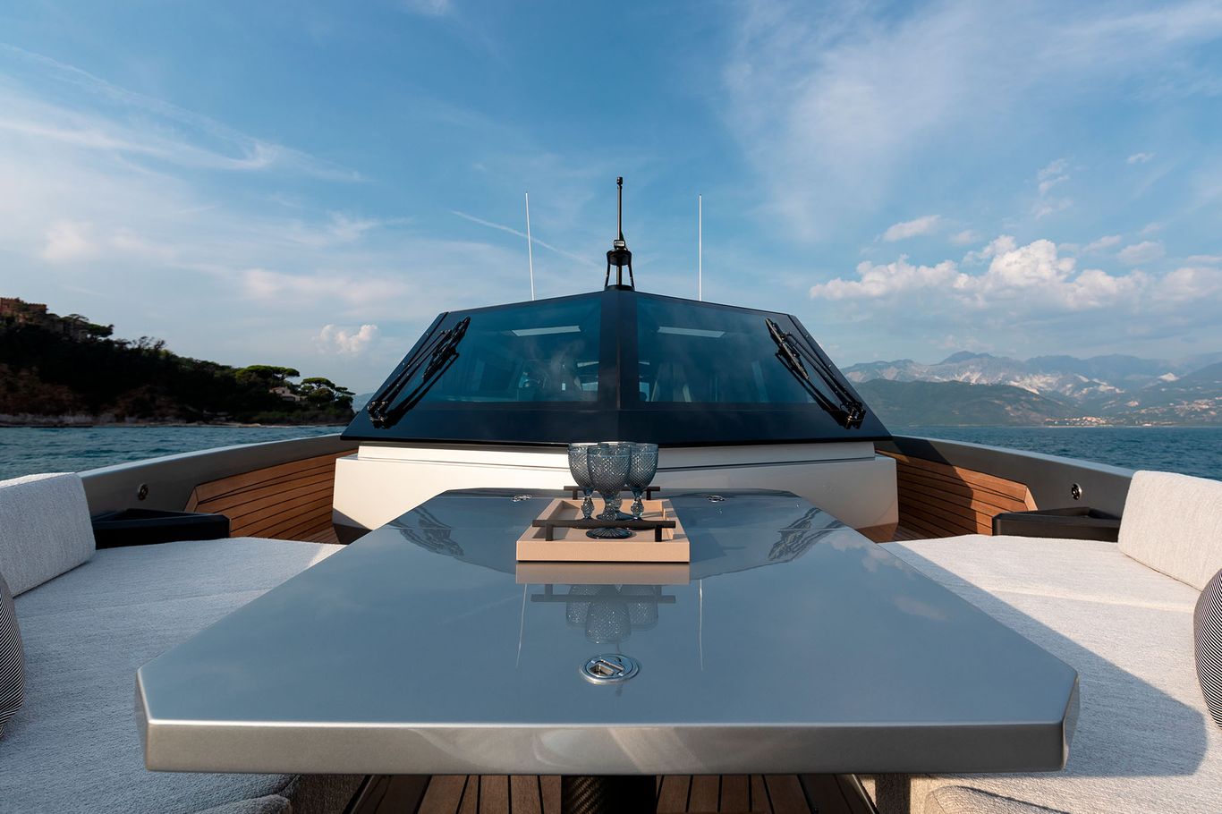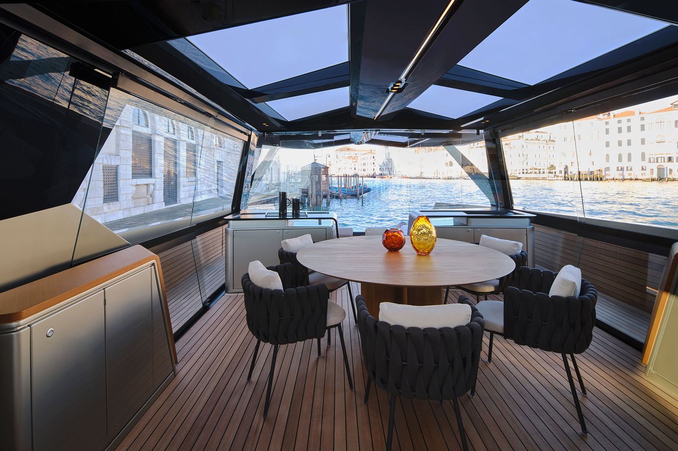 The wallywhy100 redefines the crossover yacht, blending bold innovation with compact agility in a sub-70ft package. At its heart is a single flush deck that seamlessly adapts to any occasion, thanks to a hybrid inside-outside design. The space transforms effortlessly, featuring dining for six, chaises-longues, a bar, and a galley, with opening sides and aft doors creating versatile ambiance. The wheelhouse can be closed off, turning the cockpit into a cozy movie lounge.