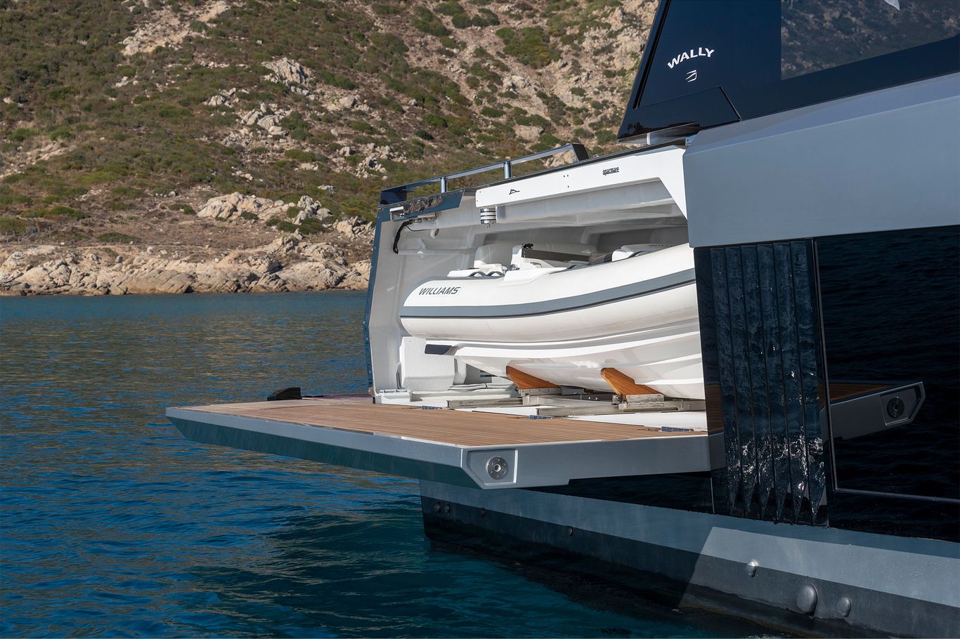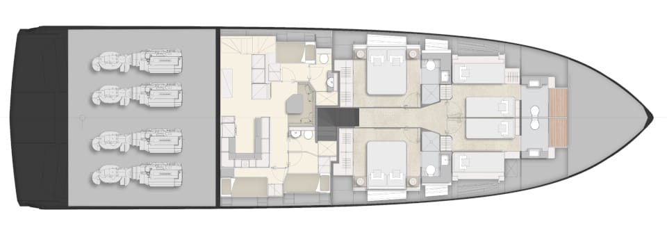 The design is stunning, with teak decking cascading down to a beach club featuring extendable wings and a hydraulic swim platform. A 4.15m tender and toys are discreetly stored behind the wings, maintaining clean lines and functionality.