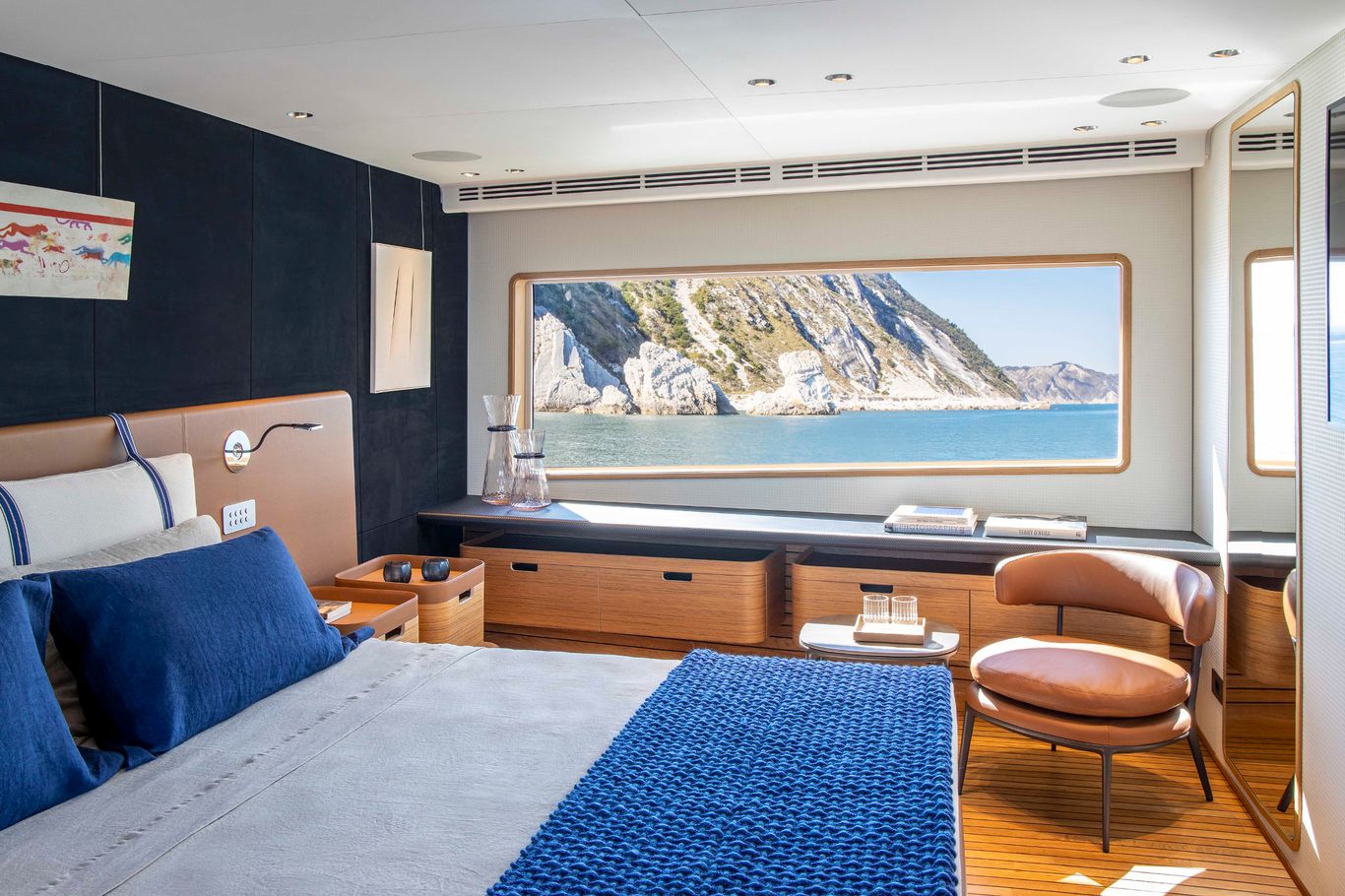 Launched in October 2020, the Navetta 30 is the newest model in Custom Line’s Navetta range, replacing the older 28. The Navetta 30 joins the 33, 37 and 42-metre models, all of which have been unveiled to make up the new generation of Custom Line Navetta’s. Navetta yachts prioritise space and comfort. With a 7.3-metre beam and with 197 gross tonnes, it has 22 per cent more volume than its older predecessor. Creating an agile and harmonious design within these measurements is no easy task. The stylish décor complements the high level of cruising comfort that characterises the Navetta line. The Navetta 30 has four engine options and the package chosen for hull No 1 – 1,000hp MAN V8s – gives a top speed of 15 knots. Not for speed chasers, the Custom Line Navetta’s are ideal for those who enjoy relaxed cruising.