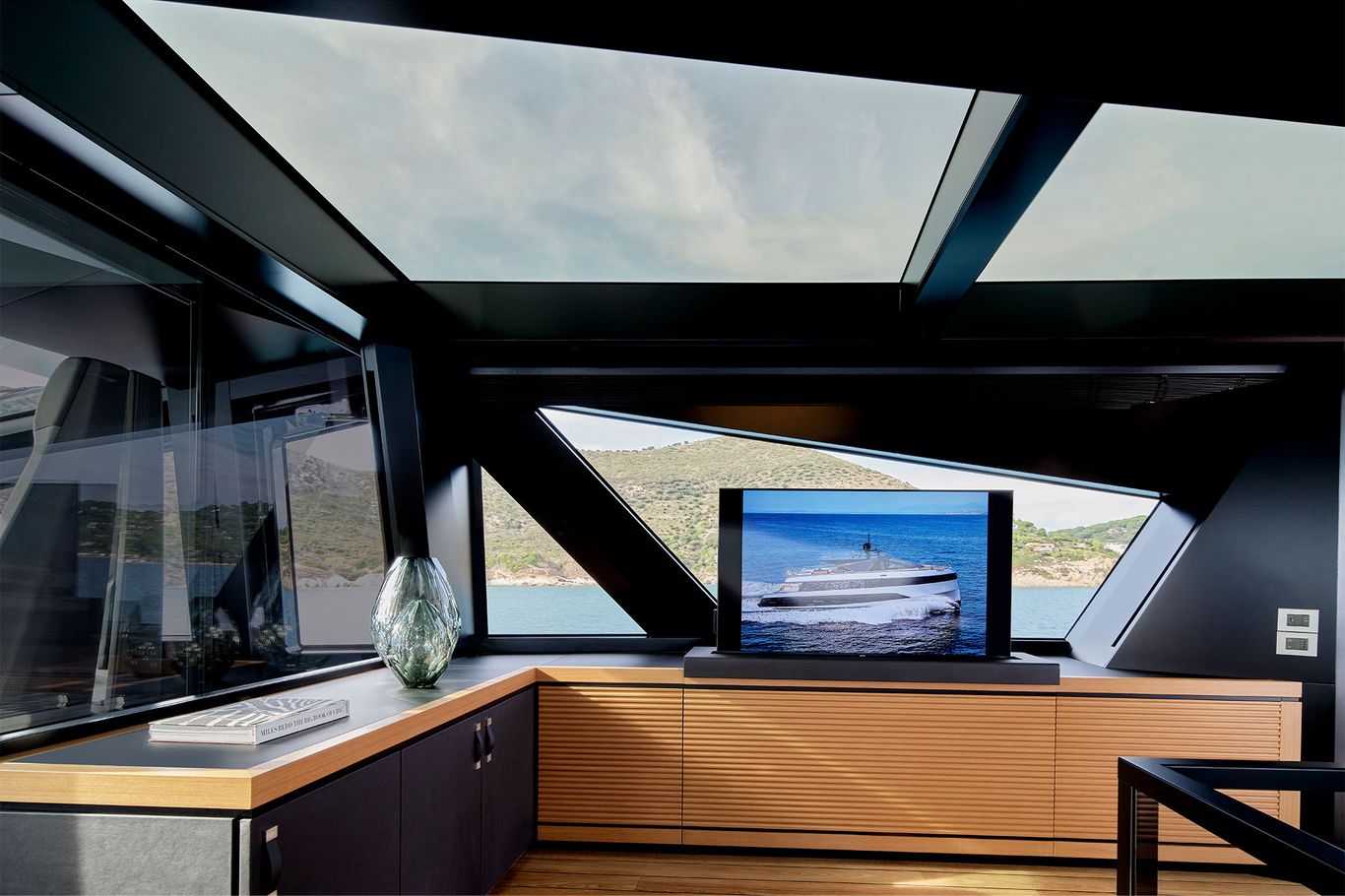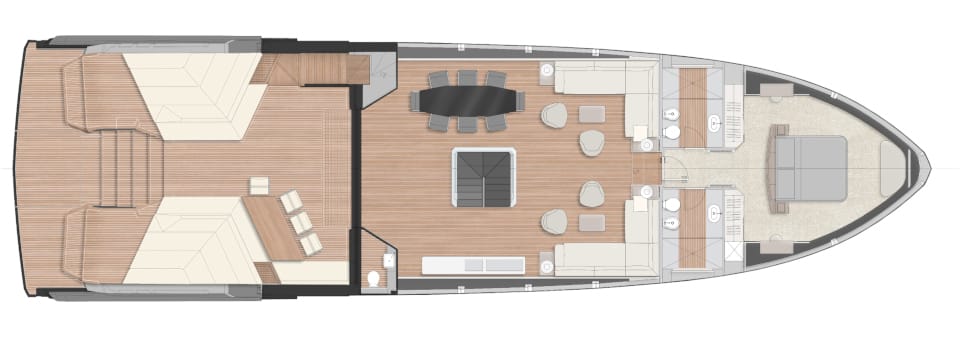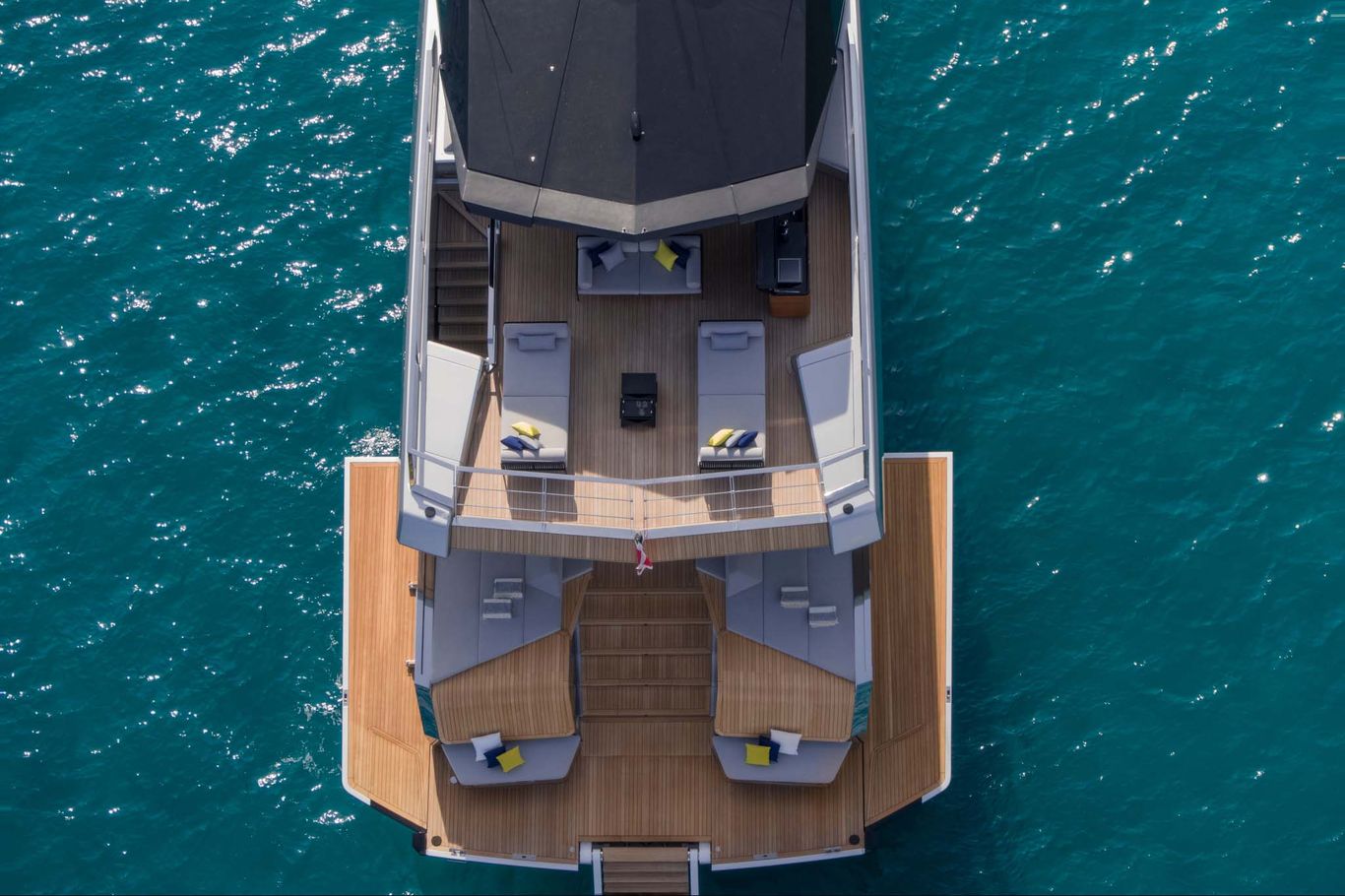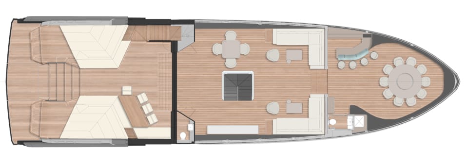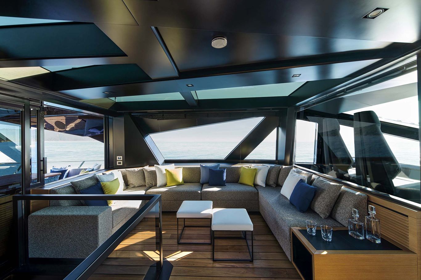 An enormous upper deck is presided over by Wally’s signature glass and carbon dome. And on the lower deck, there are a luxurious VIP suite and two dazzling guest cabins. An eye-catching carbon fibre staircase connects all the decks – laminated in a single piece to give structural support and eliminate bulkheads. This creates open entertaining spaces that blend seamlessly into the exterior.