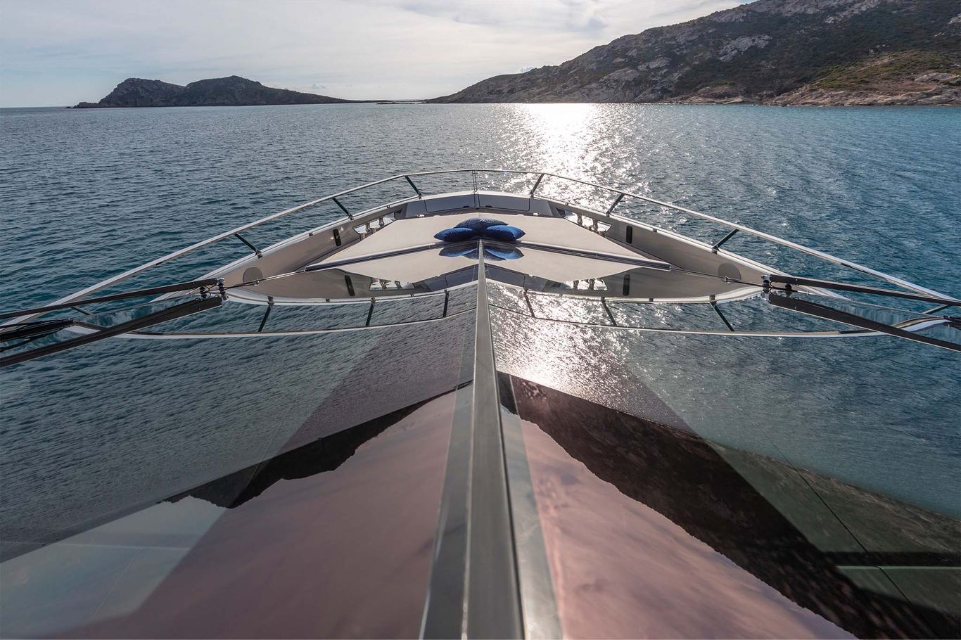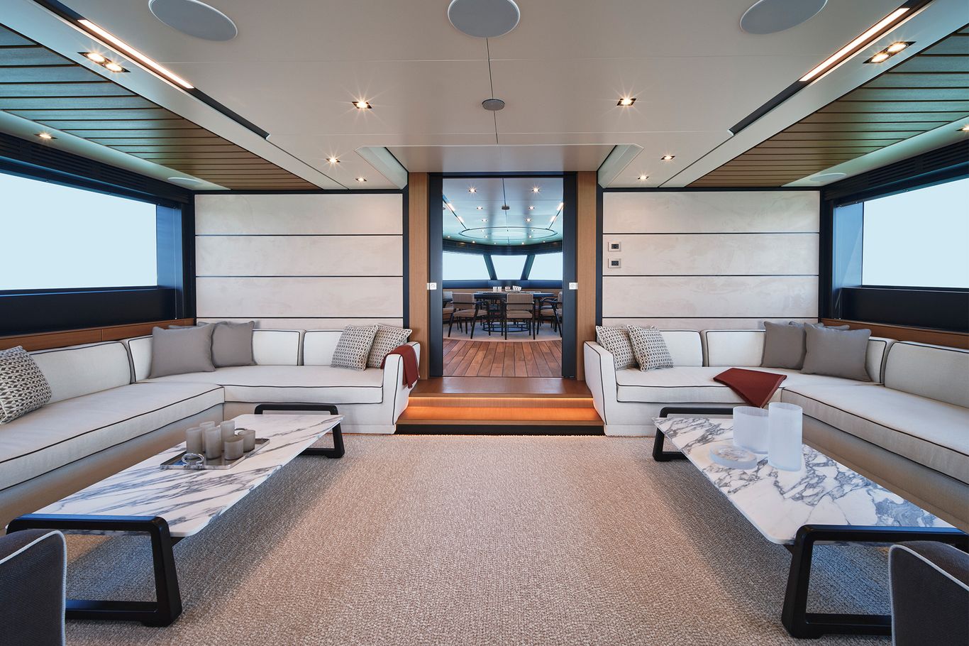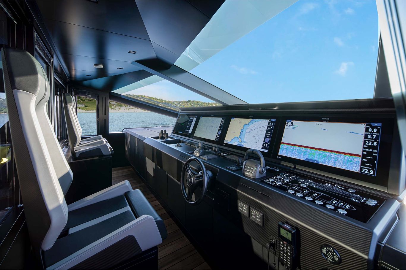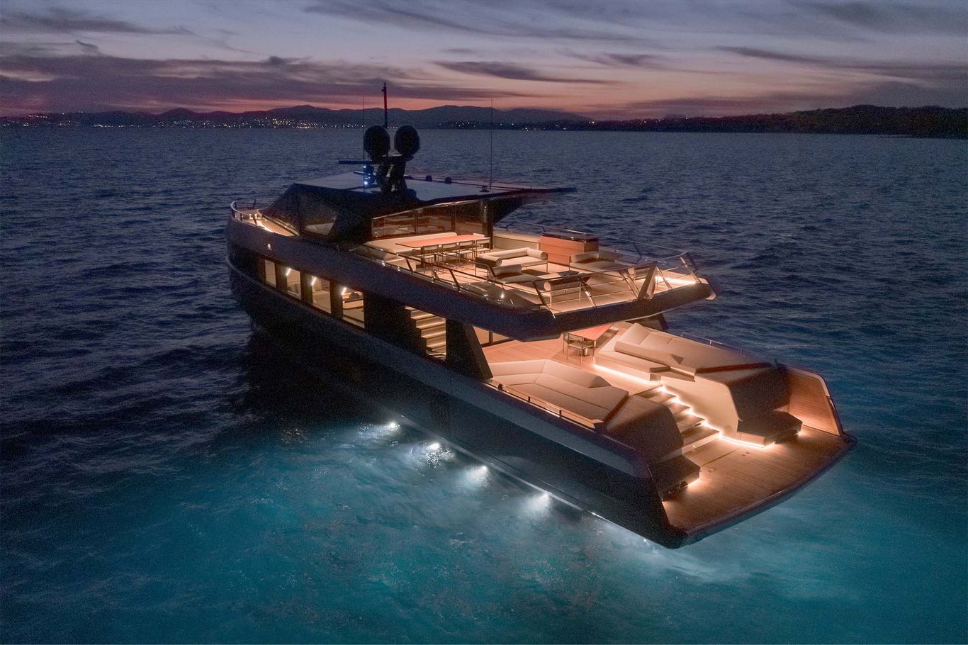 An enormous upper deck is presided over by Wally’s signature glass and carbon dome. And on the lower deck, there are a luxurious VIP suite and two dazzling guest cabins. An eye-catching carbon fibre staircase connects all the decks – laminated in a single piece to give structural support and eliminate bulkheads. This creates open entertaining spaces that blend seamlessly into the exterior.