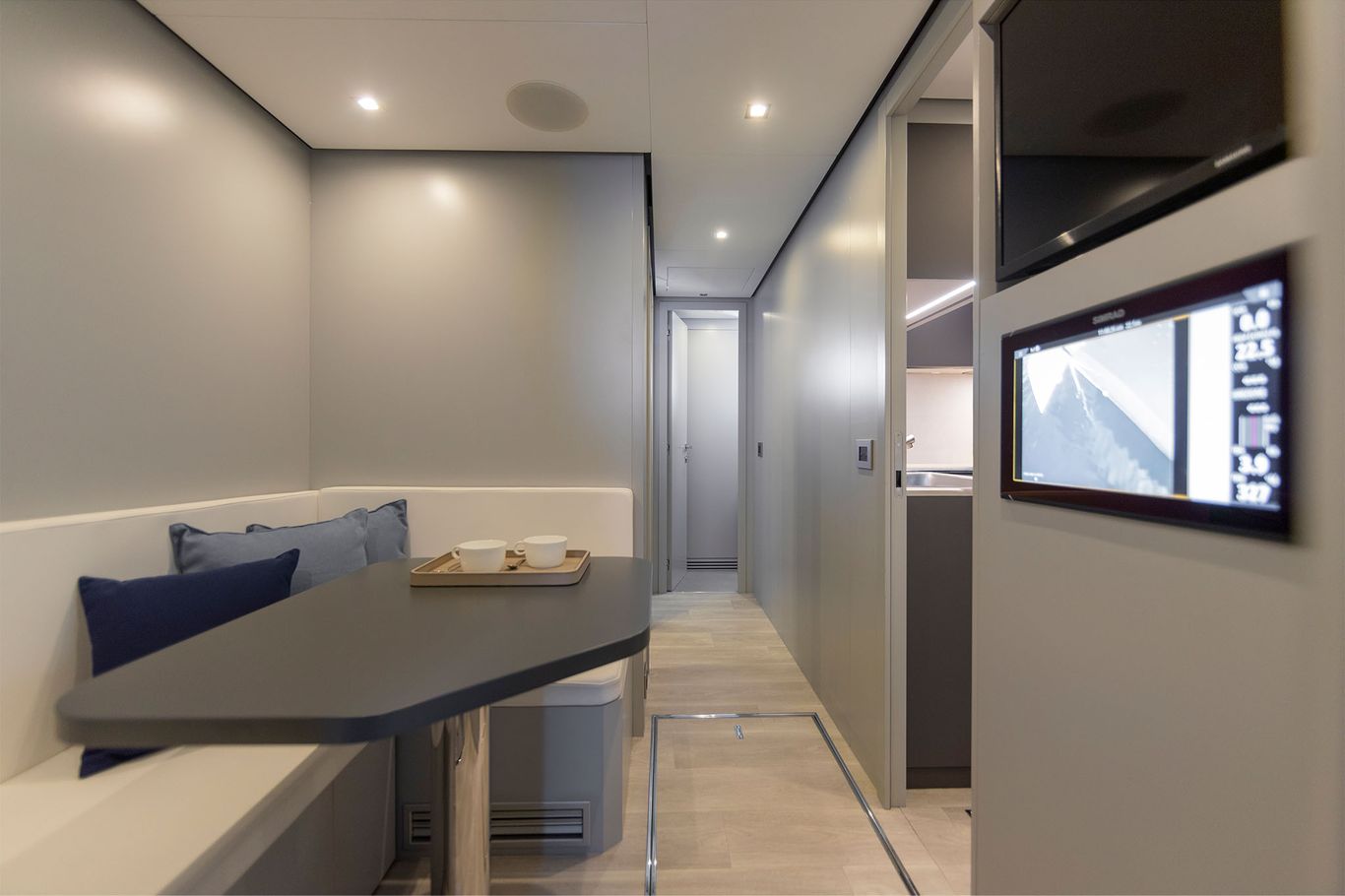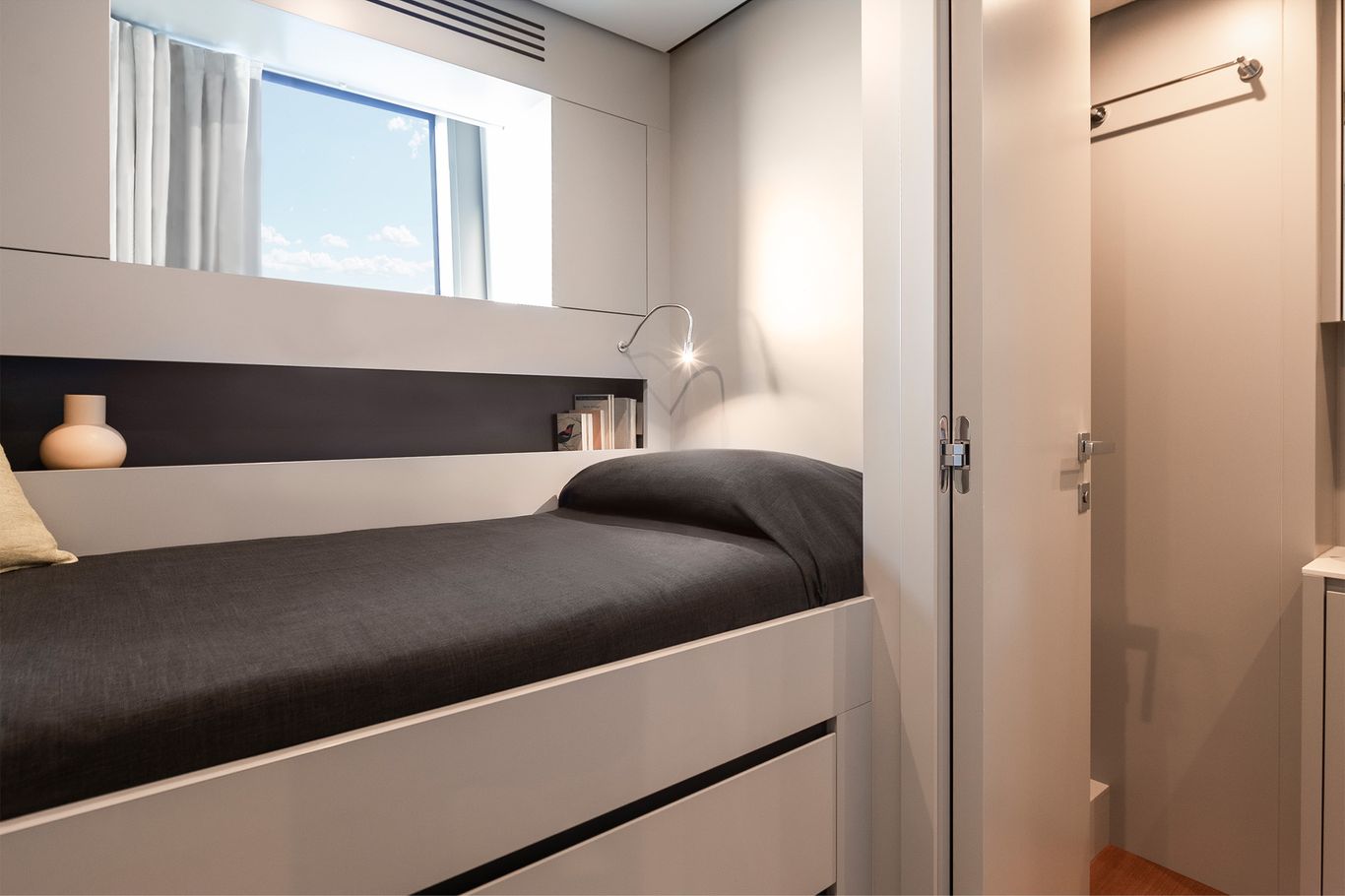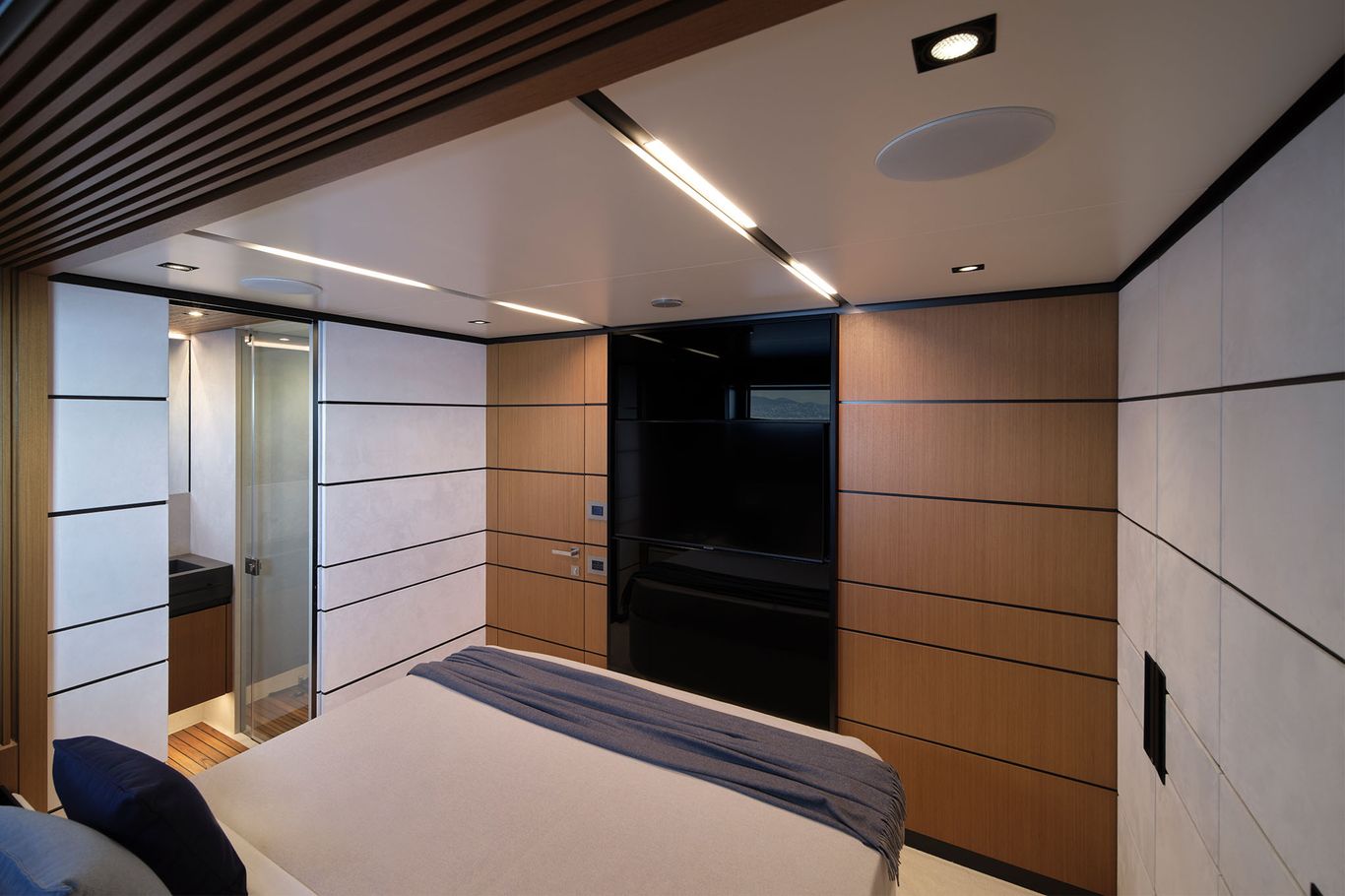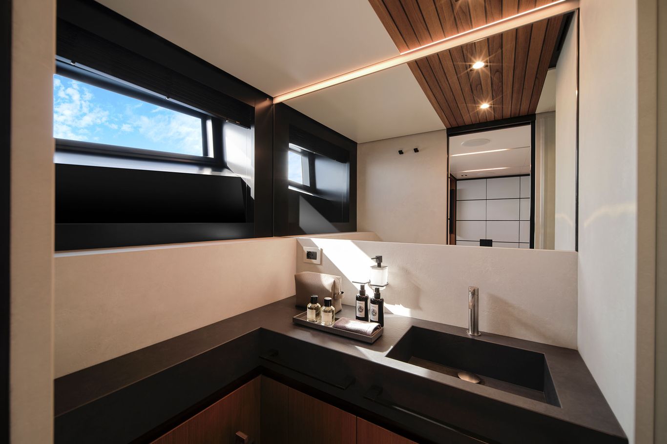 An enormous upper deck is presided over by Wally’s signature glass and carbon dome. And on the lower deck, there are a luxurious VIP suite and two dazzling guest cabins. An eye-catching carbon fibre staircase connects all the decks – laminated in a single piece to give structural support and eliminate bulkheads. This creates open entertaining spaces that blend seamlessly into the exterior.