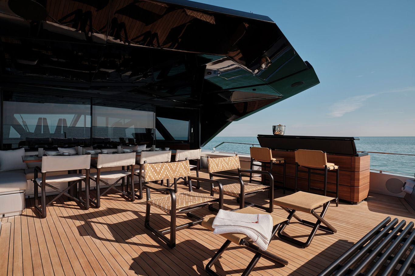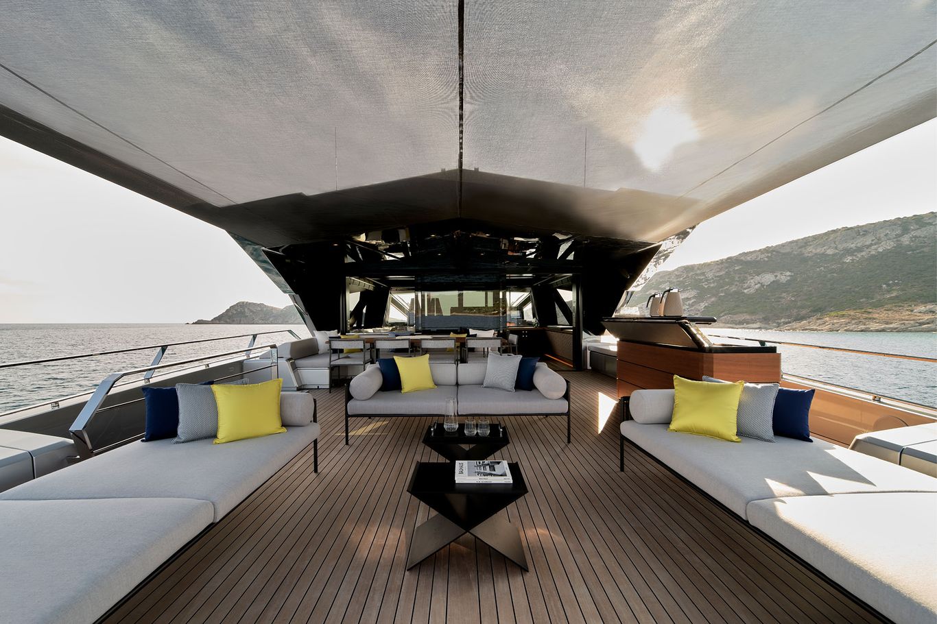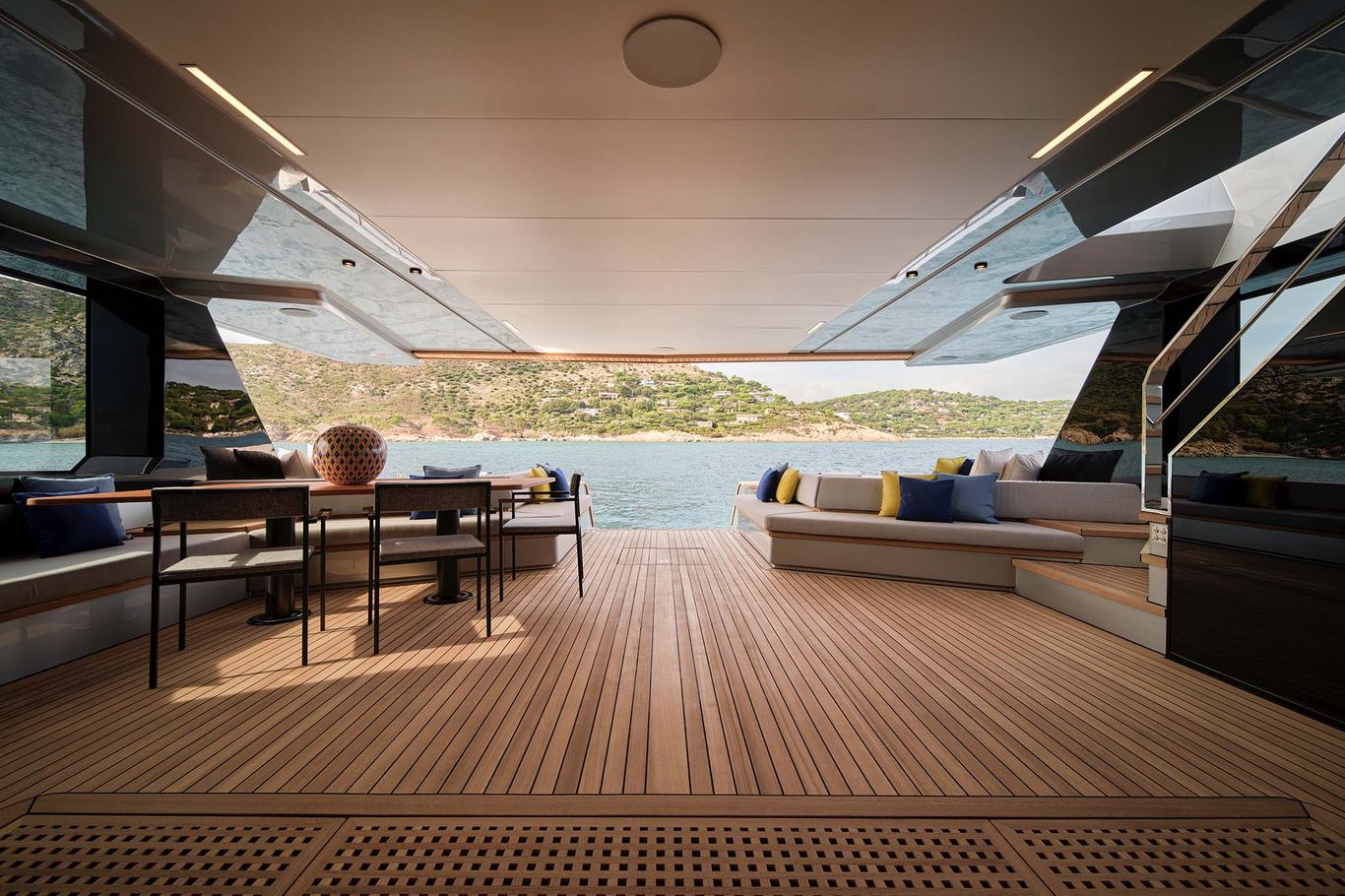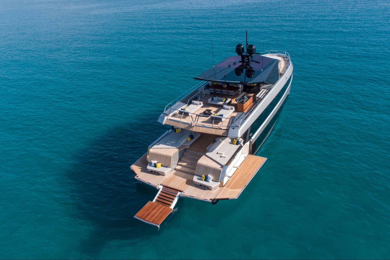 The design is breathtaking, with elegant teak decking and steps that cascade down to the beach club aft, which extends with wings at the side and a hydraulic bathing platform that doubles as a passerelle. A 4.15m tender and other toys are garaged invisibly behind the wings.