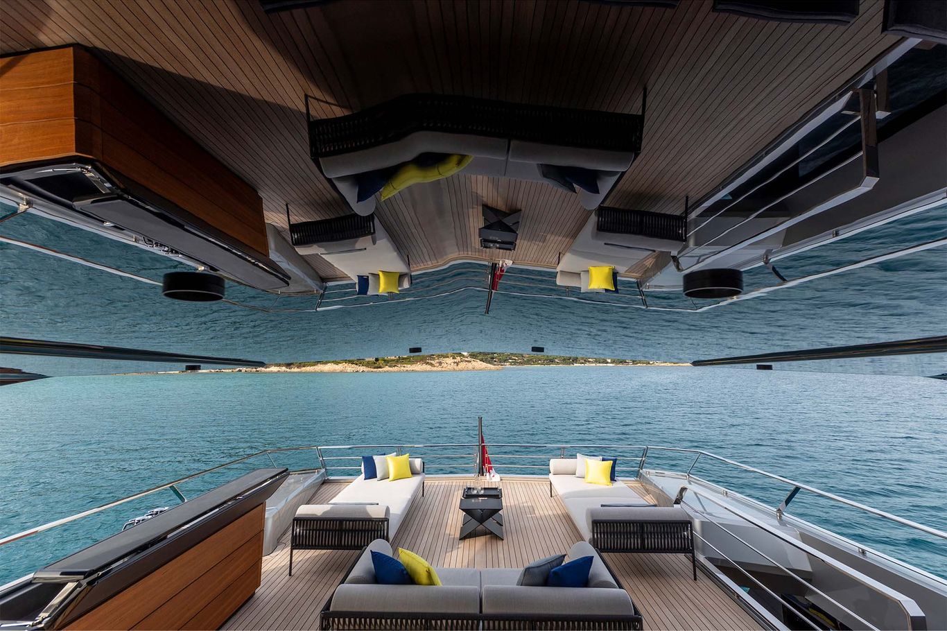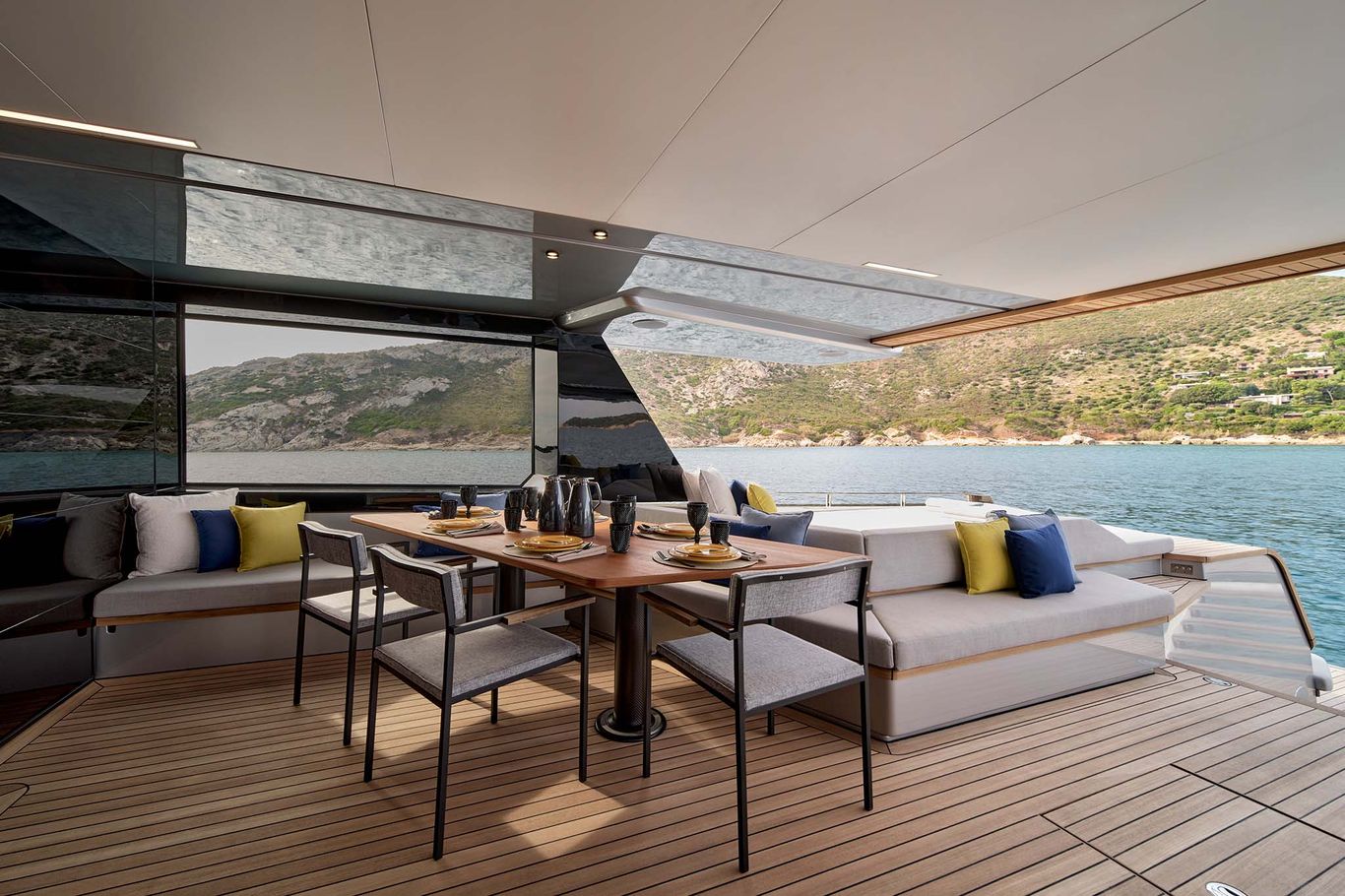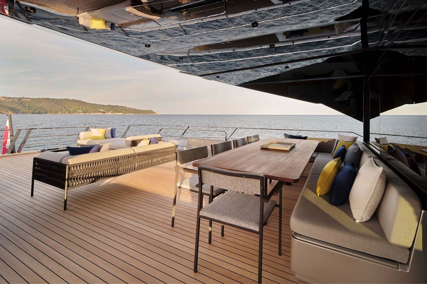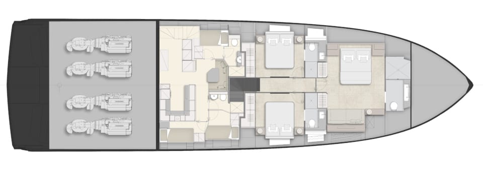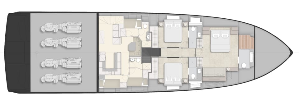 The design is breathtaking, with elegant teak decking and steps that cascade down to the beach club aft, which extends with wings at the side and a hydraulic bathing platform that doubles as a passerelle. A 4.15m tender and other toys are garaged invisibly behind the wings.