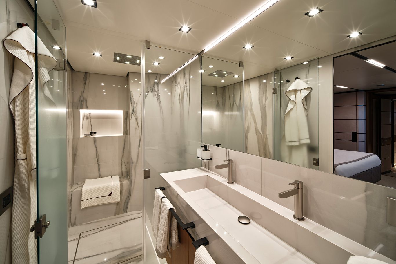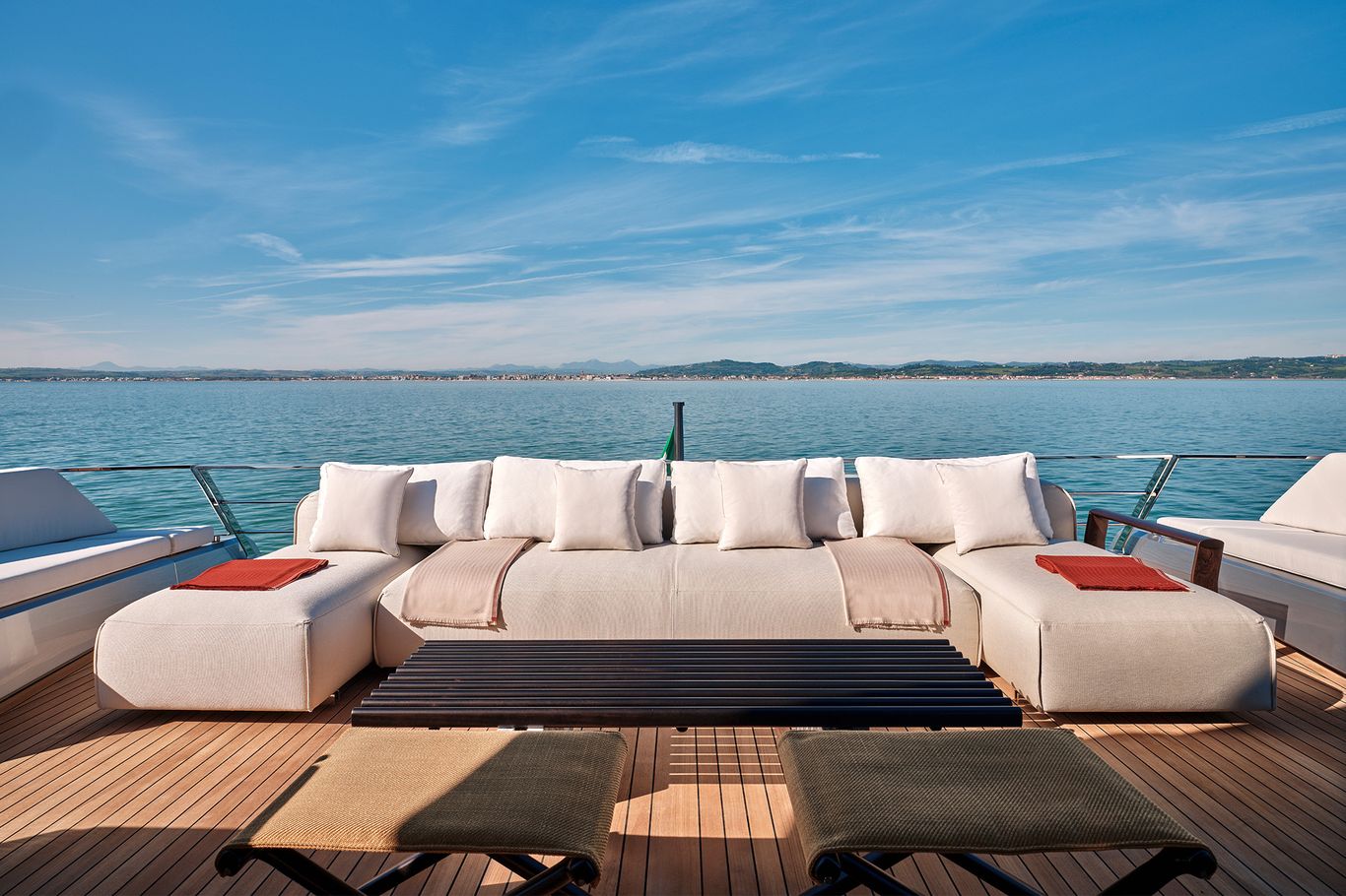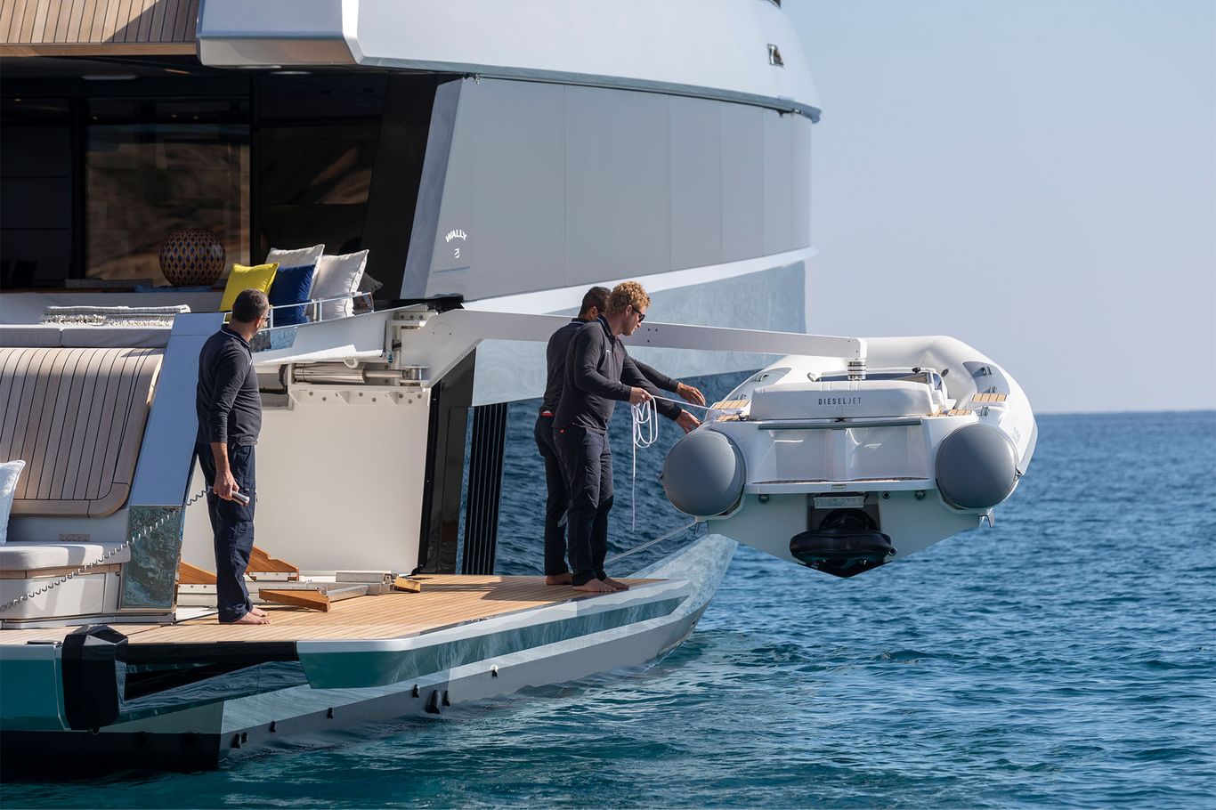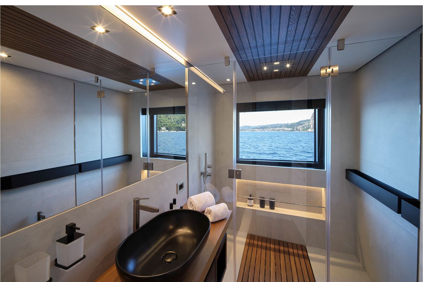 The design is breathtaking, with elegant teak decking and steps that cascade down to the beach club aft, which extends with wings at the side and a hydraulic bathing platform that doubles as a passerelle. A 4.15m tender and other toys are garaged invisibly behind the wings.