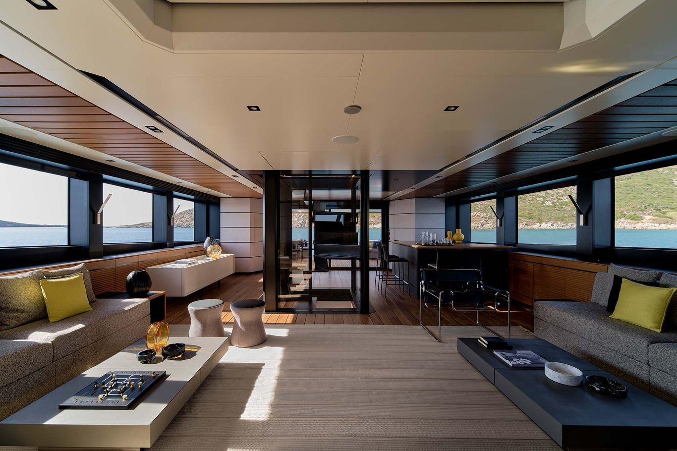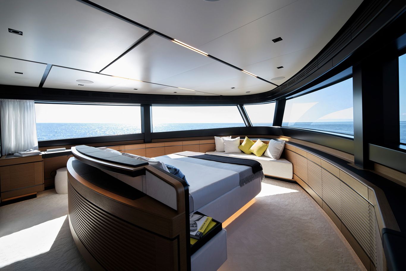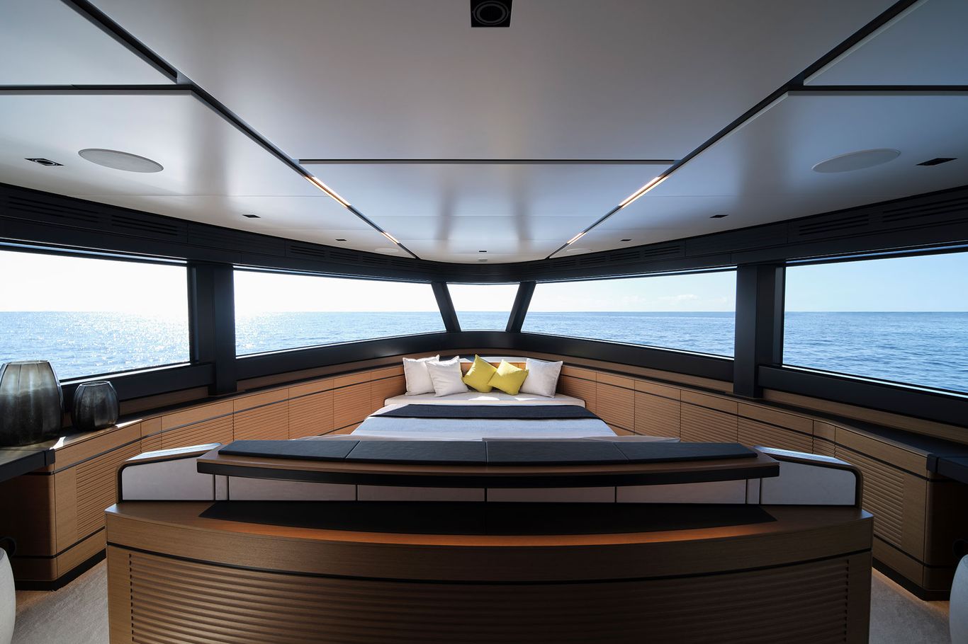 With its full-wide body, the signature of this futuristic space ship is the vast owner’s suite in the bow, which seems to hang over the water below. Wally has expertly engineered a strip of tall glass running all the way round the main deck, providing the cabin with a 270-degree panoramic views and astonishing natural light.