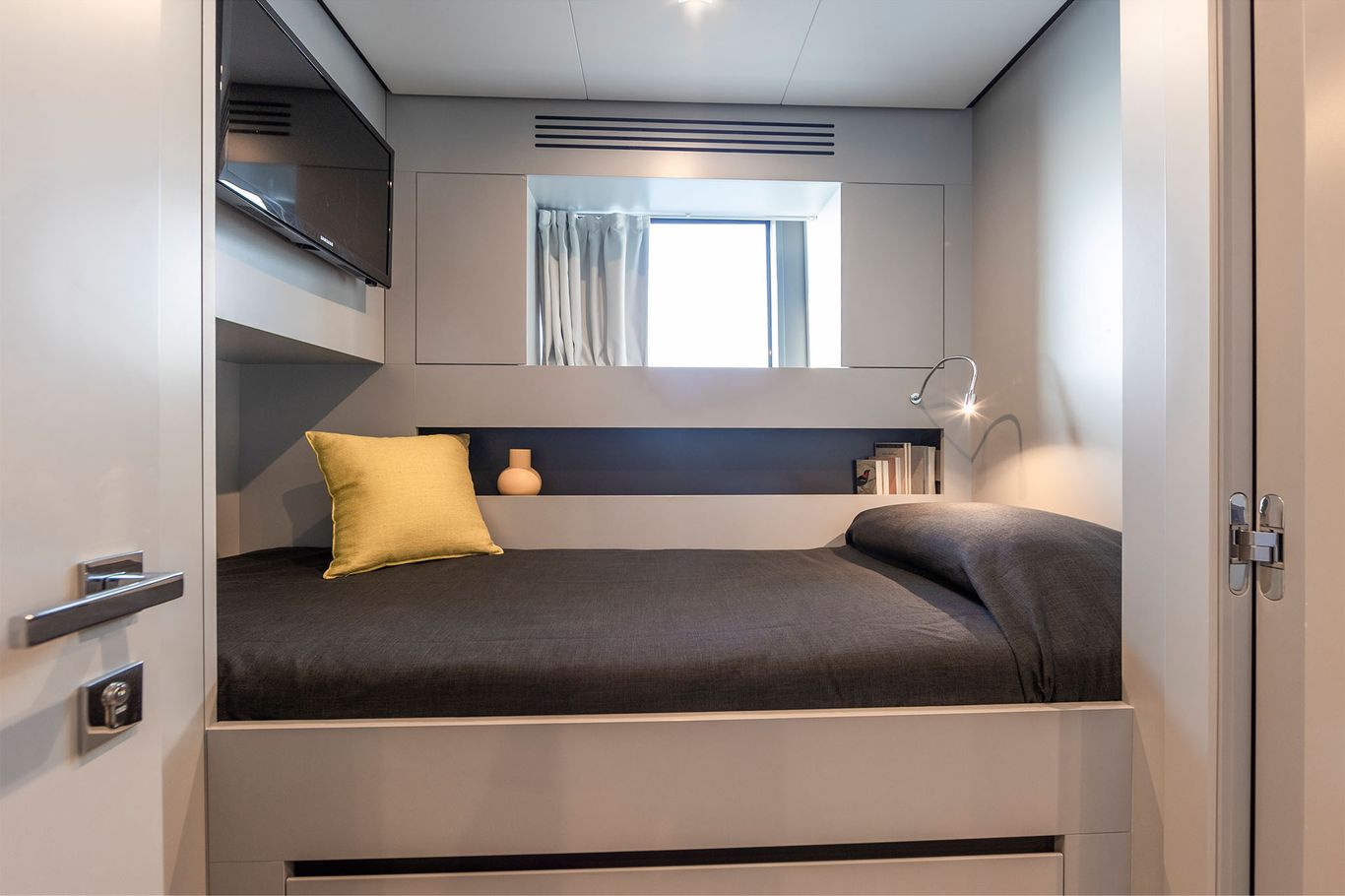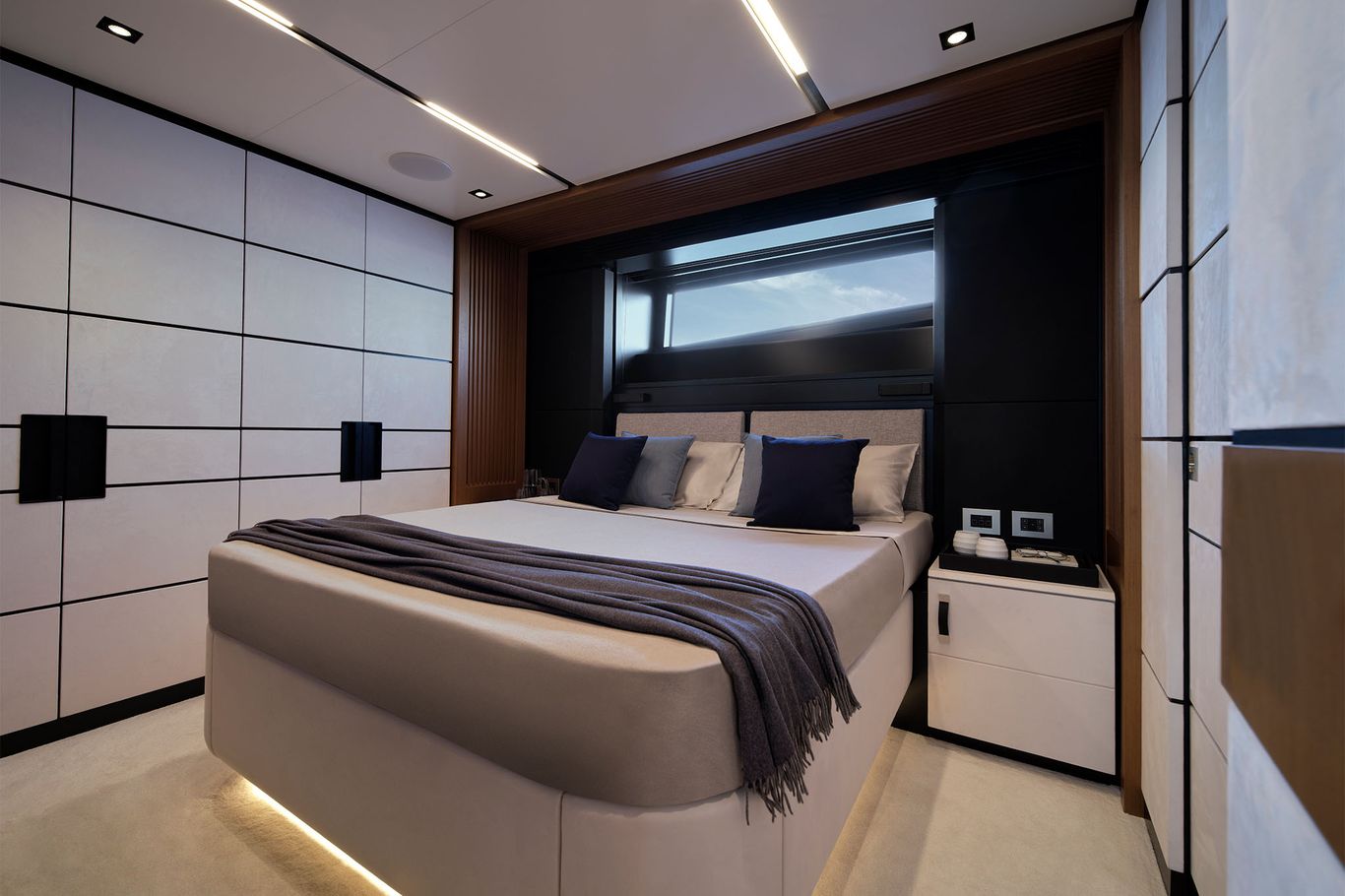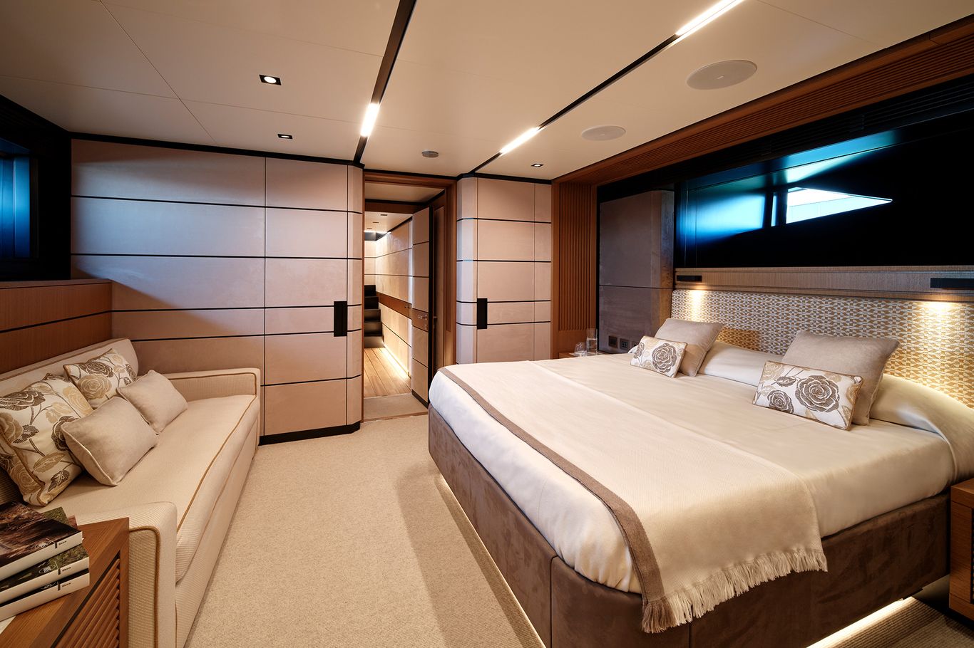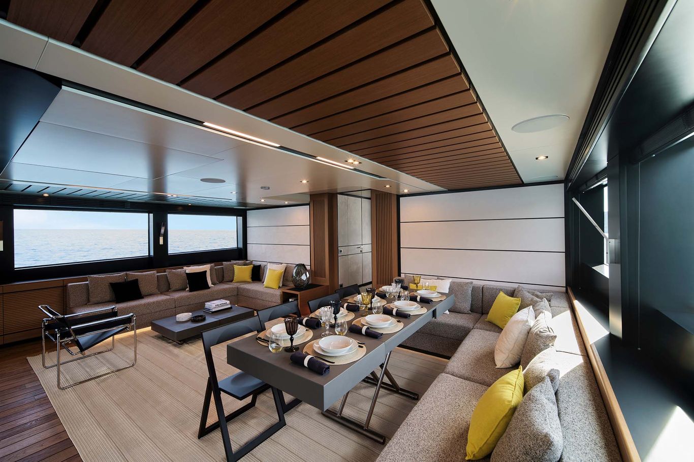 With its full-wide body, the signature of this futuristic space ship is the vast owner’s suite in the bow, which seems to hang over the water below. Wally has expertly engineered a strip of tall glass running all the way round the main deck, providing the cabin with a 270-degree panoramic views and astonishing natural light.