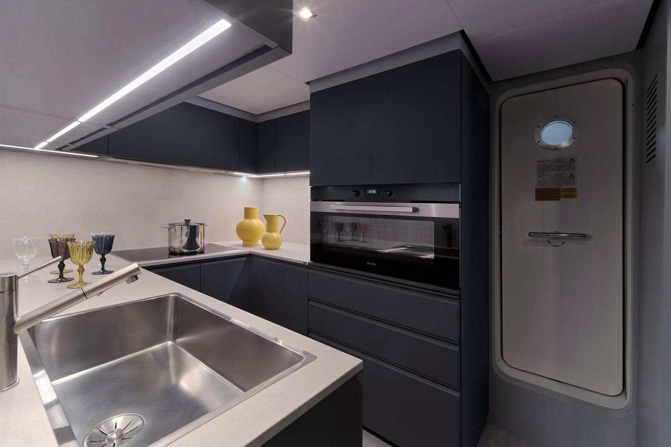 And yet, this high 4.7m bow is part of a hull form has been studied in minute detail to provide stability, eliminate slamming and still deliver semi-displacement performance. Renowned designer Laurent Giles developed the naval architecture specifically for this yacht, which was exhaustively tank-tested in Southampton. Combined with the Volvo IPS pod propulsion system, the wallywhy200 can cruise at 20 knots and hit 23 knots flat out with the optional enhanced power package.